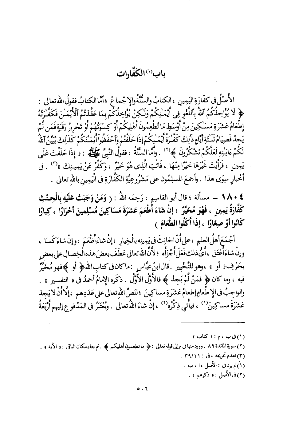 ١٨٠٤ - مسألة؛ قال أبو القاسِمِ، رَحِمَه اللَّهُ: (وَمَنْ وَجَبَتْ عَلَيْه بِالْحِنْثِ كَفَّارَةُ يَمينٍ، فَهُوَ مُخيَّرٌ؛ إِنْ شَاءَ أَطْعَمَ عَشَرَةَ مَسَاكِينَ مُسْلِمينَ أَحْرَارًا، كِبارًا كَانُوا أَوْ صِغارًا، إِذَا أَكَلُوا الطَّعَامَ)