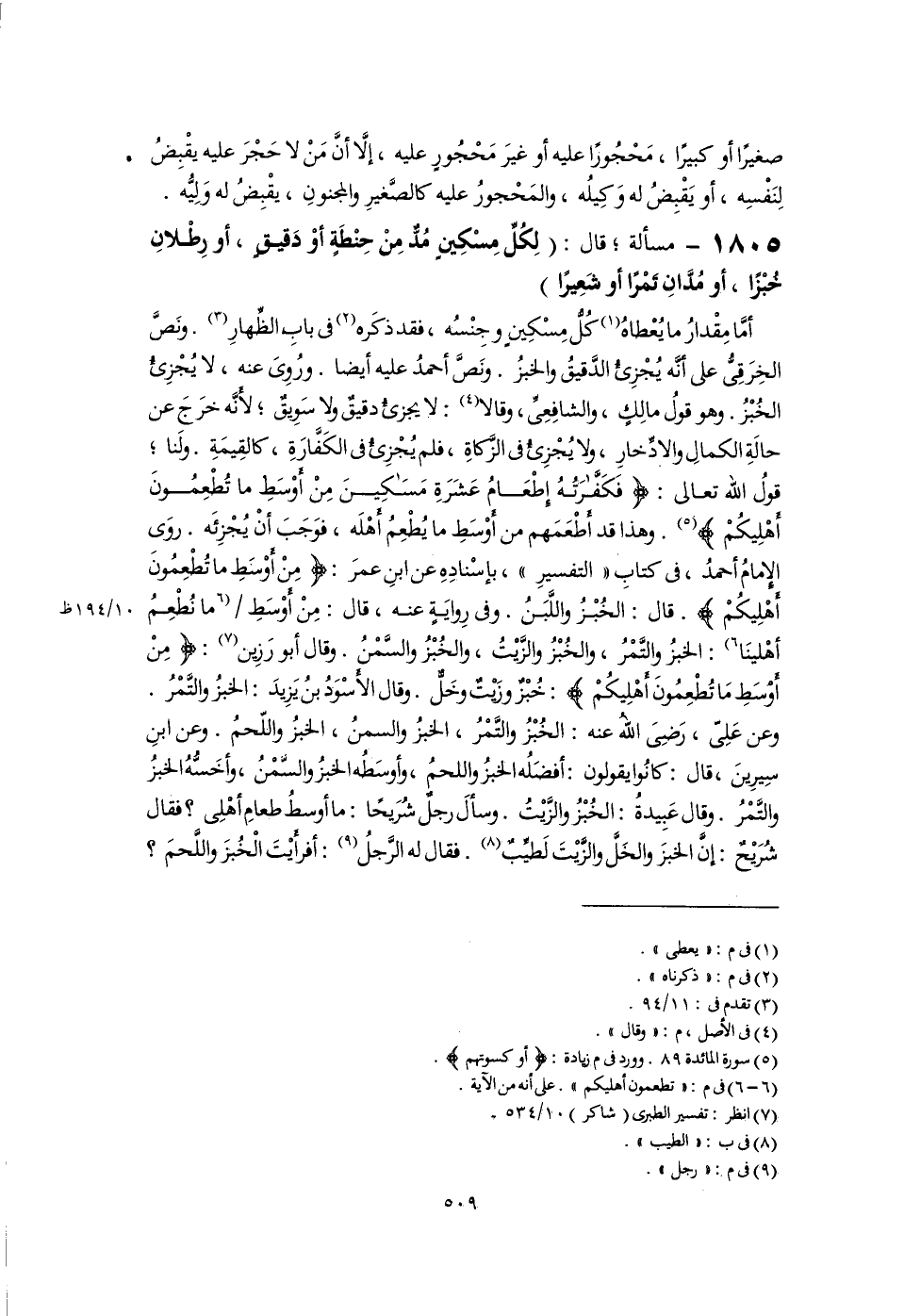 ١٨٠٥ - مسألة؛ قال: (لِكُلِّ مِسْكِينٍ مُدٌّ مِنْ حِنْطَةٍ أَوْ دَقيقٍ، أو رِطْلانِ خُبْزًا، أو مُدَّانِ تَمْرًا أو شَعِيرًا)