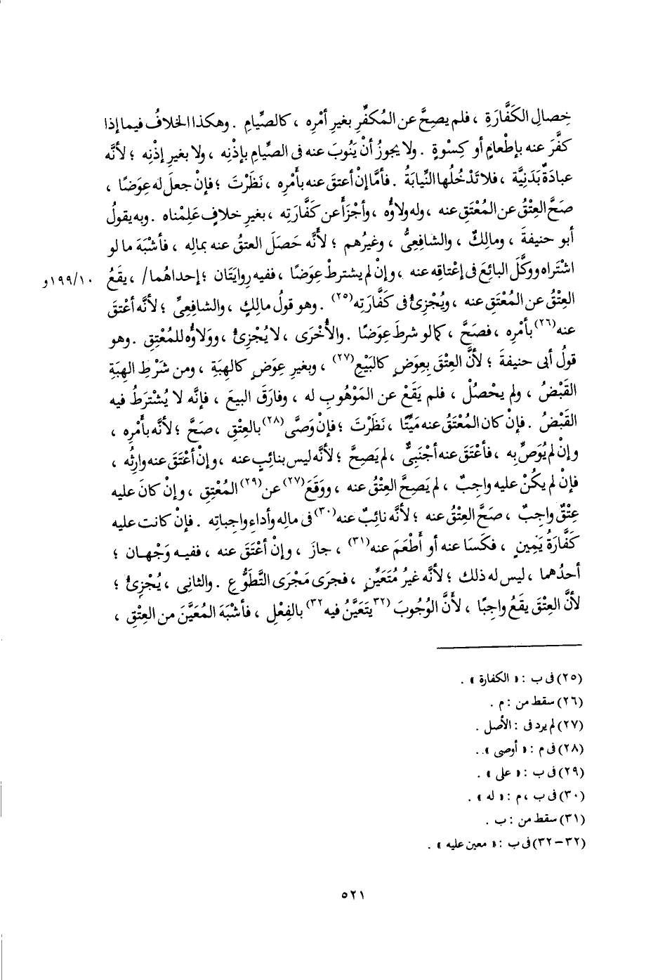 خِصالِ الكَفَّارَةِ، فلم يصِحَّ عن المُكفِّرِ بغيرِ أمْرِه، كالصِّيامِ. وهكذا الخلافُ فيما إذا كفَّرَ عنه بإطْعامٍ أو كِسْوةٍ. ولا يجوزُ أَنْ يَنُوبَ عنه فى الصِّيامِ بإذْنِه، ولا بغيرِ إذْنِه؛ لأنَّه عبادَةُ بَدَنِيَّة، فلا تَدْخُلُها النِّيابَةُ. فأمَّا إِنْ أعتقَ عنه بأَمْرِه، نَظَرْتَ؛ فإنْ جعلَ له عِوَضًا، صَحَّ العِتْقُ عن المُعْتَقِ عنه، وله ولاؤُه، وأجْزأَ عن كَفَّارَتِه، بغيرِ خلافٍ عَلِمْناه. وبه يقولُ أبو حنيفةَ، ومالِكٌ، والشافِعِىُّ، وغيرُهم؛ لأنَّه حَصَلَ العتقُ عنه بمالِه، فأشْبَهَ ما لو اشْتَراه وكَّلَ البائِعَ فى إعْتاقِه عنه، وإِنْ لم يشترطْ عِوَضًا، ففيه رِوايَتَان؛ إحداهُما، يقَعُ العِتْقُ عن المُعْتَقِ عنه، ويُجْزِئُ فى كَفَّارَتِه (٢٥). وهو قولُ مالِكٍ، والشافِعِىِّ؛ لأنَّه أعْتقَ عنه (٢٦) بأمْرِه، فصَحَّ، كما لو شرطَ عِوَضًا. والأُخْرَى، لا يُجْزِئُ، ووَلاؤُه للمُعْتِقِ. وهو قولُ أبى حنيفةَ؛ لأنَّ العِتْقَ بِعِوَضٍ كالبَيْعِ (٢٧)، وبغيرِ عِوَضٍ كالهِبَةِ، ومن شَرْط الهِبَةِ القَبْضُ، ولم يحْصُلْ، فلم يَقَعْ عن المَوْهُوبِ له، وفارَقَ البيعَ، فإنَّه لا يُشْترَطُ فيه القَبْضُ. فإنْ كان المُعْتَقُ عنه مَيِّتًا، نَظَرْتَ؛ فإنْ وَصَّى (٢٨) بالعِتْقِ، صَحَّ؛ لأنَّه بأَمْرِه، وإِنْ لم يُوَصِّ بِه، فأعْتَقَ عنه أجْنَبِىٌّ، لم يَصِحَّ؛ لأنَّه ليس بنائِبٍ عنه، وإِنْ أعْتَقَ عنه وأرِثُه، فإنْ لم يكُنْ عليه واجِبٌ، لم يَصِحَّ العِتْقُ عنه، ووَقَعَ (٢٧) عن (٢٩) المُعْتِقِ، وإِنْ كانَ عليه عِتْقٌ واجِبٌ، صَحَّ العِتْقُ عنه؛ لأنَّه نائِبٌ عنه (٣٠) فى مالِه وأداءِ واجِباتِه. فإنْ كانت عليه كَفَّارَةُ يَمينٍ، فكَسَا عنه أو أَطعَمَ عنه (٣١)، جازَ، وإِنْ أعْتَقَ عنه، ففيه وَجْهان؛ أحدُهما، ليس له ذلك؛ لأنَّه غيرُ مُتَعَيِّنٍ، فجرَى مَجْرَى التَّطَوُّعِ. والثانِى، يُجْزِئُ، لأنَّ العِتْقَ يقَعُ واجِبًا، لأنَّ الوُجُوبَ [يتَعَيَّنُ فيه] (٣٢) بالفِعْلِ، فأشْبَهَ المُعَيَّنَ من العِتْقِ،