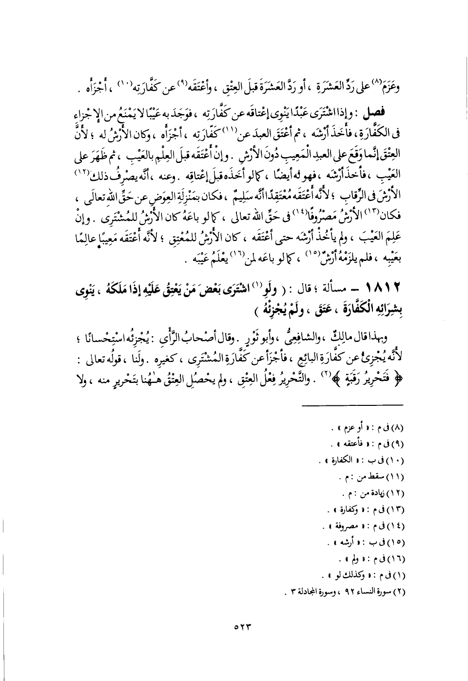 فصل: وإذا اشْتَرَى عَبْدًا يَنْوِى إعْتاقَه عن كَفَّارَتِه، فوَجَدَ به عَيْبًا لا يَمْنَع من الإِجْزاءِ فى الكَفَّارَةِ، فأَخَذَ أرْشَه، ثم أعْتَقَ العبدَ عن (١١) كَفّارَتِه، أَجْزَأَه، وكان الأَرْشُ له؛ لأَنَّ العِتْقَ إنَّما وَقَعَ على العبدِ الْمَعِيبِ دُونَ الأَرْشِ. وإِنْ أَعْتَقَه قبلَ العِلْمِ بالعَيْبِ، ثم ظَهَرَ على العَيْبِ، فأَخذَ أَرْشَه، فهو له أيضًا، كما لو أخَذَه قبلَ إعْتاقِه. وعنه، أنَّه يصْرِفُ ذلك (١٢) الأَرْشَ فى الرِّقابِ؛ لأنَّه أعْتَقَه مُعْتَقِدًا أنَّه سَلِيمٌ، فكان بمَنْزِلَةِ العِوَض عن حَقِّ اللَّهِ تعالَى، فكان (١٣) الأَرْشُ مَصْرُوفًا (١٤) فى حَقِّ اللَّه تعالى، كما لو باعَهُ كان الأَرْشُ للمُشْتَرِى. وإِنْ عَلِمَ العَيْبَ، ولم يأْخُذْ أرْشَه حتى أعْتَقَه، كان الأَرْشُ للمُعْتِقِ؛ لأنَّه أَعْتَقَه مَعِيبًا عالِمًا بعَيْبِه، فلم يلزَمْهُ أَرْشٌ (١٥)، كما لو باعَه لمن (١٦) يعْلَمُ عَيْبَه.
