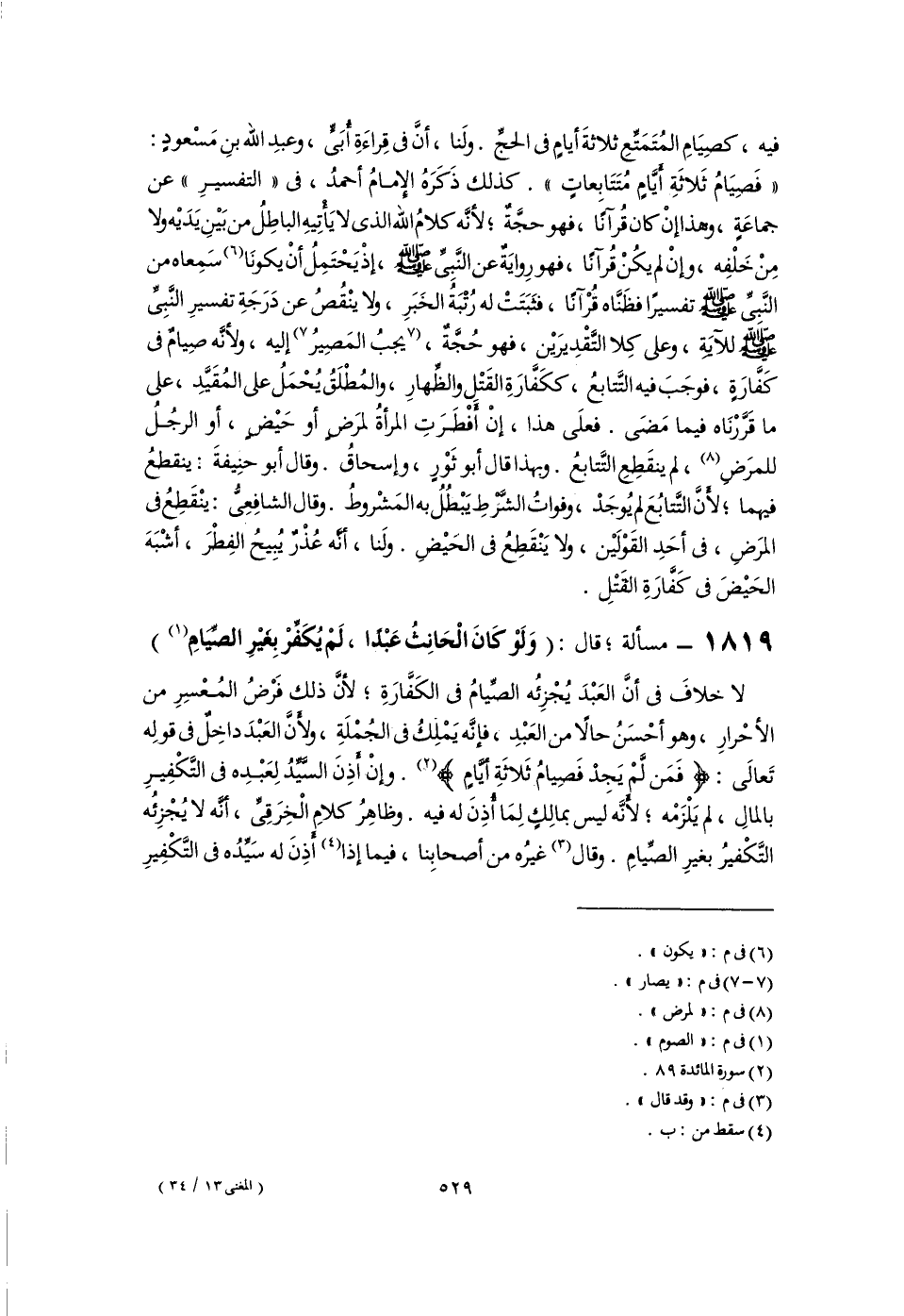 فيه، كصِيَامِ المُتَمَتِّعِ ثلاثةَ أيامٍ فى الحجِّ. ولَنا، أَنَّ فى قِراءَةِ أُبَىٍّ، وعبدِ اللَّه بنِ مَسْعودٍ: "فَصِيَامُ ثَلاثَةِ أيَّامٍ مُتَتَابِعاتٍ". كذلك ذَكَرَهُ الإِمامُ أحمدُ، فى "التفسيرِ" عن جماعَةٍ، وهذا إِنْ كان قُرآنًا، فهو حجَّةٌ؛ لأنَّه كلامُ اللَّه الذى لا يَأتِيهِ الباطِلُ من بَيْنِ يَدَيْه ولا مِنْ خَلْفِه، وإِنْ لم يكُنْ قُرَآنًا، فهو رِوايَةٌ عن النَّبِىِّ -صلى اللَّه عليه وسلم-، إذْ يَحْتَمِلُ أَنْ يكونَا (٦) سَمِعاه من النَّبِىِّ -صلى اللَّه عليه وسلم- تفسيرًا فظنَّاه قُرآنًا، فثَبَتَتْ له رُتْبَةُ الخَبَرِ، ولا ينْقُصُ عن دَرَجَةِ تفسيرِ النَّبِىِّ -صلى اللَّه عليه وسلم- للآيَةِ، وعلى كِلا التَّقْدِيرَيْن، فهو حُجَّةٌ، [يجبُ المَصِيرُ] (٧) إليه، ولأنَّه صِيامٌ فى كَفَّارَةٍ، فوجَبَ فيه التَّتابعُ، ككَفَّارَةِ القَتْل والظِّهارِ، والمُطْلَقُ يُحْمَلُ على المُقَيَّدِ، على ما قَرَّرْنَاه فيما مَضَى. فعلَى هذا، إِنْ افطَرَتِ المرأةُ لمرَضٍ أو حَيْضٍ، أو الرجُلُ للمرَضِ (٨)، لم ينقَطِعِ التَّتابعُ. وبهذا قال أبو ثَوْرٍ، وإسحاقُ. وقال أبو حنِيفةَ: ينقطعُ فيهما؛ لأنَّ التَّتابُعَ لم يُوجَدْ، وفواتُ الشَّرْطِ يَبْطُلُ به المَشْروطُ. وقال الشافِعِىُّ: ينْقَطِعُ فى المرَضِ، فى أحَدِ القَوْلَيْن، ولا يَنْقَطِعُ فى الحَيْضِ. ولَنا، أنَّه عُذْرٌ يُبِيحُ الفِطْرَ، أشْبَهَ الحَيْضَ فى كَفَّارَةِ القَتْلِ.