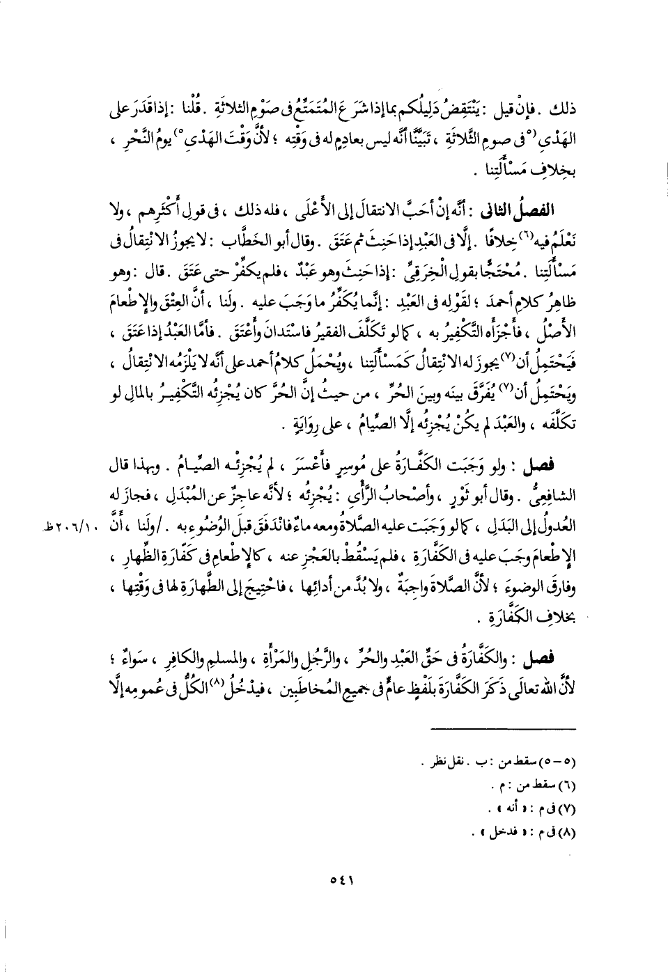 الفصلُ الثانى: أنَّه إِنْ أحَبَّ الانتقالَ إلى الأَعْلَى، فله ذلك، فى قولِ أَكثَرِهم، ولا نَعْلَمُ فيه (٦) خِلافًا. إِلَّا فى العَبْدِ إذا حَنِثَ ثم عَتَقَ. وقال أبو الخَطَّاب: لا يجوزُ الانْتِقالُ فى مَسْألَتِنا. مُحْتَجًّا بقولِ الْخِرَقِىِّ: إذا حَنِثَ وهو عَبْدٌ، فلم يكفِّرْ حتى عَتَقَ. قال: وهو ظاهِرُ كلامِ أحمدَ؛ لقَوْلِه فى العَبْدِ: إنَّما يُكَفِّرُ ما وَجَبَ عليه. ولَنا، أَنَّ العِتْقَ والإِطْعامَ الأَصْلُ، فأَجْزَأَه التَّكْفِيرُ به، كما لو تَكَلَّفَ الفقيرُ فاسْتَدانَ وأَعْتَقَ. فأمَّا العَبْدُ إذا عَتَقَ، فَيَحْتَمِلُ أن (٧) يجوزَ له الانْتِقالُ كَمَسْأَلَتِنا، ويُحْمَلُ كلامُ أحمد على أنَّه لا يَلْزَمُه الانْتِقالُ، ويَحْتَمِلُ أن (٧) يُفَرَّقَ بينَه وبينَ الحُرِّ، من حيثُ إِنَّ الحُرَّ كان يُجْزِئُه التَّكْفِيرُ بالمالِ لو تكَلَّفَه، والعَبْدَ لم يكُنْ يُجْزِئُه إِلَّا الصِّيامُ، على رِوَايَةٍ.