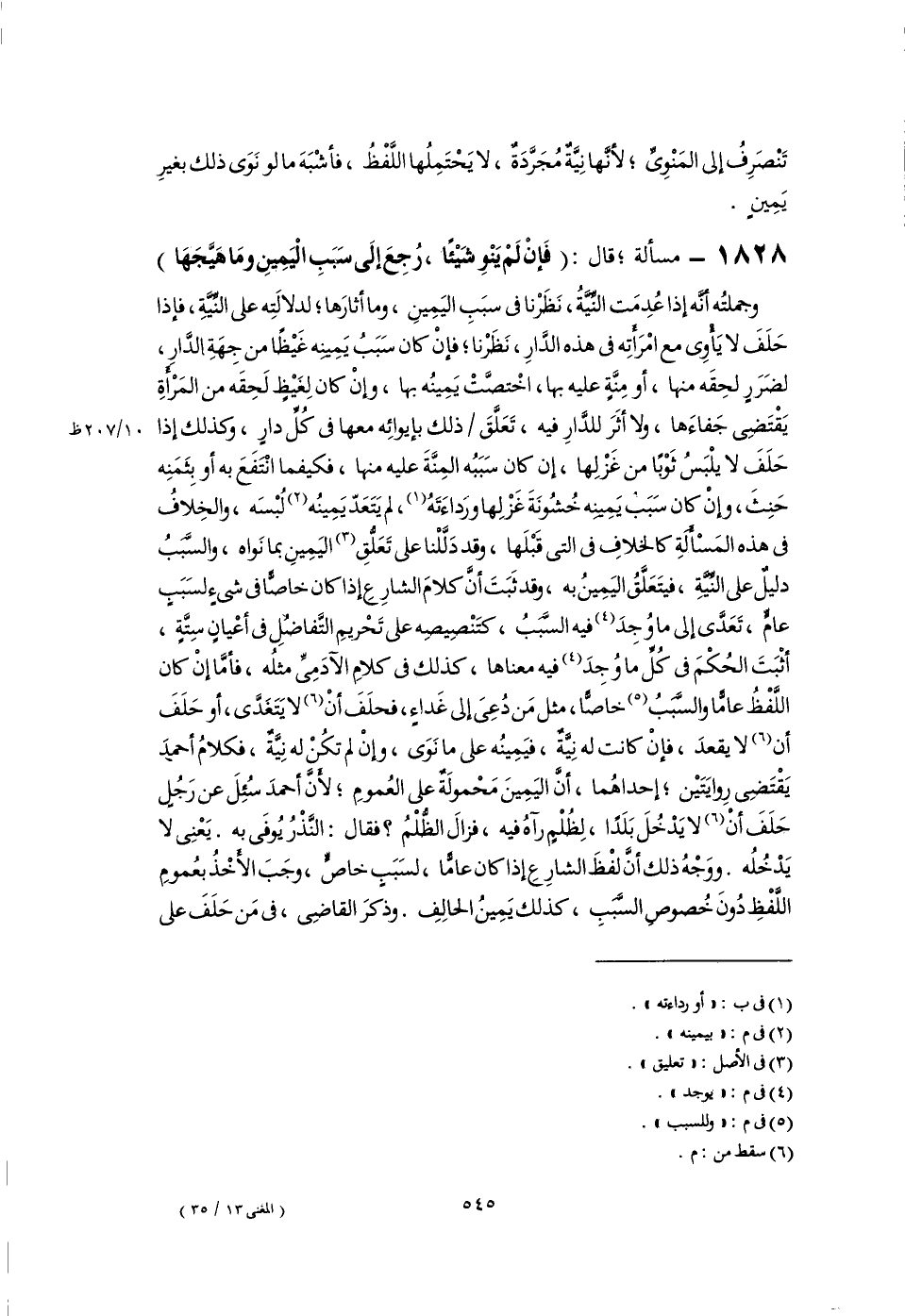 وجملتُه أنَّه إذا عُدِمَت النِّيَّةُ، نَظَرْنا فى سبَبِ اليَمِينِ، وما أثارَها؛ لدلالَتِه على النِّيَّةِ، فإذا حَلَفَ لا يَأْوِى مع امْرَأَتِه فى هذه الدَّارِ، نَظَرْنا؛ فإنْ كان سَبَبُ يَمِينِه غَيْظًا من جِهَةِ الدَّارِ، لضَرَرٍ لحِقَه منها، أو مِنَّةٍ عليه بها، اخْتصَّتْ يَمِينُه بها، وإِنْ كان لِغَيْظٍ لَحِقَه من المَرْأَةِ يَقْتَضِى جَفاءَها، ولا أثَرَ للدَّارِ فيه، تَعَلَّقَ ذلك بإيوائِه معها فى كُلِّ دارٍ، وكذلك إذا حَلَفَ لا يلْبَسُ ثَوْبًا من غَزْلِها، إن كان سَبَبُه المِنَّةَ عليه منها، فكيفما انْتَفَعَ به أو بِثَمَنِه حَنِثَ، وإِنْ كان سَبَب يَمِينِه خُشُونَةَ غَزْلِها ورَداءَتَهُ (١)، لم يَتَعَدّ يَمِينُه (٢) لُبْسَه، والخِلافُ فى هذه المَسْأَلَةِ كالخلافِ فى التى قَبْلَها، وقد دَلَّلْنا على تَعَلُّقِ (٣) اليَمِينِ بما نَواه، والسَّبَبَ دليلٌ على النِّيَّةِ، فيتَعَلَّقُ اليَمِينُ به، وقد ثَبَتَ أَنَّ كلامَ الشارِعِ إذا كان خاصًّا فى شىءٍ لسَبَبٍ عامٍّ، تَعَدَّى إلى ما وُجِدَ (٤) فيه السَّبَبَ، كتَنْصِيصِه على تَحْريمِ التَّفاضُلِ فى أعْيانٍ سِتَّةٍ، أثْبَتَ الحُكْمَ فى كُلِّ ما وُجِدَ (٤) فيه معناها، كذلك فى كلامِ الآدَمِىِّ مثلُه، فأمَّا إِنْ كان اللَّفْظُ عامًّا والسَّبَبُ (٥) خاصًّا، مثل مَن دُعِىَ إلى غَدإءٍ، فحلَفَ أَنْ (٦) لا يَتَغَدَّى، أو حَلَفَ أنْ (٦) لا يقعدَ، فإنْ كانت له نِيَّةٌ، فيَمِينُه على ما نَوَى، وإِنْ لم تكُنْ له نِيَّةٌ، فكلامُ أحمدَ يَقْتَضِى رِوايَتَيْن؛ إحداهُما، أَنَّ اليَمِينَ مَحْمولَةٌ على العُمومِ؛ لأَنَّ أحمدَ سُئِلَ عن رَجُلٍ حَلَفَ أَنْ (٦) لا يَدْخُلَ بَلَدًا، لِظُلْمٍ راهُ فيه، فزالَ الظُّلْمُ؟ فقال: النَّذْرُ يُوفَى به. يَعْنِى لا يَدْخُلُه. ووَجْهُ ذلك أَنَّ لفْظَ الشارِعِ إذا كان عامًّا، لسَبَبٍ خاصٍّ، وجَبَ الأَخْذُ بعُمومِ اللَّفْظِ دُونَ خُصوصِ السَّبَبِ، كذلك يَمِينُ الحالِفِ. وذكرَ القاضِى، فى مَن حَلَفَ على