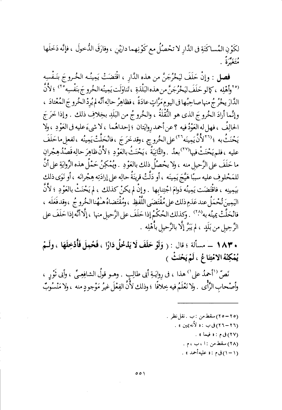 فصل: وإِنْ حَلَفَ ليَخْرُجَنَّ من هذه الدَّارِ، اقْتَضَتْ يَمِينُه الخُروجَ بنَفْسِه [وأهْلِه، كما لو حَلَفَ ليَخْرُجَنَّ من هذه البَلْدَةِ، تَناوَلَت يَمِينُه الخُروجَ بنَفْسِه] (٢٥)؛ لأَنَّ الدَّارَ يخْرُجُ منها صاحِبُها فى اليومِ مَرَّاتٍ عادَةً، فظاهِرُ حالِه إنَّه لم يُرِدْ الخُروجَ المُعْتادَ، وإنَما أرادَ الخُروجَ الذى هو النُّقْلَةُ، والخُروجُ من البَلَدِ بخِلافِ ذلك. وإذا خَرَجَ الحالِفُ، فهل له العَوْدُ فيه؟ عن أحمد رِوايَتان؛ إحداهُما، لا شىءَ عليه فى العَوْدِ، ولا يَحْنَثُ به؛ [لأَنَّ يَمِينَه] (٢٦) على الخُروجِ، وقد خَرَجَ، فانْحَلَّتْ يَمِينُه، لفعلِ ما حَلَفَ عليه، فلم يَحْنَثْ فيها (٢٧) بعدُ. والثَّانِيَةُ، يَحْنَثُ بالعَوْدِ؛ لان ظاهِرَ حالِه قَصْدُ هِجْرانِ ما حَلَفَ على الرَّحيلِ منه، ولا يحْصُلُ ذلك بالعَوْدِ. ويُمْكِنُ حَمْلُ هذه الرِّوايَةِ على أَنَّ للمَحْلوفِ عليه سببًا هَيَّجَ يَمِينَه، أو دَلَّتْ قرينَةُ حالِه على إرادَتِه هِجْرانَه، أو نَوَى ذلك بيَمينِه، فاقْتَضَت يَمِينُه دَوامَ اجْتِنابِها. وإِنْ لم يكنْ كذلك، لم يَحْنَثْ بالعَوْدِ؛ لأَنَّ اليَمِينَ تُحْمَلُ عند عَدَمِ ذلك على مُقْتَضَى اللَّفْظِ، ومُقْتَضاهُ ههُنا الخُروجُ، وقد فَعَلَه، فانْحَلَّتْ يمينُه به (٢٨). وكذلك الحُكْم إذا حَلَفَ على الرَّحيلِ منها، إِلَّا أنَّه إذا حَلَفَ على الرَّحِيلِ من بَلَدٍ، لم يَبَرَّ إِلَّا بالرَّحيلِ بأهْلِه.