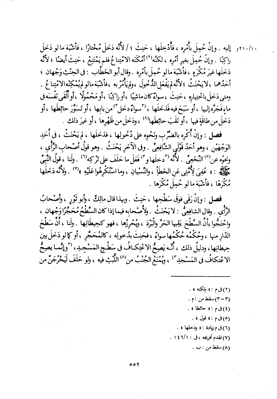 فصل: وإِنْ رَقَى فوقَ سَطْحِها، حَنِثَ. وبهذا قال مالِكٌ، وأبو ثَوْرٍ، وأصْحابُ الرَّأْىِ. وقال الشافِعِىُّ: لا يَحْنَثُ. ولأصْحابِه فيما إذا كان السَّطْحُ مُحَجَّرًا وَجْهان، واحْتَجُّوا بأنَّ السَّطْحَ يَقيها الحَرَّ والْبَرْدَ، ويُحْرِزُها، فهو كحِيطَانِها. ولَنا، أَنَّ سَطْحَ الدّارِ منها، وحُكْمُه حُكْمُها سواءً، فحَنِثَ بدُخولِه، كالمُحَجَّرِ، أو كما لو دَخَلَ بين حِيطانِها، ودليلُ ذلك، أَنَّه يَصِحُّ الاعْتِكافُ فى سَطْحِ المَسْجِدِ، [وإنَّما يصِحُّ الاعْتكافُ فى المَسْجدِ] (٣)، ويُمْنَعُ الجُنُبُ من (٨) اللُّبْثِ فيه، ولو حَلَفَ لَيَخْرُجَنَّ من