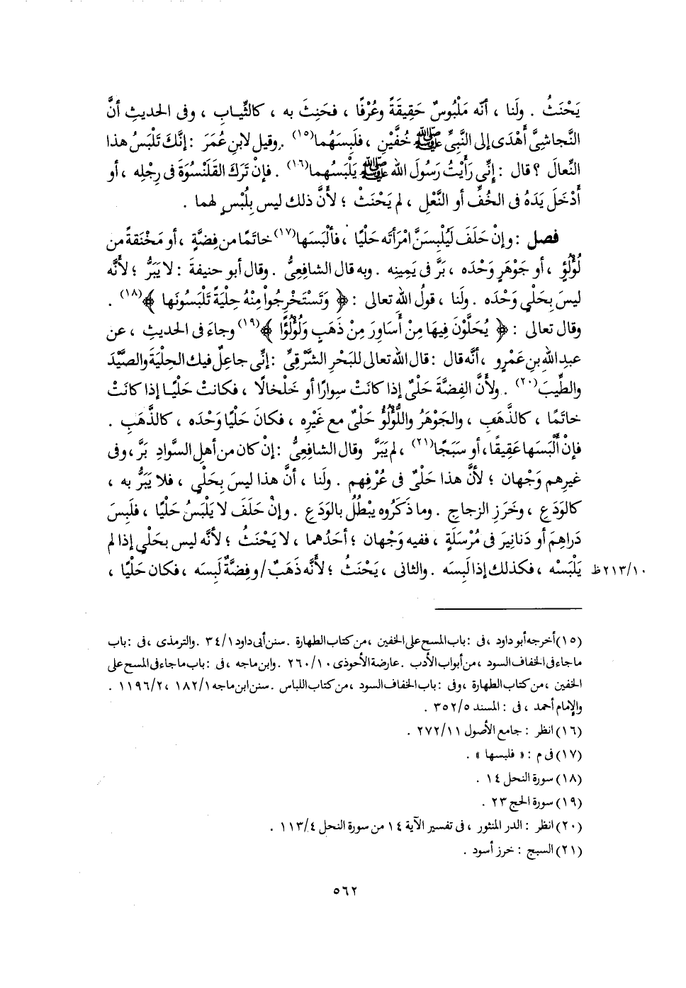 فصل: وإِنْ حَلَفَ لَيُلْبِسَنَّ امْرَأَتَه حَلْيًا، فألْبَسَها (١٧) خاتَمًا من فِضَّةٍ، أو مَخْنَقةً من لُؤْلُؤٍ، أو جَوْهَرٍ وَحْدَه، بَرَّ فى يَمِينِه. وبه قال الشافِعِىُّ. وقال أبو حنيفةَ: لا يَبَرُّ؛ لأَنَّه ليسَ بِحَلْى وَحْدَه. ولَنا، قولُ اللَّه تعالى: {وَتَسْتَخْرِجُوا مِنْهُ حِلْيَةً تَلْبَسُونَهَا} (١٨). وقال تعالى: {يُحَلَّوْنَ فِيهَا مِنْ أَسَاوِرَ مِنْ ذَهَبٍ وَلُؤْلُؤًا} (١٩) وجاءَ فى الحديثِ، عن عبدِ اللَّهِ بنِ عَمْرٍو، أنَّه قال: قال اللَّه تعالى للبَحْرِ الشَّرْقِىِّ: إنِّى جاعِلٌ فيك الحِلْيَةَ والصَّيْدَ والطِّيبَ (٢٠). ولأَنَّ الفِضَّةَ حَلْىٌ إذا كانَتْ سِوارًا أو خَلْخالًا، فكانتْ حَلْيًا إذا كانَتْ خاتَمًا، كالذَّهَبِ، والجَوْهَرُ واللُّؤْلُؤُ حَلْىٌ مع غَيْرِه، فكانَ حَلْيًا وَحْدَه، كالذَّهَبِ. فإنْ أَلْبَسَها عَقِيقًا، أو سَبَجًا (٢١)، لم يَبَرَّ وقال الشافِعِىُّ: إِنْ كان من أهلِ السَّوادِ بَرَّ، وفى غيرِهم وَجْهان؛ لأنَّ هذا حَلْىٌ فى عُرْفِهم. ولَنا، أَنَّ هذا ليسَ بِحَلْى، فلا يَبَرُّ به، كالوَدَعِ، وخَرَزِ الزجاجِ. وما ذَكَرُوه يبْطُلُ بالوَدَعِ. وإِنْ حَلَفَ لا يَلْبَسُ حَلْيًا، فلَبِسَ دَراهِمَ أو دَنانِيرَ فى مُرْسَلَةٍ، ففيه وَجْهان؛ أحَدُهما، لا يَحْنَثُ؛ لأنَّه ليس بحَلْى إذا لم يَلْبَسْه، فكذلك إذا لَبِسَه. والثانى، يَحْنَثُ؛ لأَنَّه ذَهَبٌ وفِضَّةٌ لَبِسَه، فكان حَلْيًا،