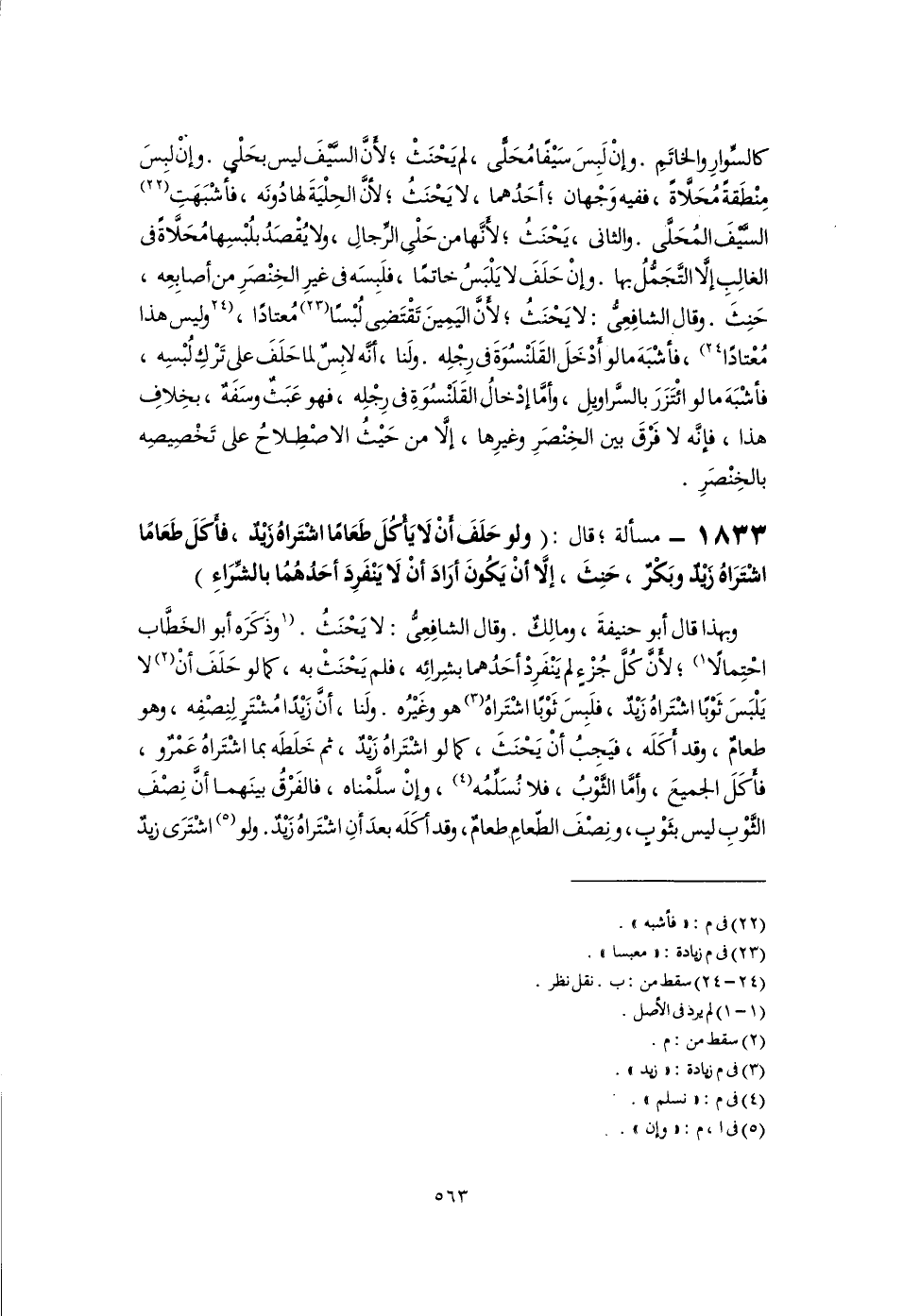 كالسِّوارِ والخاتَمِ. وإِنْ لَبِسَ سَيْفًا مُحَلًّى، لم يَحْنَثْ؛ لأَنَّ السَّيْفَ ليس بحَلْى. وإِنْ لبِسَ مِنْطَقةً مُحَلَّاةً، ففيه وَجْهان، أحَدُهما، لا يَحْنَثُ؛ لأنَّ الحِلْيَةَ لها دُونَه، فأشْبَهَتِ (٢٢) السَّيْفَ المُحَلَّى. والثانى، يَحْنَثُ؛ لأَنَّها من حَلْىِ الرِّجالِ، ولا يُقْصَدُ بلُبْسِها مُحَلَّاةً فى الغالِبِ إلَّا التَّجَمُّلُ بها. وإِنْ حَلَفَ لا يَلْبَسُ خاتمًا، فلَبِسَه فى غيرِ الخِنْصَرِ من أصابِعِه، حَنِثَ. وقال الشافِعِىُّ: لا يَحْنَثُ، لأَنَّ اليَمِينَ تَقْتَضِى لُبْسًا (٢٣) مُعتادًا، [وليس هذا مُعْتادًا] (٢٤)، فأشْبَهَ ما لو أَدْخَلَ القَلَنْسُوَةَ فى رِجْلِه. ولَنا، أنَّه لابِسٌ لما حَلَفَ علِى تَرْكِ لُبْسِه، فأشْبَهَ ما لو ائْتَزَرَ بالسَّراويلِ، وأمَّا إدْخالُ القَلَنْسُوَةِ فى رِجْلِه، فهو عَبَثٌ وسَفَهٌ، بخِلافِ هذا، فإنَّه لا فَرْقَ بين الخِنْصَرِ وغيرِها، إِلَّا من حَيْثُ الاصْطِلاحُ على تَخْصِيصِه بالخِنْصَرِ.