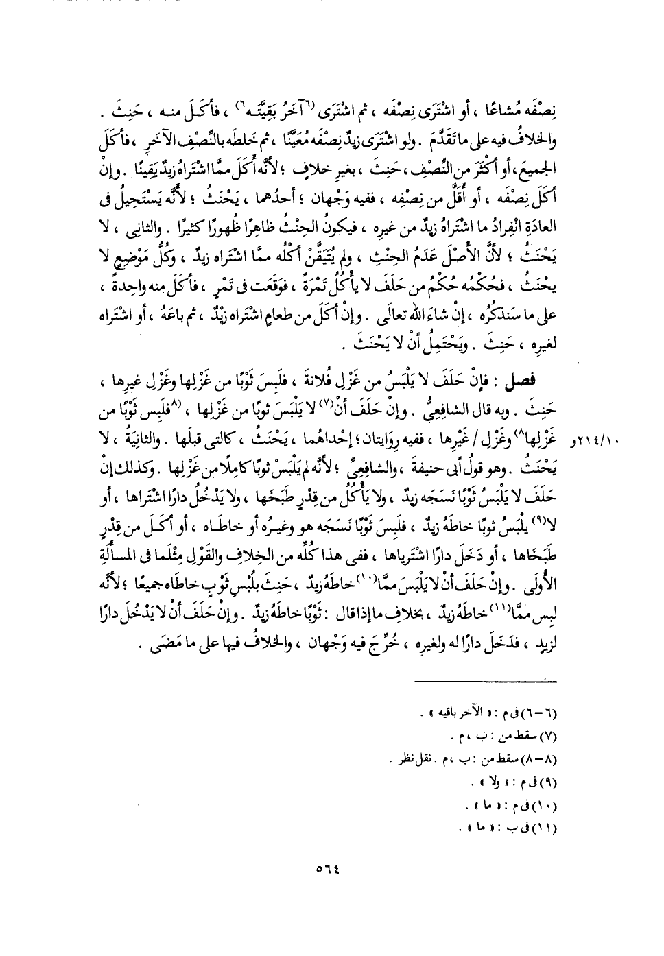 نِصْفَه مُشاعًا، أو اشْتَرَى نِصْفَه، ثم اشْتَرَى [آخَرُ بَقِيَّتَه] (٦)، فأكَلَ منه، حَنِثَ. والخلافُ فيه على ما تَقَدَّمَ. ولو اشْتَرَى زيدٌ نِصْفَه مُعَيَّنًا، ثم خَلطَه بالنِّصْفِ الآخَرِ، فأكَلَ الجميعَ، أو أكْثَرَ من النِّصْفِ، حَنِثَ، بغيرِ خلافٍ؛ لأنَّه أَكَلَ ممَّا اشْتَراهُ زيدٌ يَقِينًا. وإِنْ أكَلَ نِصْفَه، أو أَقَلَّ من نِصْفِه، ففيه وَجْهان؛ أحدُهما، يَحْنَثُ؛ لأَنَّه يَسْتَحِيلُ فى العادَةِ انْفِرادُ ما اشْتَراهُ زيدٌ من غيرِه، فيكونُ الحِنْث ظاهِرًا ظُهورًا كثيرًا. والثانِى، لا يَحْنَثْ؛ لأنَّ الأَصْلَ عَدَمُ الحِنْثِ، ولم يُتَيَقَّنْ أكْلُه ممَّا اشْتَراه زيدٌ، وكُلُّ مَوْضِعٍ لا يحْنَثُ، فحُكْمُه حُكْمُ من حَلَفَ لا يأْكُلُ تَمْرَةً، فوَقَعَت فى تَمْرٍ، فأكَلَ منه واحِدةً، على ما سَنذكُرُه، إِنْ شاءَ اللَّه تعالَى. وإِنْ أكَلَ من طعامٍ اشْتَراه زيْدٌ، ثم باعَهُ، أو اشْتَراه لغيرِه، حَنِثَ. ويَحْتَمِلُ أَنْ لا يَحْنَثَ.
