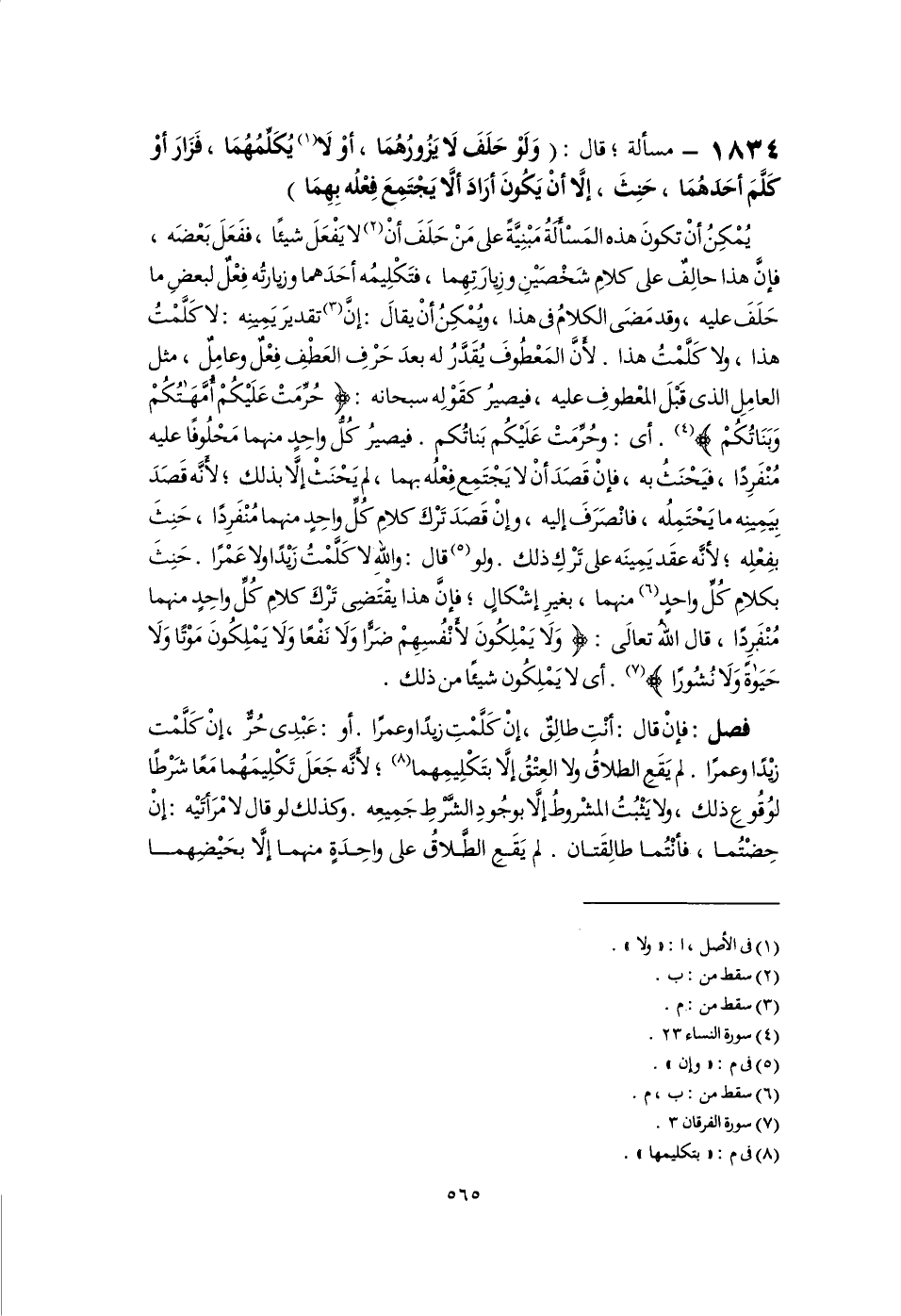 فصل: فإنْ قال: أنْتِ طالِقٌ، إِنْ كَلَّمْتِ زيدًا وعمرًا. أو: عَبْدِى حُرٌّ، إِنْ كَلَّمْت زيْدًّا وعمرًا. لم يَقَعِ الطَّلاقُ ولا العِتْقُ إِلَّا بتَكْلِيمِهما (٨)؛ لأنَّه جَعَلَ تَكْلِيمَهُما مَعًا شَرْطًا لوُقُوعِ ذلك، ولا يَثْبُتُ المشْروطُ إِلَّا بوجُودِ الشَّرْطِ جَمِيعِه. وكذلك لو قال لامْرَاتَيْه: إِنْ حِضْتُما، فأنْتُما طالِقَتان. لم يَقَعِ الطَّلاقُ على واحِدَةٍ منهما إِلَّا بحَيْضِهما