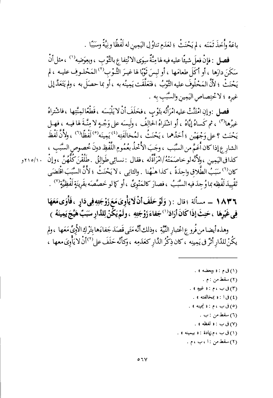 فصل: وإنِ امْتَنَّتْ عليه امْرَأَتُه بثَوْبٍ، فحَلَفَ أَنْ لا يَلْبَسَه، قَطْعًا لمِنَّتِها، فاشْتراهُ غيرُها (٣)، ثم كَساهُ إيَّاهُ، أو اشْتَراهُ الحالِفُ، ولَبِسَه على وَجْهٍ لا مِنَّةَ لها فيه، فهل يَحْنَث؟ على وَجْهَيْن؛ أحَدُهما، يَحْنَثُ، لمُخالَفَتِه (٤) يَمِينَه (٥) لَفْظًا (٦)، ولأَنَّ لَفْظَ الشارِعِ إذا كان أَعَمَّ من السَّبَبِ، وجَبَ الأَخْذُ بعُمُومِ اللَّفْظِ دونَ خُصوصِ السَّبَبِ، كذا فى اليَمِينِ، ولأنَّه لو خاصَمَتْهُ امْرَأَةٌ له، فقال: نسائِى طَوالِقُ. طَلُقْنَ كُلُّهُنَّ، وإِنْ كان (٦) سَبَبُ الطَّلاقِ واحِدَةً، كذا ههُنا. والثانِى، لا يَحْنَثُ؛ لأنَّ السَّبَبَ اقْتَضَى تَقْيِيدَ لَفْظِه بما وُجِدَ فيه السَّبَبُ، فصارَ كالمَنْوِىِّ، أو كما لو خَصَّصَه بقَرِينَةٍ لَفْظِيَّةٍ (٧).