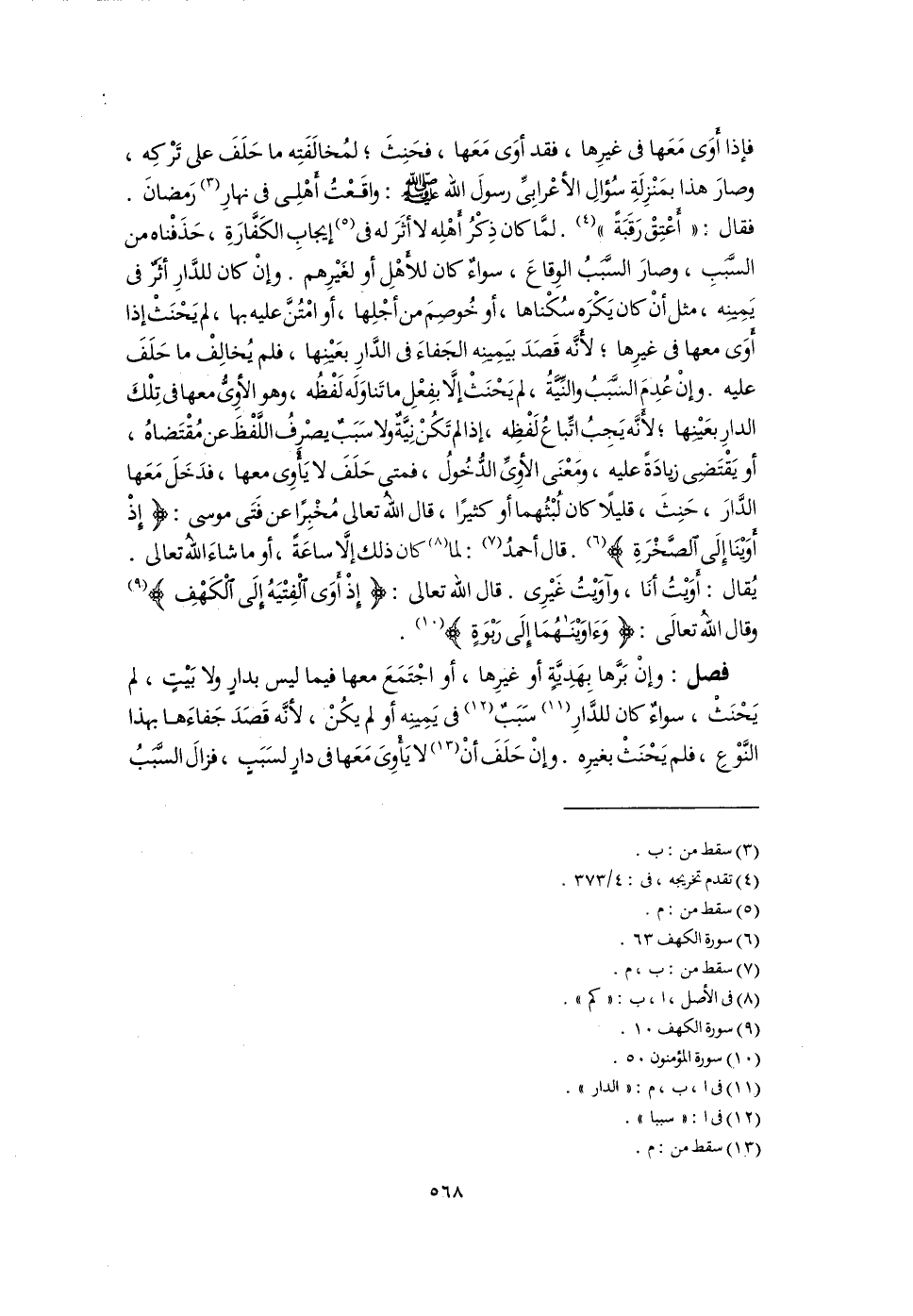 فإذا أَوى مَعَها فى غيرِها، فقد أوَى مَعَها، فحَنِثَ؛ لمُخالَفَتِه ما حَلَفَ على تَرْكِه، وصارَ هذا بمَنْزِلَةِ سُؤالِ الأعْرابِىِّ رسولَ اللَّه -صلى اللَّه عليه وسلم-: واقَعْتُ أَهلِى فى نهارِ (٣) رَمضانَ. فقال: "أَعْتِقْ رَقَبَةً" (٤). لمَّا كان ذِكْرُ أَهْلِه لا أثَرَ له فى (٥) إيجابِ الكَفَّارَةِ، حَذَفْناه من السَّبَبَ، وصارَ السَّبَبِ الوِقاعَ، سواءٌ كان للأَهْلِ أو لغَيْرِهم. وإِنْ كان للدَّارِ أثَرٌ فى يَمِينِه، مثل أَنْ كان يَكْرَه سُكْناها، أو خُوصِمَ من أجْلِها، أو امْتُنَّ عليه بها، لم يَحْنَثْ إذا أَوَى معها فى غيرِها؛ لأَنَّه قَصَدَ بيَمِيِنه الجَفاءَ فى الدَّارِ بعَيْنِها، فلم يُخالِفْ ما حَلَفَ عليه. وإِنْ عُدِمَ السَّبَبُ والنِّيَّةُ، لم يَحْنَثْ إِلَّا بفِعْلِ ما تَناوَلَه لَفْظُه، وهو الأوِىُّ معها فى تِلْكَ الدارِ بعَيْنِها؛ لأنَّه يَجِبُ اتِّباعُ لَفْظِه، إذا لم تَكُنْ نِيَّةٌ ولا سَبَبٌ يصْرفُ اللَّفْظَ عن مُقْتَضاهُ، أو يَقْتَضِى زيادَةً عليه، ومَعْنَى الأوِىِّ الدُّخُولُ، فمتى حَلَفَ لا يَأْوِى معها، فدَخَلَ مَعَها الدَّارَ، حَنِثَ، قليلًا كان لُبْثُهما أو كثيرًا، قال اللَّه تعالى مُخْبِرًا عن فَتَى موسى: {إِذْ أَوَيْنَا إِلَى الصَّخْرَةِ} (٦). قال أحمدُ (٧): لما (٨) كان ذلك إلَّا ساعَةً، أو ما شاءَ اللَّهُ تعالى. يُقال: أَوَيْتُ أنَا، وآويْتُ غَيْرِى. قال اللَّه تعالى: {إِذْ أَوَى الْفِتْيَةُ إِلَى الْكَهْفِ} (٩) وقال اللَّهُ تعالَى: {وَآوَيْنَاهُمَا إِلَى رَبْوَةٍ} (١٠).