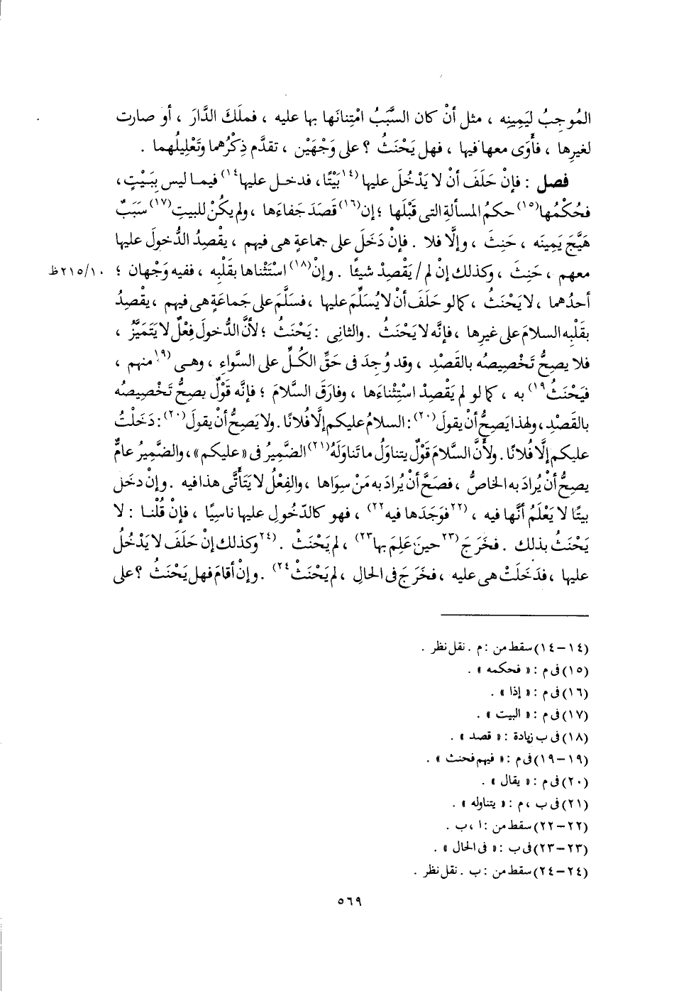 فصل: فإنْ حَلَفَ أَنْ لا يَدْخُلَ عليها [بَيْتًا، فدخل عليها] (١٤) فيما ليس بِبَيْتٍ، فحُكْمُها (١٥) حكِمُ المسألةِ التى قَبْلَها؛ إن (١٦) قَصَدَ جَفاءَها، ولم يكُنْ للبيتِ (١٧) سَبَبٌ هَيَّجَ يَمِينَه، حَنِث، وإلّا فلا. فإنْ دَخَلَ على جماعةٍ هى فيهم، يقْصِدُ الدُّخولَ عليها معهم، حَنِثَ، وكذلك إِنْ لم يَقْصِدْ شيئًا. وإِنْ (١٨) اسْتَثْناها بقَلْبِه، ففيه وَجْهان؛ أحدُهما، لا يَحْنَثُ، كما لو حَلَفَ أَنْ لا يُسَلِّمَ عليها، فسَلَّمَ على جَماعَةٍ هى فيهم، يقْصِدُ بقَلْبِه السلامَ على غيرِها، فإنَّه لا يَحْنَثُ. والثانِى: يَحْنَثُ؛ لأنَّ الدُّخولَ فِعْل لا يَتَمَيَّزُ، فلا يصِحُّ تَخْصِيصُه بالقَصْدِ، وقد وُجِدَ فى حَقِّ الكُلِّ على السَّواءِ، وهى [منهم، فيَحْنَثُ] (١٩) به، كما لو لم يَقْصِدْ اسْتِثْناءَها، وفارَقَ السَّلامَ؛ فإنَّه قَوْلٌ بصِحُّ تَخْصِيصُه بالقَصْدِ، ولهذا يَصِحُّ أَنْ يقولَ (٢٠): السلامُ عليكم إِلَّا فُلانًا. ولا يَصِحُّ أَنْ يقولَ (٢٠): دَخَلْتُ عليكم إِلَّا فُلانًا. ولانَّ السَّلامَ قَوْلٌ يتناوَلُ ما تَناوَلَهُ (٢١) الضَّمِيرُ فى "عليكم"، والضَّمِيرُ عامٌّ يصِحُّ أَنْ يُرادَ به الخاصُّ، فصَحَّ أَنْ يُرادَ به مَنْ سِوَاها، والفِعْلُ لا يَتَأَتَّى هذا فيه. وإِنْ دخَل بيتًا لا يَعْلَمُ أنَّها فيه، [فوَجَدَها فيه] (٢٢)، فهو كالدّخُولِ عليها ناسِيًا، فإنْ قُلْنا: لا يَحْنَثُ بذلك. فخَرَجَ [حين عَلِمَ بها] (٢٣)، لم يحْنَثْ. [وكذلك إِنْ حَلَفَ لا يَدْخُلُ عليها، فدَخَلَتْ هى عليه، فخَرَجَ فى الحالِ، لم يَحْنَثْ] (٢٤). وإِنْ أقامَ فهل يَحْنَثُ؟ على