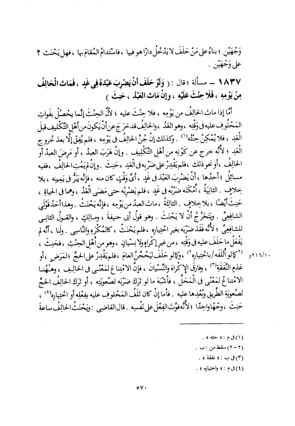 أمَّا إذا ماتَ الحالِفُ من يَوْمِه، فلا حِنْثَ عليه؛ لأنَّ الحِنْثَ إنَّما يحْصُلُ بفَواتِ المَحْلُوفِ عليه فى وَقْتِه، وهو الغَدُ، والحالِفُ قد خَرَجَ عن أَنْ يَكونَ من أهْلِ التَّكْليفِ قبلَ الْغَدِ، فلا يُمْكِنُ حِنْثُه (١). وكذلك إِنْ جُنَّ الحالِفُ فى يَوْمِه، فلم يُفِقْ إِلَّا بعدَ خُروجِ الْغَدِ؛ لأَنَّه خرج عن كَوْنِه من أهْلِ التَّكْلِيفِ. وإِنْ هَرَبَ العبدُ، أو مَرِضَ العبدُ أو الحالِفُ، أو نحو ذلك، فلم يَقْدِرْ على ضَرْبِه فى الْغَدِ، حَنِثَ. وإِنْ لم يَمُتِ الحالِفُ، ففيه مسائِلُ؛ أحدُها، أَنْ يَضْرِبَ العَبْدَ فى غَدٍ، أىِّ وَقْتٍ كان منه، فإنَّه يَبَرُّ فى يَمِينِه، بلا خِلافٍ. الثانِيَةُ، أَمْكَنَه ضَرْبُه فى غَدٍ، فلم يَضْرِبْه حتى مَضَى الْغَدُ، وهما فى الحياةِ، حَنِثَ أيْضًا، بلا خِلافٍ. الثالِثَةُ، ماتَ العبدُ من يَوْمِه، فإنَّه يَحْنَثُ. وهذا أحَدُ قَوْلَىِ الشافِعِىِّ. ويَتَخَرَّجُ أَنْ لا يَحْنَثَ. وهو قولُ أبى حنيفةَ، ومالِكٍ، والقولُ الثانِى للشافِعِىِّ؛ لأَنَّه فَقَدَ ضَرْبَه بغيرِ اخْتِيارِه، فلم يَحْنَثْ، كالمُكْرهِ والنَّاسِى. ولَنا، أنَّه لم يَفْعَلْ ما حَلَفَ عليه فى وَقْتِه، من غيرِ إكْراهٍ ولا نِسْيانٍ، وهو من أَهْلِ الحِنْثِ، فحَنِثَ، [كما لو أَتْلَفَه باخْتِيارِه] (٢)، وكما لو حَلَفَ ليَحُجَّنَّ العامَ، فلم يَقْدِرْ على الحجِّ؛ لمَرَضٍ، أو عَدَمِ النَّفَقَةِ (٣)، وفارقَ الإِكْراهَ والنِّسْيانَ، فإِنَّ الامْتِناعَ لمَعْنًى فى الحالِفِ، وههُنا الامْتناعُ لمَعْنًى فى الْمَحَلِّ، فأشْبَهَ ما لو تَرَكَ ضَرْبَه لصُعوبُتِه، أو تَرَكَ الحالِفُ الحجَّ لصُعوَبةِ الطرَّيقِ وبُعْدِها عليه. فأما إِنْ كان تَلَفُ المَحْلوفِ عليه بفِعْلِه أو اخْتِيارِه (٤)، حَنِثَ، وجْهًا واحِدًا؛ لأَنَّه فوَّتَ الفِعْلَ على نَفْسِه. قال القاضِى: ويَحْنَثُ الحالِفُ ساعةَ