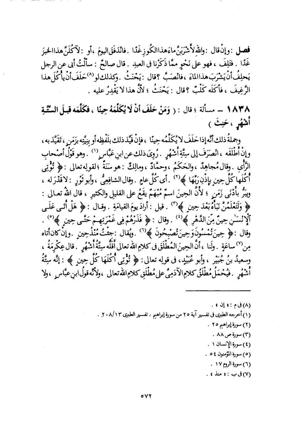 وجملةُ ذلك أنَّه إذا حَلَفَ لا يُكَلِّمُه حِينًا، فإنْ قيَّدَ ذلك بلَفْظِه أو بنِيَّتِه بزَمَن، تَقَيَّدَ به، وإِنْ أَطْلَقَه، انْصَرَفَ إلى سِتَّةِ أَشْهُرٍ. رُوِىَ ذلك عن ابنِ عَبَّاسٍ (١). وهو قَوْلُ أصْحابِ الرَّأْىِ. وقال مُجاهِدٌ، والحَكَمُ، وحمَّادٌ، ومالِكٌ: هو سَنَةٌ؛ لقولِه تعالى: {تُؤْتِى أُكُلَهَا كُلَّ حِينٍ بِإِذْنِ رَبِّهَا} (٢). أى كُلَّ عامٍ. وقال الشافِعِىُّ، وأبو ثوْرٍ: لا قَدْرَ له، ويبَرُّ بأَدْنَى زَمَنٍ؛ لأنَّ الحِينَ اسمٌ مُبْهَمٌ يقَعُ على القليلِ والكثيرِ، قال اللَّهُ تعالى: {وَلَتَعْلَمُنَّ نَبَأَهُ بَعْدَ حِينٍ} (٣). قيل: أرادَ يومَ القيامَةِ. وقال: {هَلْ أَتَى عَلَى الْإِنْسَانِ حِينٌ مِنَ الدَّهْرِ} (٤). وقال: {فَذَرْهُمْ فِى غَمْرَتِهِمْ حَتَّى حِينٍ} (٥). وقال: {حِينَ تُمْسُونَ وَحِينَ تُصْبِحُونَ} (٦). ويُقال: جئْتُ مُنْذُ حِين. وإِنْ كان أتاه مِن (٧) ساعةٍ. ولَنا، أَنَّ الحِينَ المُطْلَقَ فى كلامِ اللَّه تعالى أَقَلُّه سِتَّةُ أشْهُرٍ. قال عِكْرِمَةُ، وسعيدُ بنُ جُبَيْر، وأبو عُبَيْد، فى قولِه تعالى: {تُؤْتِى أُكُلَهَا كُلَّ حِينٍ}: إنَّه سِتَّةُ أشْهُرٍ. فيُحْمَلُ مُطْلَقُ كلامِ الآدَمِىِّ على مُطْلَقِ كلامِ اللَّه تعالى، ولأنَّه قولُ ابنِ عبَّاسٍ، ولا