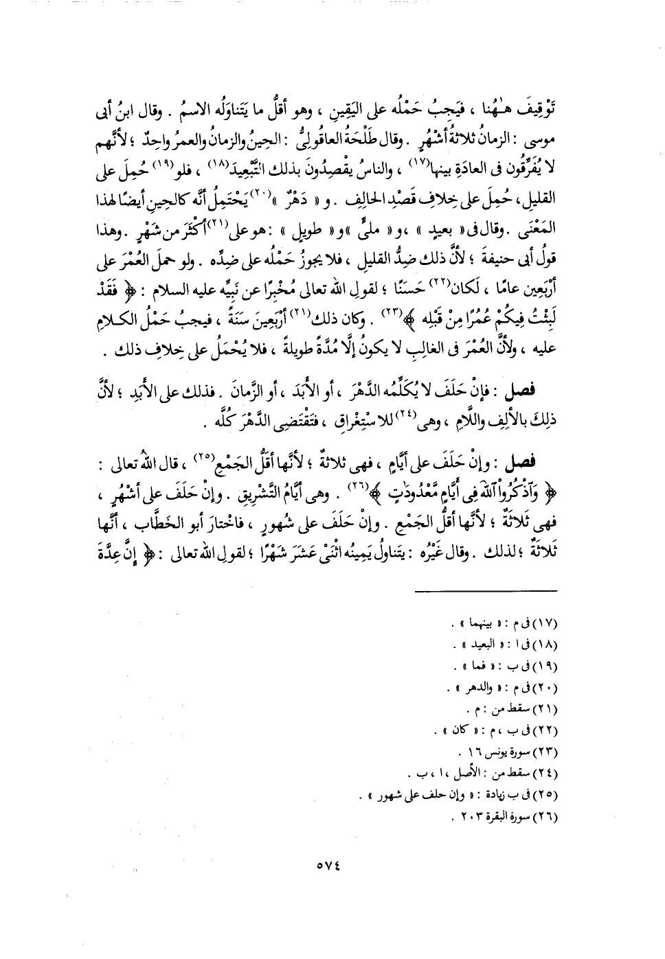 تَوْقِيفَ ههُنا، فيَجِبُ حَمْلُه على اليَقِينِ، وهو أقلُّ ما يَتَناوَلُه الاسمُ. وقال ابنُ أبى موسى: الزمانُ ثلاثةُ أشْهُرٍ. وقال طَلْحَةُ العاقُولِىُّ: الحِينُ والزمانُ والعمرُ واحِدٌ؛ لأنَّهم لا يُفَرِّقُون فى العادَةِ بينها (١٧)، والناسُ يقْصِدُونَ بذلك التَّبْعِيدَ (١٨)، فلو (١٩) حُمِلَ على القليلِ، حُمِلَ على خِلافِ قَصْدِ الحالِفِ. و"دَهْرٌ" (٢٠) يَحْتَمِلُ أنَّه كالحِينِ أيضًا لهذا المَعْنَى. وقال فى "بعيدٍ"، و"ملىٍّ" و"طويلٍ": هو على (٢١) أكْثَرَ من شَهْرٍ. وهذا قولُ أبى حنيفةَ؛ لأنَّ ذلك ضِدُّ القليلِ، فلا يجوزُ حَمْلُه على ضِدِّه. ولو حملَ العُمْرَ على أرْبَعِين عامًا، لَكان (٢٢) حَسَنًا؛ لقولِ اللَّه تعالى مُخْبِرًا عن نَبِيِّه عليه السلام: {فَقَدْ لَبِثْتُ فِيكُمْ عُمُرًا مِنْ قَبْلِهِ} (٢٣). وكان ذلك (٢١) أرْبَعِينَ سَنَةً، فيجبُ حَمْلُ الكلامِ عليه، ولأنَّ العُمْرَ فى الغالِبِ لا يكونُ إِلَّا مُدَّةً طويلةً، فلا يُحْمَلُ على خِلافِ ذلك.