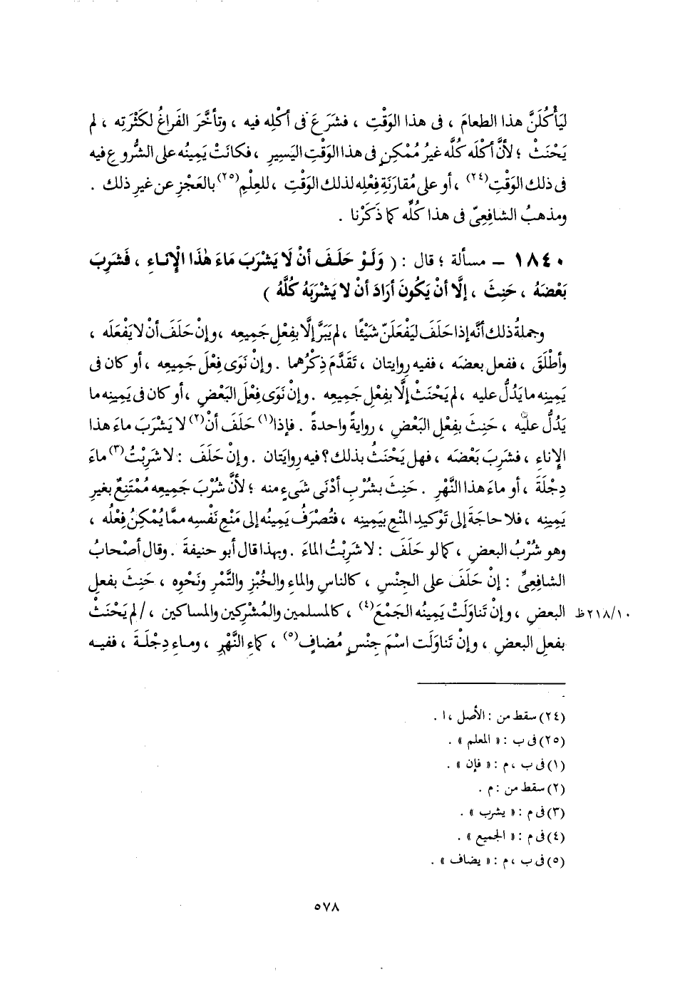 وجملةُ ذلك أنَّه إذا حَلَفَ ليَفْعَلَنّ شَيْئًا، لم يَبَرَّ إِلَّا بفِعْلِ جَمِيعِه، وإِنْ حَلَفَ أَنْ لا يَفْعَلَه، وأطْلَقَ، ففعل بعضَه، ففيه رِوايتان، تَقَدَّمَ ذِكْرُهما. وإِنْ نَوَى فِعْلَ جَمِيعِه، أو كان فى يَمِينِه ما يَدُلُّ عليه، لم يَحْنَثْ إِلَّا بفِعْلِ جَمِيعِه. وإِنْ نَوَى فِعْلَ البَعْضِ، أو كان فى يَمِينِه ما يَدُلُّ عليه، حَنِثَ بفِعْلِ البَعْضِ، روايةً واحدةً. فإذا (١) حَلَفَ أَنْ (٢) لا يَشْرَبَ ماءَ هذا الإِناءِ، فشَرِبَ بَعْضَه، فهل يَحْنَثُ بذلك؟ فيه رِوايَتان. وإِنْ حَلَفَ: لا شَرِبْتُ (٣) ماءَ دِجْلَةَ، أو ماءَ هذا النَّهْرِ. حَنِثَ بشُرْبِ أدْنَى شَىءٍ منه؛ لأنَّ شُرْبَ جَمِيعِه مُمْتَنِعٌ بغيرِ يَمِينِه، فلا حاجَةَ إلى تَوْكيدِ المنْعِ بيَمِينِه، فتُصْرَفُ يَمِينُه إلى مَنْعِ نَفْسِه ممَّا يُمْكِنُ فِعْلُه، وهو شُرْبُ البعضِ، كما لو حَلَفَ: لا شَرِبْتُ الماءَ. وبهذا قال أبو حنيفةَ. وقال أصْحابُ الشافِعِىِّ: إِنْ حَلَفَ على الجِنْسِ، كالناسِ والماءِ والخُبْزِ والتَّمْرِ ونَحْوِه، حَنِثَ بفعلِ البعضِ، وإِنْ تَناوَلَتْ يَمِينُه الجَمْعَ (٤)، كالمسلمين والمُشْركِين والمساكين، لم يَحْنَث بفعلِ البعضِ، وإِنْ تَناوَلَت اسْمَ جِنْسٍ مُضافٍ (٥)، كماءِ النَّهْرِ، وماءِ دِجْلَةَ، ففيه