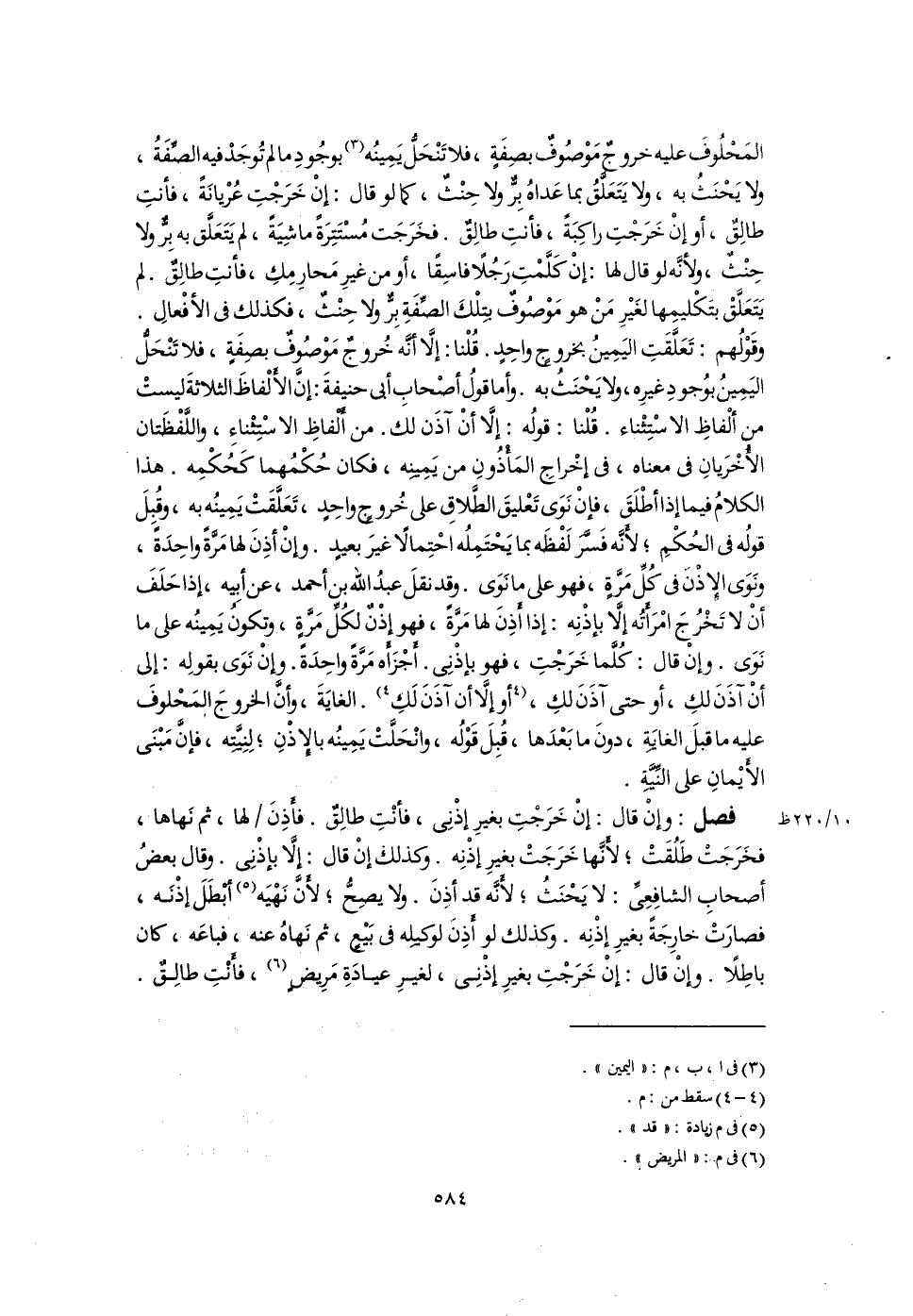فصل: وإِنْ قال: إِنْ خَرَجْتِ بغيرِ إذْنِى، فأنْتِ طالِقٌ. فأَذِنَ لها، ثم نَهاها، فخَرَجَت طَلُقَتْ؛ لأنَّها خَرَجَتْ بغيرِ إذْنِه. وكذلك إِنْ قال: إِلَّا بإذْنِى. وقال بعضُ أصحابِ الشافِعِىِّ: لا يَحْنَثُ؛ لأَنَّه قد أذِنَ. ولا يصِحُّ؛ لأَنَّ نَهْيَه (٥) أبْطَلَ إذْنَه، فصارَتْ خارِجَةً بغيرِ إذْنِه. وكذلك لو أَذِن لوكيلِه فى بَيْعٍ، ثم نَهاهُ عنه، فباعَه، كان باطِلًا. وإِنْ قال: إِنْ خَرَجْتِ بغيرِ إذْنِى، لغيرِ عيادَةِ مَرِيضٍ (٦)، فأَنْتِ طالِقٌ.