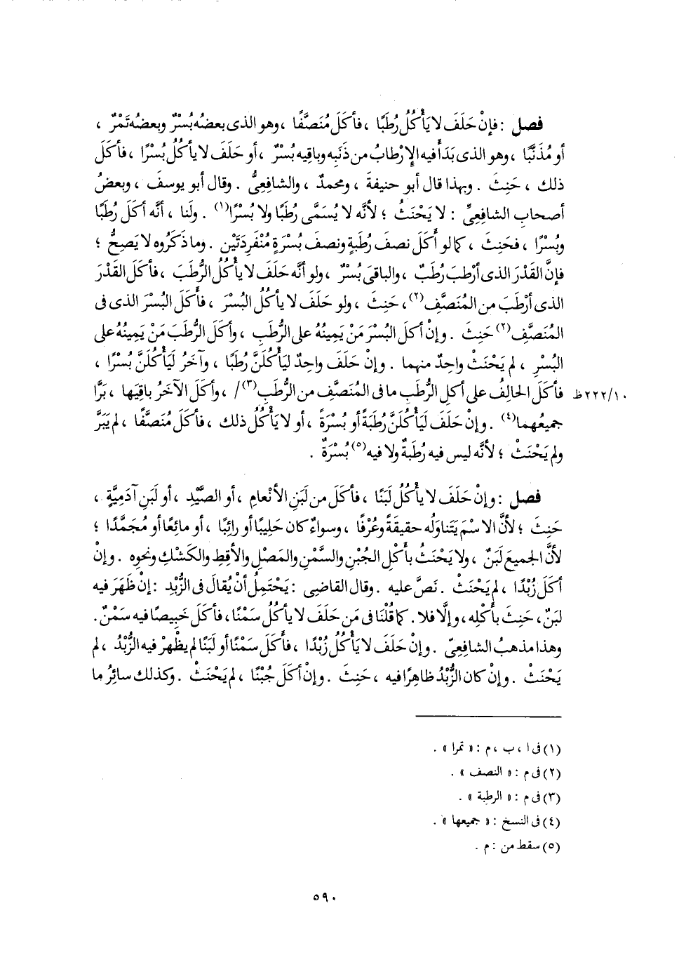 فصل: فإنْ حَلَفَ لا يَأْكُلُ رُطَبًا، فأكَلَ مُنَصَّفًا، وهو الذى بعضُه بُسْرٌ وبعضُه تَمْرٌ، أو مُذَنَّبًا، وهو الذى بَدَأَ فيه الإِرْطابُ من ذَنَبِه وباقِيه بُسْرٌ، أو حَلَفَ لا يأكُلُ بُسْرًا، فأكَلَ ذلك، حَنِث. وبهذا قال أبو حنيفةَ، ومحمدٌ، والشافِعِىُّ. وقال أبو يوسفَ، وبعضُ أصحابِ الشافِعِىِّ: لا يَحْنَثُ؛ لأنَّه لا يُسَمَّى رُطَبًا ولا بُسْرًا (١). ولَنا، أنَّه أكَلَ رُطَبًا وبُسْرًا، فحَنِثَ، كما لو أَكَلَ نصفَ رُطَبةٍ ونصفَ بُسْرَةٍ مُنْفَرِدَتَيْن. وما ذَكَرُوه لا يَصِحُّ؛ فإِنَّ القَدْرَ الذى أرْطبَ رُطَبٌ، والباقىَ بُسْرٌ، ولو أنَّه حَلَفَ لا يأْكُلُ الرُّطَبَ، فأكَلَ القَدْرَ الذى أرْطَبَ من المُنَصَّفِ (٢)، حَنِثَ، ولو حَلَفَ لا يأكُلُ البُسْرَ، فأَكَلَ البُسْرَ الذى فى المُنَصَّفِ (٢) حَنِثَ. وإِنْ أكلَ البُسْرَ مَنْ يَمِينُهُ على الرُّطَبِ، وأكَلَ الرُّطَبَ مَنْ يَمِينُهُ على البُسْرِ، لم يَحْنَثْ واحِدٌ منهما. وإِنْ حَلَفَ واحِدٌ ليَأْكُلَنَّ رُطَبًا، وآخَرُ لَيَأْكُلَنَّ بُسْرًا، فأكَلَ الحالِفُ على أكلِ الرُّطَبِ ما فى المُنَصَّفِ من الرُّطَبِ (٣)، وأكَلَ الآخَرُ باقِيَها، بَرَّا جميعُهما (٤). وإِنْ حَلَفَ لَيَأْكُلَنَّ رُطَبَةً أو بُسْرَةً، أو لا يَأْكُلُ ذلك، فأكَلَ مُنَصَّفًا، لم يَبَرَّ ولم يَحْنَثْ؛ لأنَّه ليس فيه رُطَبةٌ ولا فيه (٥) بُسْرَةٌ.