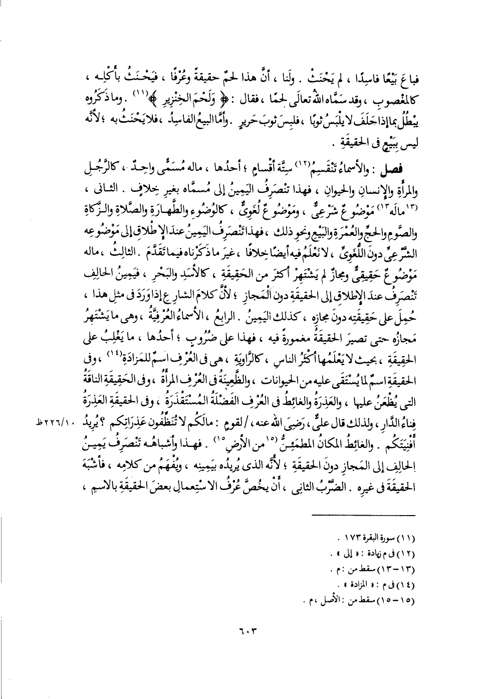 فصل: والأسماءُ تَنْقَسِمُ (١٢) سِتَّة أقْسامٍ؛ أحدُها، ماله مُسَمًّى واحِدٌ، كالرَّجُلِ والمرأَةِ والإِنسانِ والحيوانِ، فهذا تنْصَرِفُ اليَمِينُ إلى مُسمَّاه بغيرِ خِلافٍ. الثانى، [مالَه] (١٣) مَوْضُوعٌ شَرْعِىٌّ، ومَوْضُوعٌ لُغَوِىٌّ، كالوُضُوءِ والطَّهارَةِ والصَّلاةِ والزَّكاةِ والصَّومِ والحجِّ والعُمْرَةِ والبَيْعِ ونحوِ ذلك، فهذا تَنْصَرِفُ اليَمِينُ عندَ الإِطْلاقِ إلى مَوْضُوعِه الشَّرْعِىِّ دونَ اللُّغَوِىِّ، لا نَعْلَمُ فيه أيضًا خِلافًا، غيرَ ما ذَكَرْناه فيما تَقَدَّمَ. الثالِثُ، ماله مَوْضُوعٌ حَقِيقِىٌّ ومجازٌ لم يَشْتهِرْ أكثرَ من الحَقِيقَةِ، كالأسَدِ والبَحْرِ، فيَمِينُ الحالِفِ تَنْصَرِفُ عندَ الإِطلاقِ إلى الحقيقَةِ دون المَجازِ؛ لأنَّ كلامَ الشارِعِ إذا وَرَدَ فى مثلِ هذا، حُمِلَ على حَقِيقَتِه دونَ مجازِه، كذلك اليَمِينُ. الرابِعُ، الأسماءُ العُرْفِيَّةُ، وهى ما يَشْتَهِرُ مَجازُه حتى تصيرَ الحقيقَةُ مغمورةً فيه، فهذا على ضُرُوبٍ؛ أحدُها، ما يَغْلِبُ على الحقِيقَةِ، بحيث لا يَعْلَمُها أكْثَرُ الناسِ، كالرَّاويَةِ، هى فى العُرْفِ اسمٌ للمَزادَةِ (١٤)، وفى الحقيقَةِ اسمٌ لما يُسْتَقَى عليه من الحيوانات، والظَّعِينَةُ فى العُرْفِ المرأَةُ، وفى الحَقِيقَةِ الناقَةُ التى يُظْعَنُ عليها، والعَذِرَةُ والغائِطُ فى العُرْفِ الفَضْلَةُ المُسْتَقْذَرَةُ، وفى الحقيقَةِ العَذِرَةُ فِناءُ الدَّارِ، ولذلك قال علىٌّ، رَضِىَ اللَّهُ عنه، لقومٍ: ما لَكُم لا تُنَظِّفُون عَذِرَاتِكم؟ يُرِيدُ أَفْنِيَتَكُم. والغائِطُ المكانُ المطمَئِنُّ [من الأرضِ] (١٥). فهذا وأشباهُه تَنْصَرِفُ يَمِينُ الحالِفِ إلى المَجازِ دونَ الحقيقَةِ؛ لأَنَّه الذى يُريدُه بيَمِينِه، ويُفْهَمُ من كلامِه، فأشْبَهَ الحقيقَةَ فى غيرِه. الضَّرْبُ الثانِى، أَنْ يخُصَّ عُرْفُ الاسْتِعمالِ بعضَ الحقيقَةِ بالاسمِ،