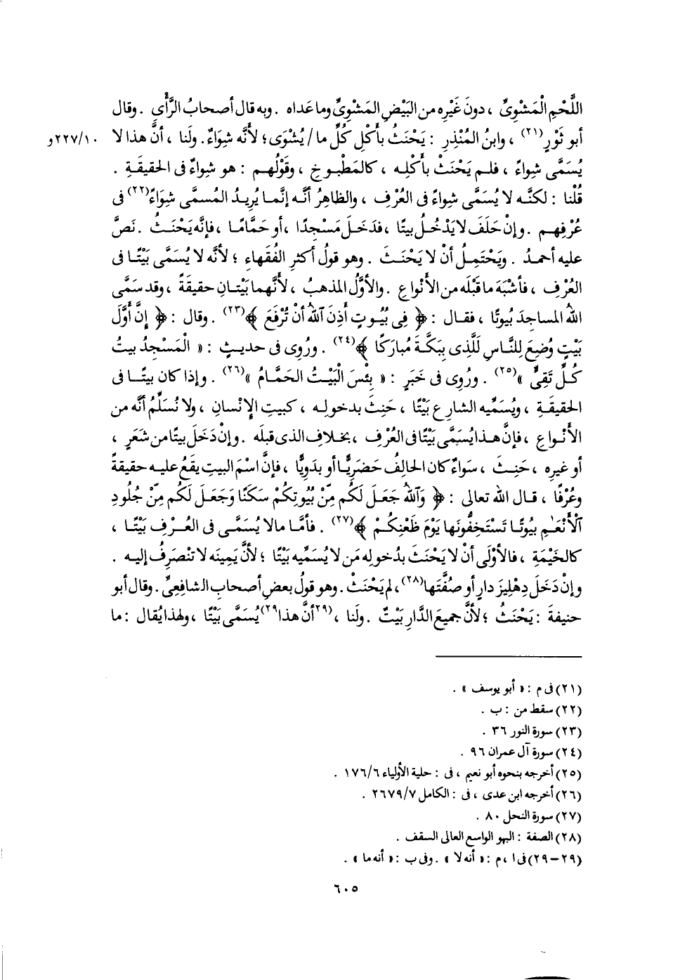 اللَّحْمِ الْمَشْوِىِّ، دونَ غَيْرِه من البَيْضِ المَشْوِىِّ وما عَداه. وبه قال أصحابُ الرَّأْىِ. وقال أبو ثَوْرٍ (٢١)، وابنُ المُنْذِرِ: يَحْنَثُ بأَكْلِ كُلِّ ما يُشْوَى؛ لأَنَّه شِوَاءٌ. ولنا، أَنَّ هذا لا يُسَمَّى شِواءً، فلم يَحْنَثْ بأَكْلِه، كالمَطْبوخِ، وقَوْلُهم: هو شِواءٌ فى الحقيقَةِ. قُلْنا: لكنَّه لا يُسَمَّى شِواءٌ فى العُرْفِ، والظاهِرُ أنَّه إنَّما يُرِيدُ المُسمَّى شِوَاءً (٢٢) فى عُرْفِهم. وإِنْ حَلَفَ لا يَدْخُلُ بيتًا، فدَخَلَ مَسْجدًا، أو حَمَّامًا، فإنَّه يَحْنَثُ. نَصَّ عليه أحمدُ. ويَحْتَمِلُ أَنْ لا يَحْنَثَ. وهو قولُ أكثرِ الفُقَهاءِ؛ لأنَّه لا يُسَمَّى بَيْتًا فى العُرْفِ، فأشْبَهَ ما قَبْلَه من الأَنْواعِ. والأَوَّلُ المذهبُ، لأَنَّهما بَيْتانِ حقيقَةً، وقد سَمَّى اللَّه المساجِدَ بُيوتًا، فقال: {فِى بُيُوتٍ أَذِنَ اللَّهُ أَنْ تُرْفَعَ} (٢٣). وقال: {إِنَّ أَوَّلَ بَيْتٍ وُضِعَ لِلنَّاسِ لَلَّذِى بِبَكَّةَ مُبَارَكًا} (٢٤). ورُوِى فى حديثٍ: "الْمَسْجِدُ بيتُ كُلِّ تَقِىٍّ" (٢٥). ورُوِى فى خَبَرٍ: "بِئْسَ الْبَيْتُ الحَمَّامُ" (٢٦). وإذا كان بيتًا فى الحقيقَةِ، ويُسَمِّيه الشارِع بَيْتًا، حَنِثَ بدخولِه، كبيتِ الإِنْسانِ، ولا نُسَلِّمُ أنَّه من الأَنْواعِ، فإِنَّ هذا يُسَمَّى بَيْتًا فى العُرْفِ، بخلافِ الذى قبلَه. وإِنْ دَخَلَ بيتًا من شَعَرٍ، أو غيرِه، حَنِثَ، سَواءٌ كان الحالِفُ حَضَرِيًّا أو بدَوِيًّا، فإِنَّ اسْمَ البيتِ يقَعُ عليه حقيقةً وعُرْفًا، قال اللَّه تعالى: {وَاللَّهُ جَعَلَ لَكُمْ مِنْ بُيُوتِكُمْ سَكَنًا وَجَعَلَ لَكُمْ مِنْ جُلُودِ الْأَنْعَامِ بُيُوتًا تَسْتَخِفُّونَهَا يَوْمَ ظَعْنِكُمْ} (٢٧). فأمَّا ما لا يُسَمَّى فى العُرْفِ بَيْتًا، كالخَيْمَةِ، فالأوْلَى أَنْ لا يَحْنَثَ بدُخولِه مَن لا يُسَمِّيه بَيْتًا؛ لأنَّ يَمِينَه لا تنْصَرِفُ إليه. وإِنْ دَخَلَ دِهْلِيزَ دارٍ أو صُفَّتَها (٢٨)، لم يَحْنَثْ. وهو قولُ بعضِ أصحابِ الشافِعِىِّ. وقال أبو حنيفةَ: يَحْنَثُ؛ لأنَّ جميعَ الدَّارِ بَيْتٌ. ولنا، [أَنَّ هذا] (٢٩) يُسَمَّى بَيْتًا، ولهذا يُقال: ما