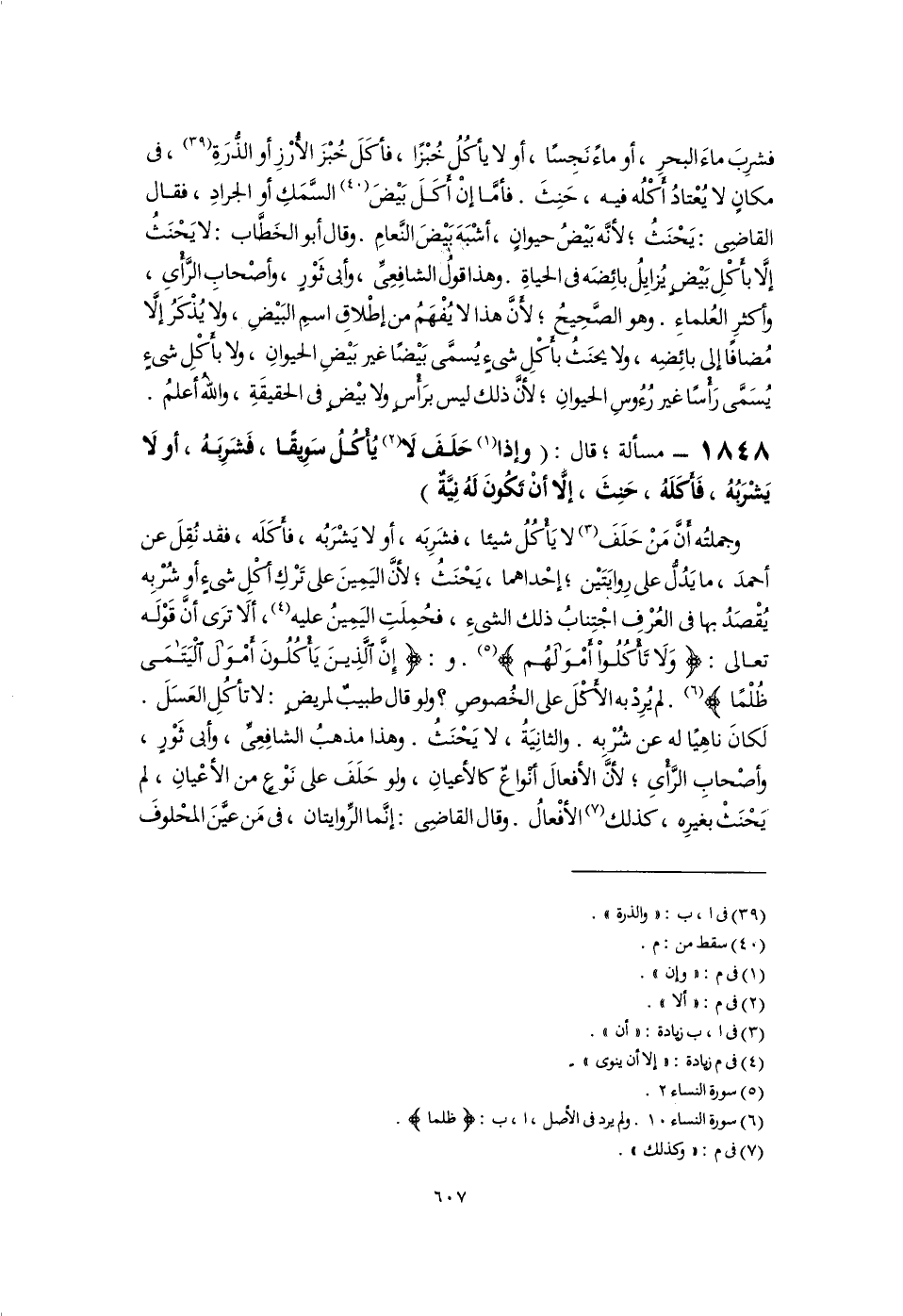 فشرِبَ ماءَ البحرِ، أو ماءً نَجِسًا، أو لا يأكُلُ خُبْزًا، فأكَلَ خُبْزَ الأُرْزِ أو الذُّرَةِ (٣٩)، فى مكانٍ لا يُعْتادُ أَكْلُه فيه، حَنِثَ. فأمَّا إِنْ أَكَلَ بَيْضَ (٤٠) السَّمَكِ أو الجرادِ، فقال القاضِى: يَحْنَثُ؛ لأنَّه بَيْضُ حيوانٍ، أشْبَهَ يَيْضَ النَّعامِ. وقال أبو الخَطَّاب: لا يَحْنَثُ إِلَّا بأَكْلِ بَيْضٍ يُزايِلُ بائِضَه فى الحياةِ. وهذا قولُ الشافِعِىِّ، وأبى ثَوْرٍ، وأصْحابِ الرَّأْىِ، أكثرِ العُلماءِ. وهو الصَّحِيحُ؛ لأنَّ هذا لا يُفْهَمُ من إطْلاقِ اسمِ البَيْضِ، ولا يُذْكَرُ إِلَّا مُضافًا إلى بائِضِه، ولا يحنَثُ بأَكْلِ شىءٍ يُسمَّى بَيْضًا غير بَيْضِ الحيوانِ، ولا بأَكْلِ شىءٍ يُسَمَّى رَأْسًا غير رُءُوسِ الحيوانِ؛ لأنَّ ذلك ليس برَأْسٍ ولا بيْضٍ فى الحقيقَةِ، واللَّهُ أعلمُ.