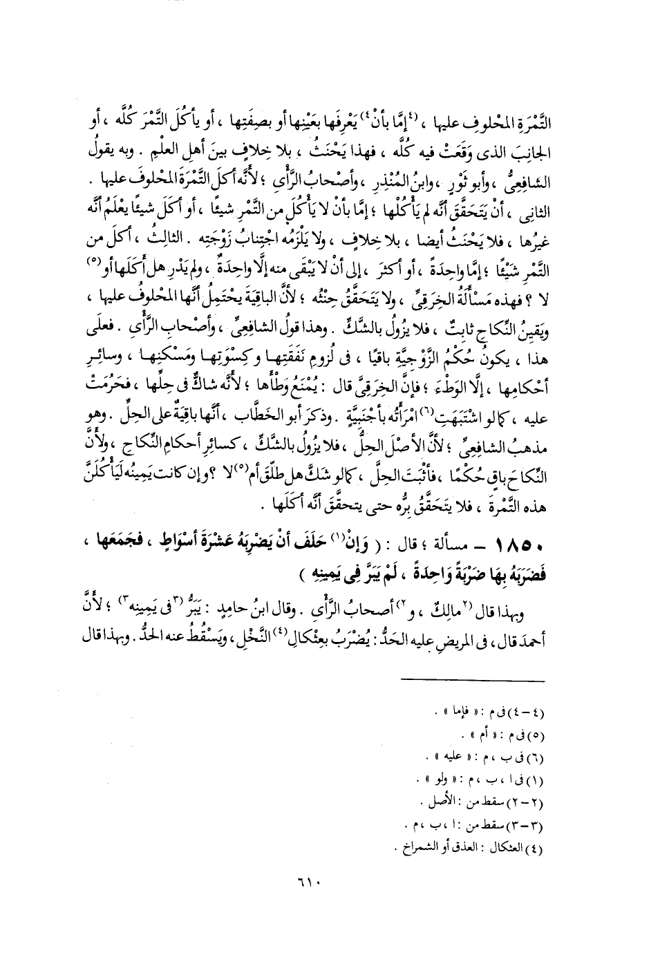 التَّمْرَةِ المحْلوفِ عليها، [إمَّا بأنْ] (٤) يَعْرِفَها بعَيْنِها أو بصِفَتِها، أو يأكُلَ التَّمْرَ كُلَّه، أو الجانِبَ الذى وَقَعَتْ فيه كُلَّه، فهذا يَحْنَثُ، بلا خِلافٍ بينَ أهلِ العلْمِ. وبه يقولُ الشَّافِعِىُّ، وأبو ثَوْرٍ، وابنُ المُنْذِرِ، وأصْحابُ الرَّأْىِ؛ لأَنَّه أكلَ التَّمْرَةَ المحْلوفَ عليها. الثانِى، أَنْ يَتَحَقَّقَ أنَّه لم يَأْكُلْها؛ إمَّا بأنْ لا يَأْكُلَ من التَّمْرِ شيئًا، أو أكَلَ شيئًا يعْلَمُ أنَّه غيرُها، فلا يَحْنَثُ أيضًا، بلا خِلافٍ، ولا يَلْزَمُه اجْتِنابُ زَوْجَتِه. الثالِثُ، أكلَ من التَّمْرِ شَيْئًا؛ إمَّا واحِدَةً، أو أكثرَ، إلى أَنْ لا يَبْقَى منه إِلَّا واحِدَةٌ، ولم يَدْرِ هل أَكَلَها أو (٥) لا؟ فهذه مَسْأَلَةُ الخِرَقِىِّ، ولا يَتَحَقَّقُ حِنْثُه؛ لأنَّ الباقِيَةَ يحْتَمِلُ أنَّها المحْلوفُ عليها، ويَقيِنُ النِّكاحِ ثابِتٌ، فلا يزُولُ بالشَّكِّ. وهذا قولُ الشافِعِىِّ، وأصْحابِ الرَّأْىِ. فعلَى هذا، يكونُ حُكْمُ الزَّوْجِيَّةِ باقيًا، فى لُزومِ نَفَقَتِها وكِسْوَتِها ومَسْكنِها، وسائِرِ أحْكامِها، إِلَّا الوَطْءَ؛ فإنَّ الخِرَقِىَّ قال: يُمْنَعُ وطْأَها؛ لأَنَّه شاكٌّ فى حِلِّها، فحَرُمَتْ عليه، كما لو اشْتَبَهَتِ (٦) امْرَأَتُه بأجْنَبيَّةٍ. وذكرَ أبو الخَطَّاب، أنَّها باقِيَةٌ على الحِلِّ. وهو مذهبُ الشافِعِىِّ؛ لأنَّ الأصْلَ الحِلُّ، فلا يزُولُ بالشَّكِّ، كسائِرِ أحكامِ النِّكاحِ، ولأَنَّ النِّكاحَ باقٍ حُكْمًا، فأثْبَتَ الحِلَّ، كما لو شَكَّ هل طلّقَ أم (٥) لا؟ وإن كانت يَمِينُه لَيَأْكُلَنَّ هذه التَّمْرةَ، فلا يتَحَقَّقُ بِرُّه حتى يتحقَّقَ أنَّه أكَلَها.