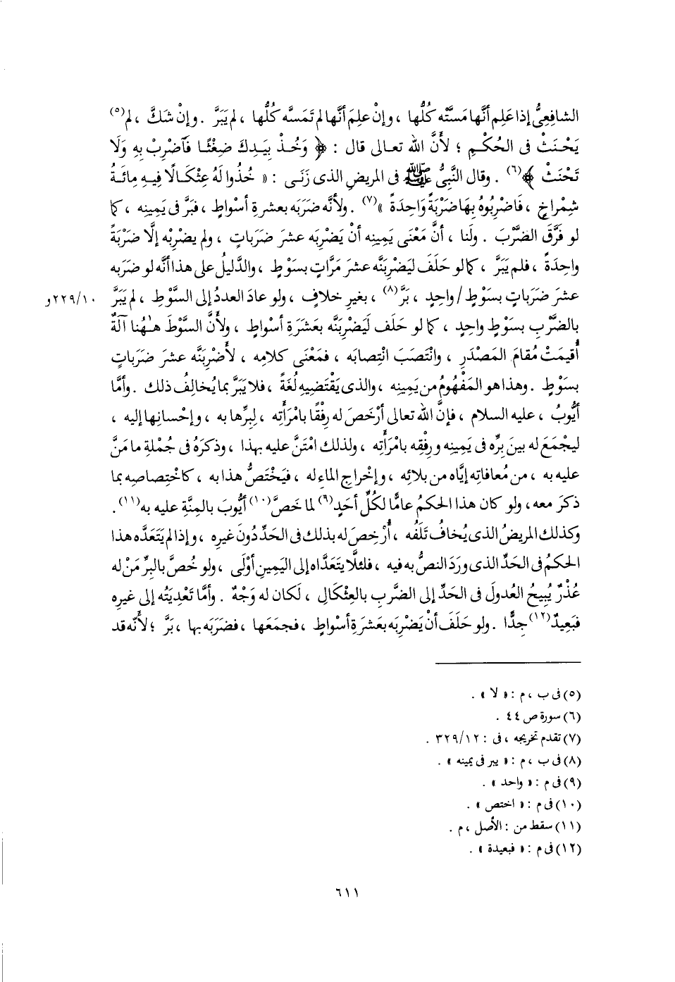 الشافِعِىُّ إذا عَلِم أنَّها مَسَّتْه كُلُّها، وإِنْ علِمَ أنَّها لم تَمَسَّه كُلُّها، لم يَبَرَّ. وإِنْ شَكَّ، لم (٥) يَحْنَثْ فى الحُكْمِ؛ لأَنَّ اللَّه تعالى قال: {وَخُذْ بِيَدِكَ ضِغْثًا فَاضْرِبْ بِهِ وَلَا تَحْنَثْ} (٦). وقال النَّبِىُّ -صلى اللَّه عليه وسلم- فى المريضِ الذى زَنَى: "خُذُوا لَهُ عِثْكَالًا فِيهِ مِائَةُ شِمْراخٍ، فَاضْرِبُوهُ بِهَا ضَرْبَةً وَاحِدَةً" (٧). ولأنَّه ضَرَبَه بعشرةِ أسْواطٍ، فبَرَّ فى يَمِينِه، كما لو فَرَّقَ الضَّرْبَ. ولَنا، أَنَّ مَعْنَى يَمِينِه أَنْ يَضْرِبَه عشرَ ضَرَباتٍ، ولم يضْرِبْه إِلَّا ضَرْبَةً واحِدَةً، فلم يَبَرَّ، كما لو حَلَفَ ليَضْرِبَنَّه عشرَ مَرَّاتٍ بسَوْطٍ، والدَّليلُ على هذا أنَّه لو ضَرَبه عشرَ ضَرَباتٍ بسَوْطٍ واحِدٍ، بَرَّ (٨)، بغيرِ خلافٍ، ولو عادَ العددُ إلى السَّوْطِ، لم يَبَرَّ بالضَّرْبِ بسَوْطٍ واحِدٍ، كما لو حَلَف لَيَضْرِبَنَّه بعَشَرَةِ أسْواطٍ، ولأنَّ السَّوْطَ ههُنا آلَةٌ أُقيمَتْ مُقامَ المَصْدَرِ، وانْتَصَبَ انْتِصابَه، فمَعْنَى كلامِه، لأَضْرِبَنَّه عشرَ ضَرَباتٍ بسَوْطٍ. وهذا هو المَفْهُومُ من يَمِينِه، والذى يَقْتَضِيهِ لُغَةً، فلا يَبَرَّ بما يُخالِفُ ذلك. وأمَّا أيُّوبُ، عليه السلام، فإِنَّ اللَّه تعالى أرْخَصَ له رِفْقًا بامْرَأَتِه، لِبِرِّها به، وإحْسانِها إليه، ليجْمَعَ له بينَ بِرِّه فى يَمِينِه ورِفْقِه بامْرَأَتِه، ولذلك امْتَنَّ عليه بهذا، وذكرَهُ فى جُمْلةِ ما مَنَّ عليه به، من مُعافاتِه إيَّاه من بلائِه، وإخْراجِ الماءِ له، فيَخْتَصُّ هذا به، كاخْتِصاصِه بما ذكرَ معه، ولو كان هذا الحكمُ عامًّا لكُلِّ أحَدٍ (٩) لما خَصَّ (١٠) أيُّوبَ بالمِنَّةِ عليه به (١١). وكذلك المريضُ الذى يُخافُ تَلَفُه، أُرْخِصَ له بذلك فى الحَدِّ دُونَ غيرِه، وإذا لم يَتَعَدَّه هذا الحكمُ فى الحَدِّ الذى ورَدَ النصُّ به فيه، فلئلَّا يتَعَدَّاه إلى اليَمِينِ أوْلَى، ولو خُصَّ بالبِرِّ مَنْ له عُذْرٌ يُبِيحُ العُدولَ فى الحَدِّ إلى الضَّربِ بالعِثْكَالِ، لَكان له وَجْهٌ. وأمَّا تَعْدِيَتُه إلى غيرِه فبَعِيدٌ (١٢) جِدًّا. ولو حَلَفَ أَنْ يَضْرِبَه بعَشرَةِ أسْواطٍ، فجمَعَها، فضَرَبَه بها، بَرَّ؛ لأَنّه قد