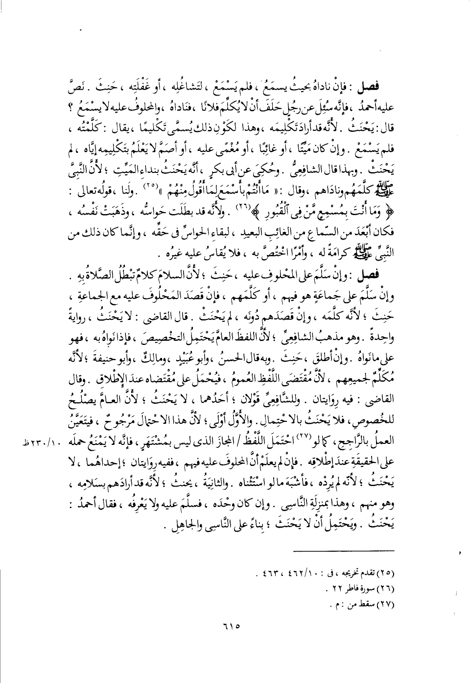 فصل: فإنْ ناداهُ بحيثُ يسمَعُ، فلم يَسْمَعْ، لتَشاغُلِه، أو غَفْلَتِه، حَنِثَ. نَصَّ عليه أحمدُ، فإنَّه سُئِلَ عن رجُلٍ حَلَفَ أَنْ لا يُكلِّمَ فلانًا، فنَاداهُ، والمحلوفُ عليه لا يسْمَعُ؟ قال: يَحْنَثُ. لأَنَّه قد أرادَ تَكْلِيمَه، وهذا لكَوْنِ ذلك يُسمَّى تَكْليمًا، يقال: كَلَّمْتُه، فلم يَسْمَعْ. وإِنْ كان مَيِّتًا، أو غائِبًا، أو مُغْمًى عليه، أو أصَمَّ لا يَعْلَمُ بتَكْلِيمِه إيَّاه، لم يَحْنَثْ. وبهذا قال الشافِعِىُّ. وحُكِىَ عن أبى بكرٍ، أنَّه يَحْنَثُ بنداءِ المَيِّتِ؛ لأَنَّ النَّبِىَّ -صلى اللَّه عليه وسلم- كلَّمَهُم ونادَاهم، وقال: "مَا أَنْتُمْ بأَسْمَعَ لِمَا أَقُولُ مِنْهُمْ" (٢٥). وَلنا، قولُه تعالى: {وَمَا أَنْتَ بِمُسْمِعٍ مَنْ فِى الْقُبُورِ} (٢٦). ولأَنَّه قد بطلَت حَواسُّه، وذَهَبَتْ نَفْسُه، فكان أبْعَدَ من السّماعِ من الغائِبِ البعيدِ، لبقاءِ الحواسِّ فى حَقِّه، وإنَّما كان ذلك من النَّبِىِّ -صلى اللَّه عليه وسلم- كرامَةً له، وأمْرًا اخْتُصَّ به، فلا يُقاسُ عليه غيرُه.