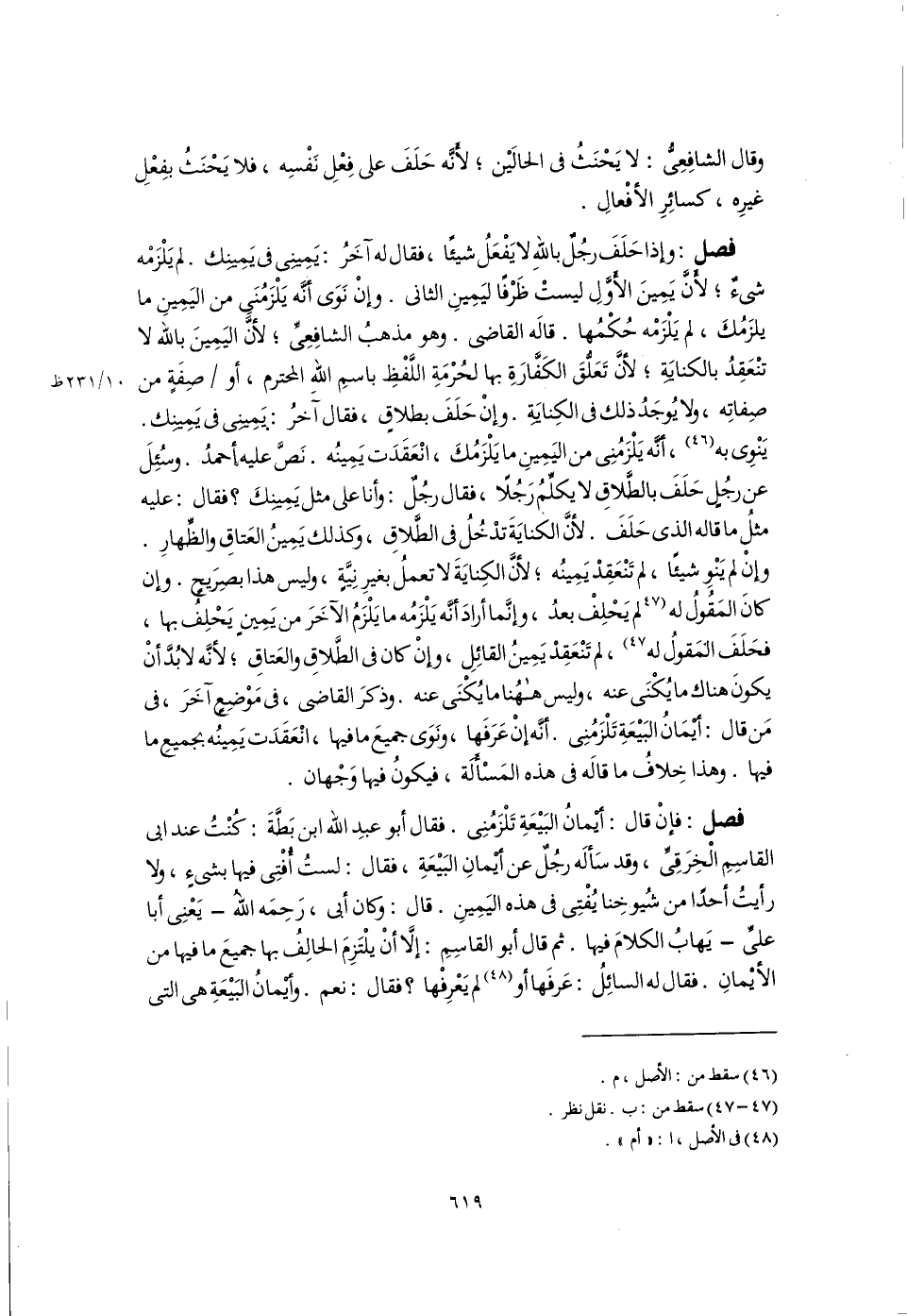 فصل: فإنْ قال: أيمانُ البَيْعَةِ تَلْزَمُنِى. فقال أبو عبدِ اللَّه ابن بَطَّةَ: كُنْتُ عند أبى القاسِمِ الْخِرَقِىِّ، وقد سَألَه رجُلٌ عن أيْمانِ البَيْعَةِ، فقال: لستُ أُفْتِى فيها بشىءٍ، ولا رأيتُ أحدًا من شُيوخِنا يُفْتِى فى هذه اليَمِينِ. قال: وكان أبى، رَحِمَه اللَّه -يَعْنِى أبا علىٍّ- يَهابُ الكلامَ فيها. ثم قال أبو القاسِمِ: إِلَّا أَنْ يلْتَزِمَ الحالِفُ بها جميعَ ما فيها من الأيمانِ. فقال له السائِلُ: عَرفَها أو (٤٨) لم يَعْرِفْها؟ فقال: نعم. وأيْمانُ البَيْعَةِ هى التى