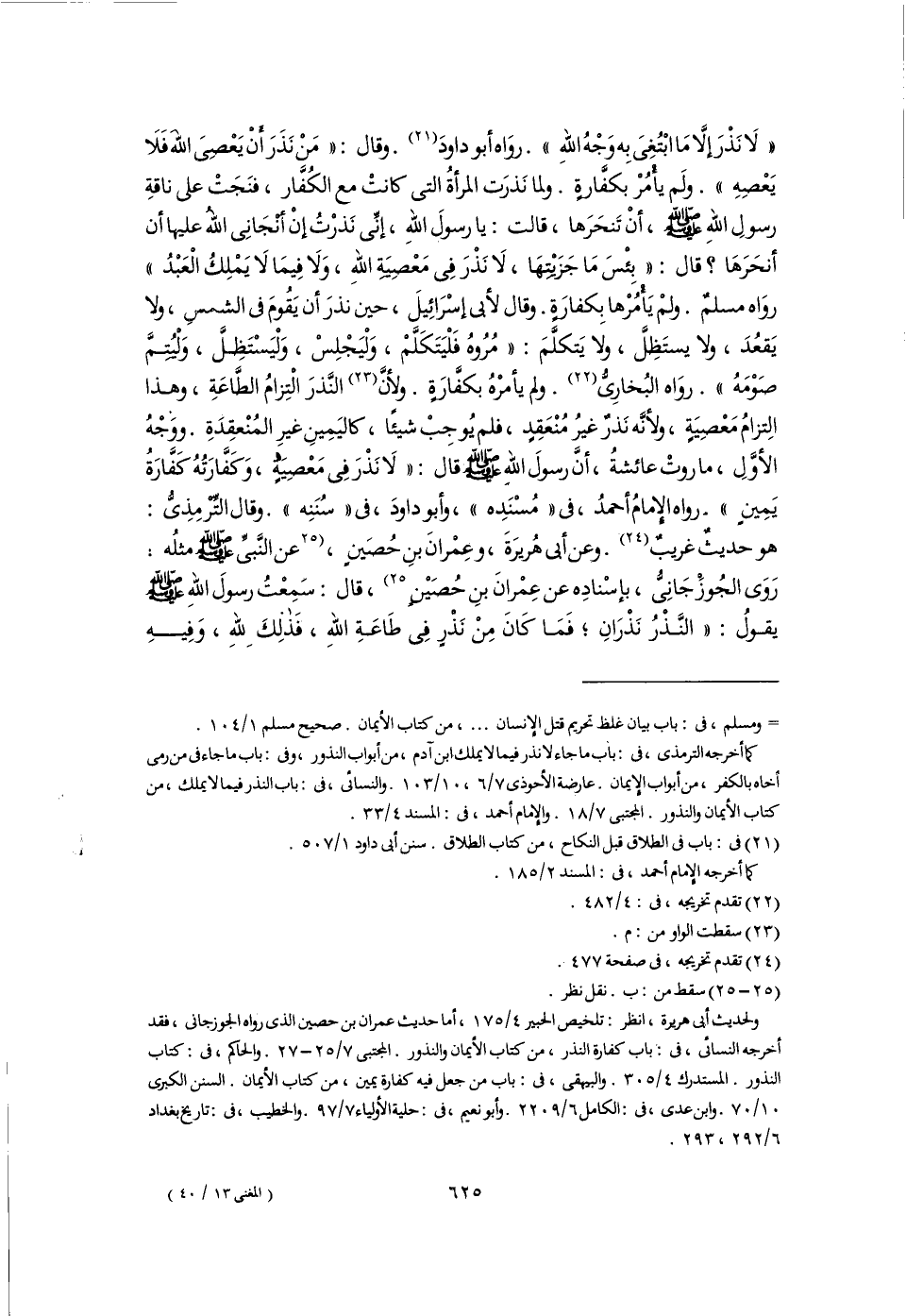 "لَا نَذْرَ إلا مَا ابْتُغِيَ به وَجْهُ اللَّه". روَاه أبو داودَ (٢١). وقال: "مَنْ نَذَرَ أَنْ يَعْصِىَ اللَّهَ فَلَا يَعْصِهِ". ولَم يأْمُرْ بَكفَّارةٍ. ولما نَذرَت المرأةُ التى كانتْ مع الكُفَّار، فنَجَتْ على ناقةِ رسولِ اللَّهِ -صلى اللَّه عليه وسلم-، أَنْ تَنحَرَها، قالت: يا رسولَ اللَّهِ، إنِّى نَذرْتُ إِنْ أنْجَانِى اللَّهُ عليها أن أنحَرَهَا؟ قال: "بِئْس مَا جَزَيتهَا، لَا نَذْرَ فِى مَعْصِيَةِ اللَّهِ، وَلَا فِيمَا لَا يَمْلِكُ الْعَبْدُ" روَاه مسلمٌ. ولمْ يَأمُرْها بِكفَّارَة. وقال لأبى إسْرَائِيلَ، حين نذرَ أن يَقُومَ فى الشمسِ، ولا يَقعُدَ، ولا يستَظِل، ولا يَتكلَّمَ: "مُرُوهُ فَلْيَتَكَلَّمْ، وَلْيَجْلِسْ، وَلْيَسْتَظِلَّ، وَلْيُتِمَّ صَوْمَهُ". روَاه البُخارِىُّ (٢٢). ولم يأمرْهُ بكفَّارَةٍ. ولأنَّ (٢٣) النَّذرَ الْتِزامُ الطَّاعَةِ، وهذا التِزامُ مَعْصِيَةٍ، ولأنَّه نَذرٌ غيرُ مُنْعَقِدٍ، فلم يُوجِبْ شيئًا، كاليَمِينِ غيرِ المُنْعقِدَةِ. ووَجْهُ الأوَّلِ، ما روتْ عائشةُ، أَنَّ رسولَ اللَّهِ -صلى اللَّه عليه وسلم- قال: "لَا نَذْرَ فِى مَعْصِيَةٍ، وَكَفَّارَتُهُ كَفَّارَةُ يَمِينٍ" رواه الإِمامُ أحمدُ، فى "مُسْنَدِه"، وأبو داودَ، فى "سُنَنِه"، وقال التِّرْمِذِىُّ: هو حديثٌ غريبٌ (٢٤). وعن أبى هُريرَةَ، وعِمْرانَ بنِ حُصَينٍ، [عن النَّبىِّ -صلى اللَّه عليه وسلم- مثلُه: رَوَى الجُوزجَانِىُّ، بإسْنادِه عن عِمْرانَ بنِ حُصَيْنٍ] (٢٥)، قال: سَمِعْتُ رسولَ اللَّهِ -صلى اللَّه عليه وسلم- يقولُ: "النَّذْرُ نَذْرَانِ؛ فَمَا كَانَ مِنْ نَذْرِ فِى طَاعَةِ اللَّهِ، فَذلِكَ لِلَّهِ، وَفِيهِ