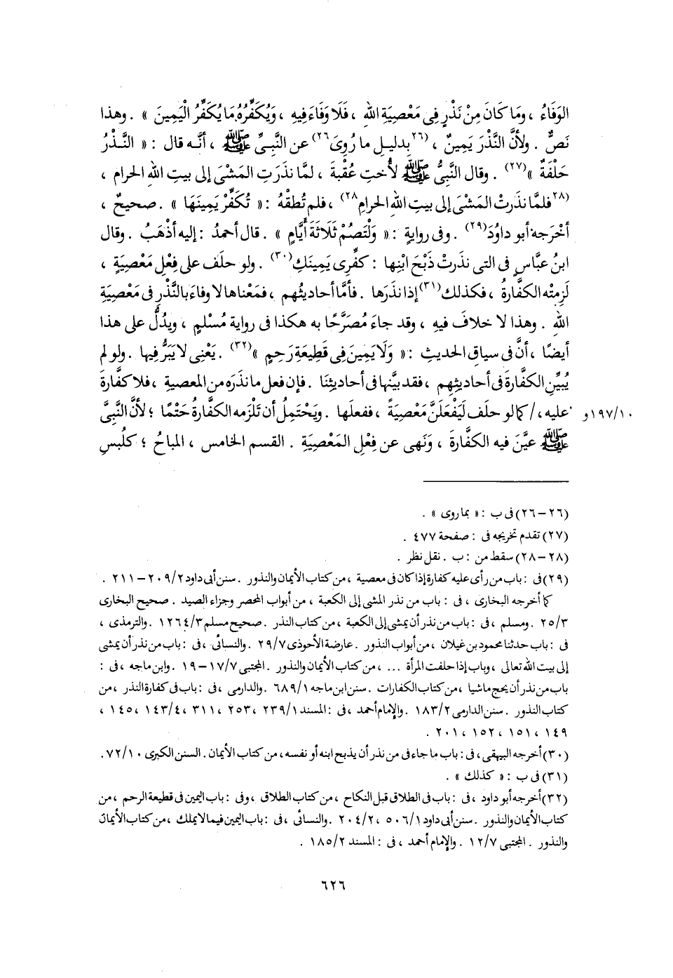 الوَفَاءُ، ومَا كَانَ مِنْ نَذْرٍ فِى مَعْصِيَةِ اللَّهِ، فَلَا وَفَاءَ فِيهِ، وَيُكَفِّرُهُ، مَا يُكَفِّرُ الْيَمِينَ". وهذا نَصٌّ. ولأنَّ النَّذْرَ يَمِينٌ، [بدليلِ ما رُوِىَ] (٢٦) عن النَّبِىِّ -صلى اللَّه عليه وسلم-، أنَّه قال: "النَّذْرُ حَلْفَةٌ" (٢٧). وقال النَّبِىُّ -صلى اللَّه عليه وسلم- لأُختِ عُقْبةَ، لمَّا نذَرَتِ المَشْىَ إلى بيتِ اللَّهِ الحرام، [فلمَّا نذرتْ المَشْىَ إلى بيتِ اللَّهِ الحرامِ] (٢٨)، فلم تُطقْهُ: "تُكَفِّرْ يَمِينَهَا". صحيحٌ، أخْرَجة أبو داوُدَ (٢٩). وفى روايةٍ: "وَلْتَصُمْ ثَلَاثَةَ أيامٍ". قال أحمدُ: إليه أذْهَبُ. وقال ابنُ عبَّاسٍ فى التى نذَرتْ ذَبْحَ ابْنِها: كفِّرِى يَمِينَكِ (٣٠). ولو حلَف على فِعْلِ مَعْصِيَةٍ، لَزِمتْه الكفَّارةُ، فكذلك (٣١) إذا نذَرَها. فأمَّا أحاديثُهم، فمَعْناها لا وفاءَ بالنَّذْر فى مَعْصِيَةِ اللَّهِ. وهذا لا خلافَ فيهِ، وقد جاءَ مُصَرَّحًا به هكذا فى رواية مُسْلمٍ، ويدُلُّ على هذا أيضًا، أَنَّ فى سياقِ الحديثِ: "وَلَا يَمِينَ فِى قَطِيعَةِ رَحِمٍ" (٣٢). يَعْنِى لا يَبَرُّ فِيها. ولو لم يُبيِّنِ الكفَّارةَ فى أحاديثهِم، فقد بيَّنها فى أحاديثنا. فإن فعل ما نذَرَه من المعصيةِ، فلا كفَّارةَ عليه، كما لو حلَف لَيَفْعَلَنَّ مَعْصِيَةً، ففعلَها. ويَحْتَمِلُ أن تَلْزَمه الكفَّارةُ حَتْمًا؛ لأنَّ النَّبِىَّ -صلى اللَّه عليه وسلم- عيَّنَ فيه الكفَّارةَ، وَنَهى عن فِعْل المَعْصِيَةِ. القسم الخامس، المباحُ؛ كلُبسِ