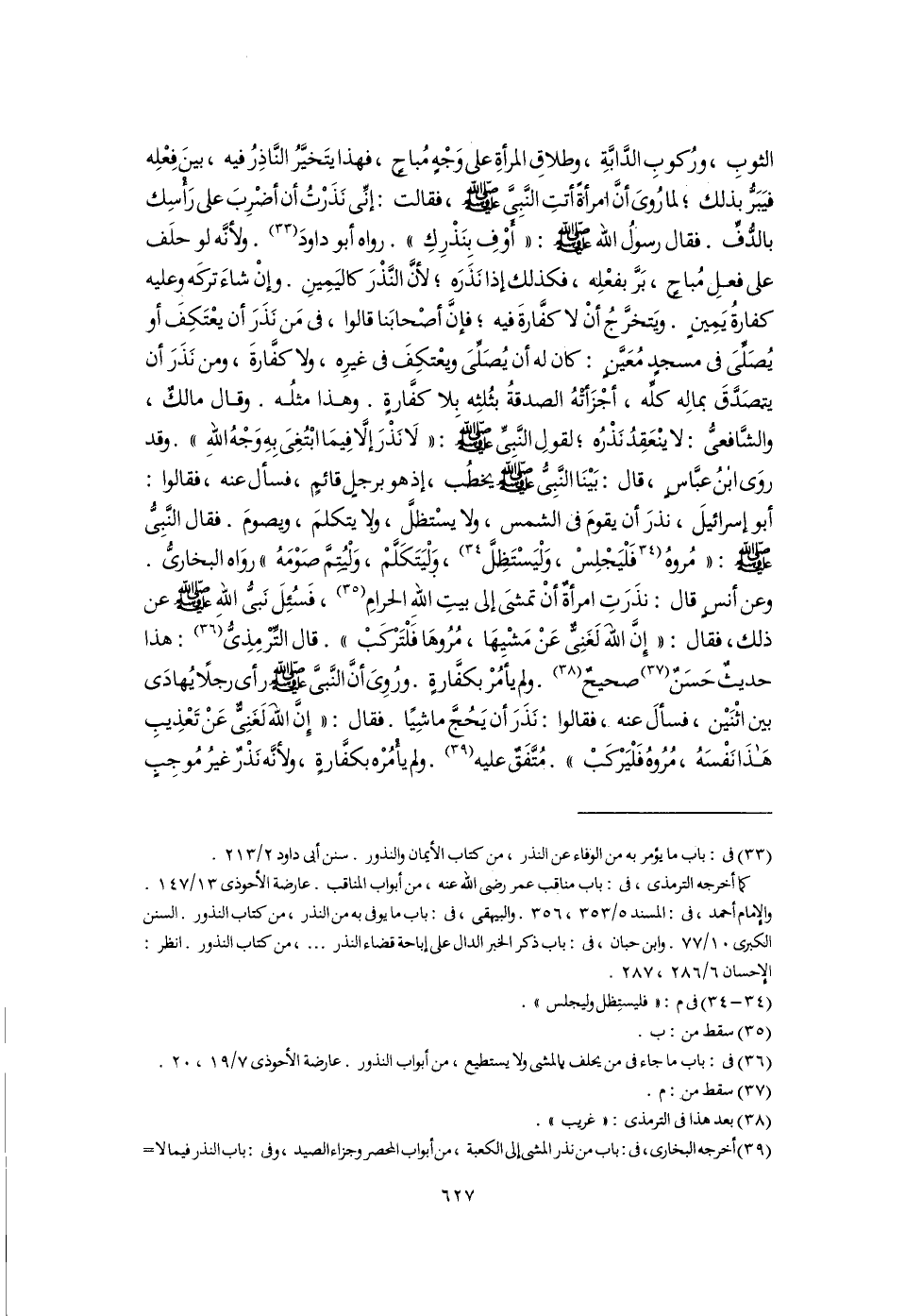 الثوبِ، ورُكوبِ الدَّابَّةِ، وطلاقِ المرأةِ على وَجْهٍ مُباحٍ، فهذا يتَخيَّرُ النَّاذِرُ فيه، بينَ فِعْلِه فيَبَرُّ بذلك؛ لما رُوىَ أَنَّ أمرأة أتتِ النَّبِىَّ -صلى اللَّه عليه وسلم-، فقالت: إنِّى نَذَرْتُ أن أضْرِبَ على رَأْسِك بالدُّفِّ. فقال رسولُ اللَّه -صلى اللَّه عليه وسلم-: "أوْفِ بِنَذْرِكِ". رواه أبو داودَ (٣٣). ولأنَّه لو حلَف على فعلِ مُباحٍ، بَرَّ بفعْلِه، فكذلك إذا نَذَرَه؛ لأنَّ النَّذْرَ كاليَمِينِ. وإِنْ شاءَ تركَه وعليه كفارةُ يَمِينٍ. ويَتخرَّجُ أَنْ لا كفَّارةَ فيه؛ فإِنَّ أصْحابَنا قالوا، فى مَن نَذَرَ أن يعْتَكِفَ أو يُصَلِّىَ فى مسجدٍ مُعَيَّنٍ: كان له أن يُصَلِّىَ ويعْتكِفَ فى غيرِه، ولا كفَّارةَ، ومن نَذَرَ أن يتصدَّقَ بمالِه كلِّه، أجْزَأتْهُ الصدقةُ بثُلثِه بلا كفَّارةٍ. وهذا مثلُه. وقال مالكٌ، والشَّافعىُّ: لا ينْعَقِدُ نَذْرُه؛ لقولِ النَّبِىِّ -صلى اللَّه عليه وسلم-: "لَا نَذْرَ إِلَّا فِيمَا ابْتُغِىَ بِهِ وَجْهُ اللَّهِ". وقد روَى ابنُ عبَّاسٍ، قال: بَيْنَا النَّبِىُّ -صلى اللَّه عليه وسلم- يخطُب، إذ هو برجلٍ قائمٍ، فسأل عنه، فقالوا: أبو إسرائيلَ، نذرَ أن يقومَ فى الشمس، ولا يسْتظلَّ، ولا يتكلمَ، ويصومَ. فقال النَّبِىُّ -صلى اللَّه عليه وسلم-: "مُروهُ [فَلْيَجْلِسْ، وَلْيَسْتَظِلَّ] (٣٤)، وَليَتَكَلَّمْ، وَلْيُتمَّ صَوْمَهُ" روَاه البخارىُّ. وعن أنسٍ قال: نذَرَتِ امرأةٌ أَنْ تمشيَ إلى بيتِ اللَّهِ الحرامِ (٣٥)، فَسُئِلَ نَبىُّ اللَّهِ -صلى اللَّه عليه وسلم- عن ذلك، فقال: "إِنَّ اللَّه لَغَنِىٌّ عَنْ مَشْيهَا، مُرُوهَا فَلْتَرْكَبْ". قال التِّرْمِذِىُّ (٣٦): هذا حديثٌ حَسَنٌ (٣٧) صحيحٌ (٣٨). ولم يأمُرْ بكفَّارةٍ. ورُوِىَ أَنَّ النَّبىَّ -صلى اللَّه عليه وسلم- رأى رجلًا يُهادَى بين اثْنَين، فسألَ عنه، فقالوا: نَذَرَ أن يَحُجَّ ماشِيًا. فقال: "إِنَّ اللَّه لَغَنِىٌّ عَنْ تَعْذِيبِ هَذَا نَفْسَهُ، مُرُوهُ فَلْيَرْكَبْ". مُتَّفَقٌ عليه (٣٩). ولم يأمُرْه بكفَّارةٍ، ولأنَّه نَذرٌ غيرُ مُوجِبٍ