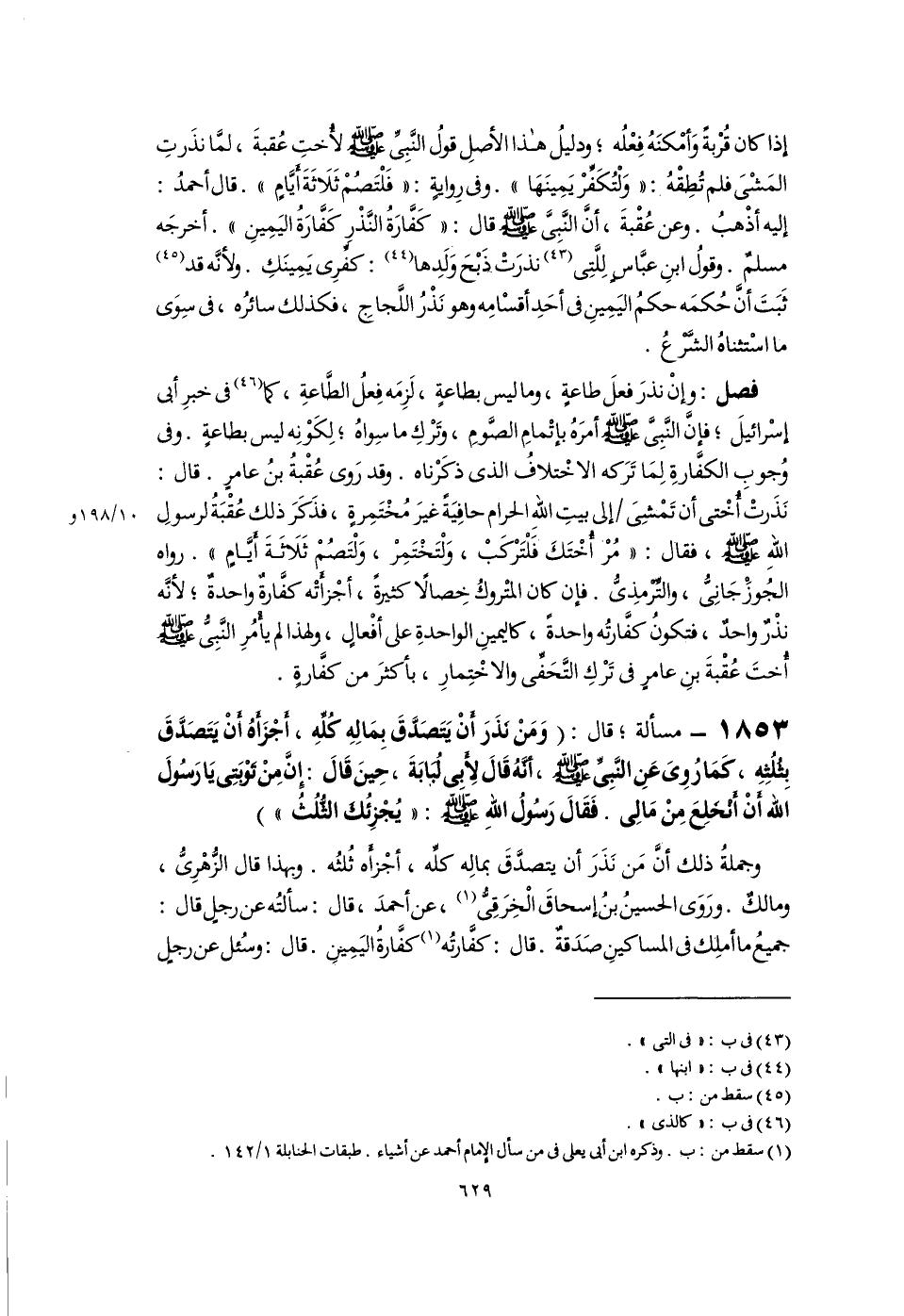 فصل: وإِنْ نذرَ فعلَ طاعةٍ، وما ليس بطاعةٍ، لَزِمَه فِعلُ الطَاعةِ، كما (٤٦) فى خبرِ أبى إسْرائيلَ؛ فإِنَّ النَّبِىَّ -صلى اللَّه عليه وسلم- أمرَهُ بإتْمامِ الصَّومِ، وترْكِ ما سِواهُ، لِكَوْنِه ليس بطاعةٍ. وفى وُجوبِ الكفَّارةِ لِمَا تَرَكه الاخْتلافُ الذى ذكَرْناه. وقد رَوى عُقْبةُ بنُ عامرٍ. قال: نَذَرتْ أخْتى أن تَمْشِىَ إلى بيتِ اللَّهِ الحرام حافِيَةً غيرَ مُخْتَمِرةٍ، فذَكَرَ ذلك عُقْبَةُ لرسولِ اللَّهِ -صلى اللَّه عليه وسلم-، فقال: "مُرْ أُخْتَكَ فَلْتَرْكَبْ، وَلْتَخْتَمِرْ، وَلْتَصُم ثَلَاثَةَ أيَّامٍ". رواه الجُوزجَانِىُّ، والتِّرْمذِىُّ. فإن كان المتْروكُ خِصالًا كثيرةً، أجْزأَتْه كفَّارةٌ واحدةٌ؛ لأنَّه نذْرٌ واحدٌ، فتكونُ كفَّارتُه واحدةً، كاليمينِ الواحدةِ على أفْعالٍ، ولهذا لم يأْمُرِ النَّبِىُّ -صلى اللَّه عليه وسلم- أُختَ عُقْبةَ بنِ عامرٍ فى تَرْكِ التَّحَفِّى والاخْتِمارِ، بأكثرَ من كفَّارةٍ.