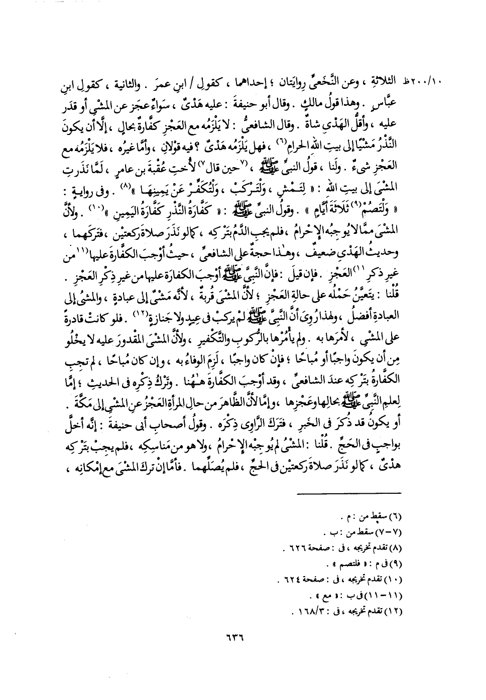 الثلاثةِ، وعن النَّخَعىِّ رِوايَتان؛ إحداهما، كقولِ ابنِ عمرَ. والثانية، كقولِ ابنِ عبَّاسٍ. وهذا قولُ مالكٍ. وقال أبو حنيفةَ: عليه هَدْىٌ، سَواء عجز عن المشْى أو قدَر عليه، وأقلُّ الهَدْى شاةٌ. وقال الشافعىُّ: لا يَلْزَمُه مع العَجْزِ كفَّارةٌ بحالٍ، إِلَّا أن يكونَ النَّذْرُ مَشْيًا إلى بيتِ اللَّهِ الحرامِ (٦)، فهل يَلْزَمُه هَدْىٌ؟ فيه قوْلانِ، وأمَّا غيرُه، فلا يَلْزَمُه مع العَجْزِ شىءٌ. ولَنا، قولُ النبىِّ -صلى اللَّه عليه وسلم-، [حين قال] (٧) لأُختِ عُقْبةَ بن عامرٍ، لَمَّا نَذَرتِ المشْىَ إلى بيتِ اللَّه: "لِتَمْشِ، وَلْتَرْكَبْ، وَلْتُكَفِّرْ عَنْ يَمِينِهَا" (٨). وفى روايةٍ: "وَلْتَصُمْ (٩) ثَلَاثَةَ أيَّامٍ". وقولُ النبىِّ -صلى اللَّه عليه وسلم-: "كَفَّارَةُ النَّذْرِ كَفَّارَةُ اليَمِينِ" (١٠). ولأنَّ المشْىَ ممَّا لا يُوجِبُه الإِحْرامُ، فلم يجبِ الدَّمُ بتَرْكِه، كما لو نَذَرَ صلاةَ ركعتيْن، فتَركَهما، وحديثُ الهَدْى ضعيفٌ، وهذا حجة على الشافعىِّ، حيثُ أوْجبَ الكفَّارةَ عليها [من غيرِ ذكرِ] (١١) العَجْزِ. فإن قيلَ: فإِنَّ النَّبِىَّ -صلى اللَّه عليه وسلم- أوْجبَ الكفارَة عليها من غيرِ ذِكْرِ العَجْزِ. قُلْنا: يتَعيَّنُ حَمْلُه على حالةِ العَجْزِ؛ لأنَّ المشْىَ قُربة؛ لأنَّه مَشْى إلى عبادةٍ، والمشىُ إلى العبادةِ أفضلُ، ولهذا رُوِىَ أَنَّ النَّبِىَّ -صلى اللَّه عليه وسلم- لمْ يركبْ فى عِيدٍ ولا جَنازةٍ (١٢). فلو كانتْ قادرةً على المشْىِ، لأمرَها به. ولم يأمُرْها بالرُّكوبِ والتَّكْفيرِ، ولأنَّ المشْىَ المقْدورَ عليه لا يخْلُو مِن أن يكونَ واجبًا أو مُباحًا؛ فإنْ كان واجبًا، لَزِمَ الوفاءُ به، وإن كان مُباحًا، لم تجِب الكفَّارة بتَرْكِه عندَ الشافعىِّ، وقد أوْجبَ الكفَّارةَ ههُنا. وتَرْكُ ذِكْرِه فى الحديثِ؛ إمَّا لِعلمِ النَّبِىِّ -صلى اللَّه عليه وسلم- بحالِها وعَجْزِها، وإمَّا لأنَّ الظَّاهرَ من حالِ المرأةِ العَجْزُ عنِ المشْى إلى مَكَّةَ. أو يكونُ قد ذُكرَ فى الخَبرِ، فتَرَكَ الرَّاوِى ذِكْرَه. وقولُ أصحابِ أبى حنيفةَ: إنَّه أخلَّ بواجبٍ فى الحَجِّ. قُلْنا: المشْىُ لم يُوجِبْه الإحْرامُ، ولا هو من مَناسِكِه، فلم يجِبْ بتَرْكِه هدْىٌ، كما لو نَذرَ صلاةَ ركعتيْن فى الحجِّ، فلم يُصَلِّهما. فأمَّا إِنْ تركَ المشْىَ مع إمْكانِه،