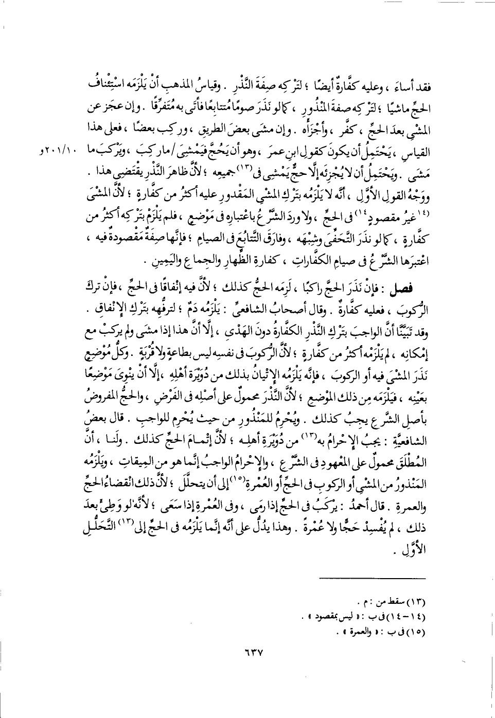 فصل: فإنْ نَذَرَ الحجَّ راكبًا، لَزِمَه الحجُّ كذلك؛ لأنَّ فيه إنْفاقًا فى الحجِّ، فإنْ تركَ الرُّكوبَ، فعليه كفَّارة. وقال أصحابُ الشافعىِّ: يَلْزَمُه دَمٌ؛ لترفُّهِه بتَرْكِ الإِنْفاقِ. وقد تَبَيَّنَّا أَنَّ الواجبَ بتَرْكِ النَّذْرِ الكفَّارةُ دونَ الهَدْى، إلا أَنَّ هذا إذا مشَى ولم يركبْ مع إمْكانهِ، لم يَلْزَمْه أكثُر من كفَّارةٍ؛ لأنَّ الرُّكُوبَ فى نفسِه ليس بطاعةٍ ولا قُرْبَةٍ. كل مُوْضِعٍ نَذَرَ المشْىَ فيه أو الركوبَ، فإنَّه يَلْزَمُه الإتْيانُ بذلك من دُوَيْرَة أهْلِهِ، إِلَّا أَنْ ينْوِىَ مَوْضِعًا بعَيْنِه، فيَلْزَمَه مِن ذلك الموْضعِ؛ لأنَّ النَّذْرَ محمولٌ على أصْلِه فى الفَرْضِ، والحجُّ المفروضُ بأصلِ الشَّرْعِ يجِبُ كذلك. ويُحْرِمُ للمَنْذُورِ من حيث يُحْرِم للواجبِ. قال بعضُ الشافعيَّة: يجبُ الإِحْرامُ به (١٣) من دُويْرَةِ أهلِه؛ لأنَّ إتْمامَ الحجِّ كذلك. ولَنا، أَنَّ المُطْلَقَ محمولٌ على المعْهودِ فى الشَّرْعِ، والإِحْرامُ الواجبُ إنَّما هو من المِيقاتِ، ويَلْزَمُه المَنْذورُ من المشْىِ أو الركوبِ فى الحجِّ أو العُمْرةِ (١٥) إلى أن يتحلَّلَ؛ لأنَّ ذلك انْقضاءُ الحجِّ والعمرةِ. قال أحمدُ: يرْكَبُ فى الحجِّ إذا رمَى، وفى العُمْرةِ إذا سَعَى؛ لأنَّه لو وَطِئَ بعدَ ذلك، لم يُفْسِدْ حَجًّا ولا عُمْرةً. وهذا يدُلُّ على أَنَّه إنَّما يَلزَمُه فى الحجِّ إلى (١٣) التَّحَلُّلِ الأوَّلِ.