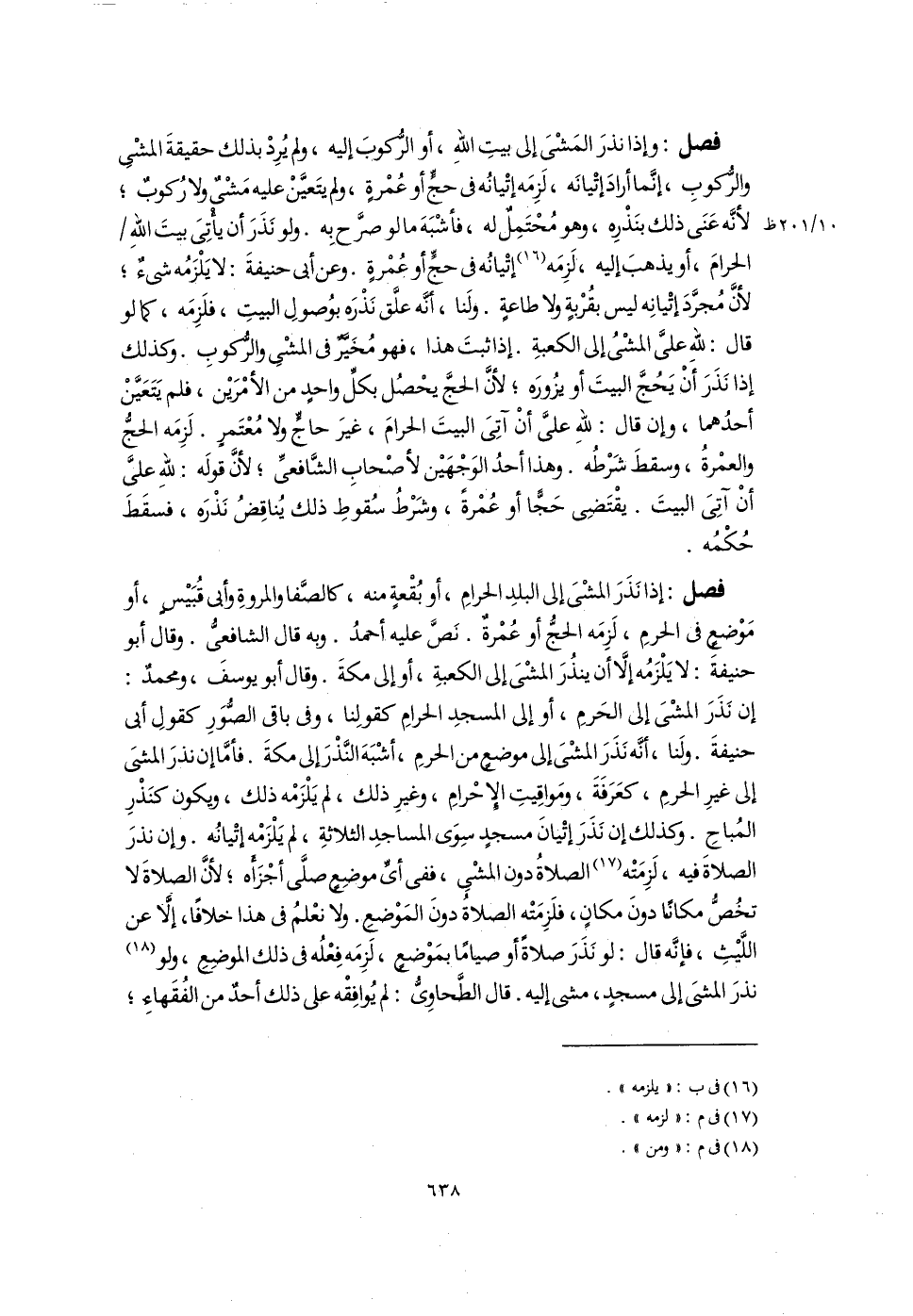 فصل: إذا نَذَرَ المشْىَ إلى البلدِ الحرامِ، أو بُقْعةٍ منه، كالصَّفا والمروةِ وأبى قُبَيْسٍ، أو مَوْضعٍ فى الحرمِ، لَزِمَه الحجُّ أو عُمْرةٌ. نَصَّ عليه أحمدُ. وبه قال الشافعىُّ. وقال أبو حنيفةَ: لا يَلْزَمُه إِلَّا أن ينذُرَ المشْىَ إلى الكعبةِ، أو إلى مكةَ. وقال أبو يوسفَ، ومحمدٌ: إن نَذَرَ المشْىَ إلى الحَرمِ، أو إلى المسجدِ الحرامِ كقولِنا، وفى باقى الصُّوَرِ كقولِ أبى حنيفةَ. ولَنا، أنَّه نَذَرَ المشْىَ إلى موضعٍ من الحرمِ، أشْبَهَ النَّذْرَ إلى مكةَ. فأمَّا إن نذرَ المشىَ إلى غيرِ الحرمِ، كعَرَفَةَ، ومَواقِيتِ الإِحْرامِ، وغيرِ ذلك، لم يَلْزَمْه ذلك، ويكون كنَذْرِ المُباحِ. وكذلك إن نَذَرَ إتْيانَ مسجدٍ سِوَى المساجدِ الثلاثةِ، لم يَلْزَمْه إتْيانُه. وإن نذرَ الصلاةَ فيه، لَزِمَتْه (١٧) الصلاةُ دون المشْى، ففى أىِّ موضِعٍ صلَّى أَجْزَأَه؛ لأنَّ الصلاةَ لا تخُصُّ مكانًا دونَ مكانٍ، فلَزِمَتْه الصلاةُ دونَ المَوْضعِ. ولا نعْلمُ فى هذا خلافًا، إِلَّا عن اللَّيْثِ، فإنَّه قال: لو نَذَرَ صلاةً أو صيامًا بمَوْضع، لَزِمَه فِعْلُه فى ذلك الموضِعِ، ولو (١٨) نذرَ المشىَ إلى مسجدٍ، مشى إليه. قال الطَّحاوِىُّ: لم يُوافِقْه على ذلك أحدٌ من الفُقَهاءِ؛