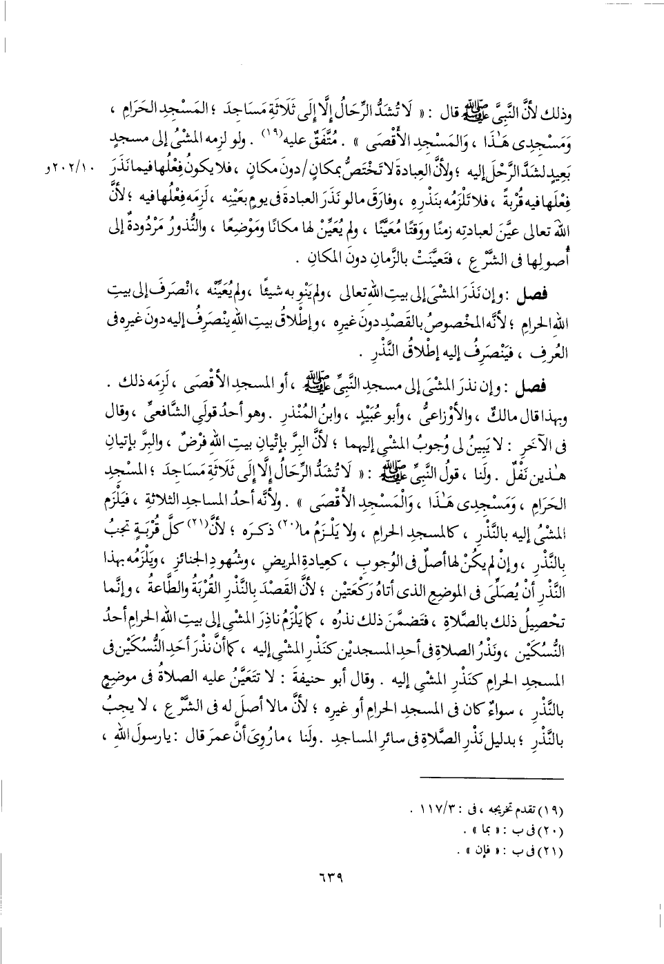 وذلك لأنَّ النَّبِىَّ -صلى اللَّه عليه وسلم- قال: "لَا تُشَدُّ الرِّحَالُ إِلَّا إِلَى ثَلَاثَةِ مَسَاجِدَ، المَسْجِدِ الحَرَامِ، وَمَسْجِدِى هَذَا، وَالمَسْجِدِ الأَقْصَى". مُتَّفَقٌ عليه (١٩). ولو لزِمه المشْىُ إلى مسجدٍ بَعِيدٍ لشَدَّ الرَّحْلَ إليه، ولأنَّ العِبادةَ لا تَخْتَصُّ بمكانٍ دونَ مكانٍ، فلا يكونُ فِعْلُها فيما نَذَرَ فِعْلَها فيه قُرْبةً، فلا تَلْزَمُه بنَذْرِهِ، وفارَقَ ما لو نَذَرَ العبادةَ فى يومٍ بعَيْنِه، لَزِمَه فِعْلُها فيه؛ لأنَّ اللَّهَ تعالى عيَّنَ لعبادتِه زمنًا ووَقتًا مُعَيَّنًا، ولم يُعَيِّنْ لها مكانًا ومَوْضِعًا، والنُّذورُ مَرْدُودةٌ إلى أُصولِها فى الشَّرْعِ، فتَعيَّنَتْ بالزَّمانِ دونَ المكانِ.