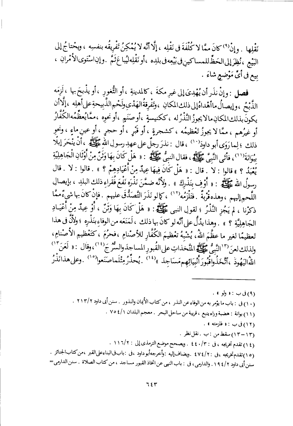 فصل: وإِنْ نذَر أن يُهْدِىَ إلى غيرِ مكةَ، كالمدينةِ، أو الثُّغورِ، أو يذْبحَ بها، لَزِمَه الذَّبْحُ، وإيصالُ ما أهْداهُ إلى ذلك المكانِ، وتَفْرِقةُ الهَدْى ولَحْمِ الذَّبِيحةِ على أهلِه، إِلَّا أن يكون بذلك المكانِ ما لا يجوزُ النَّذْرُ له، ككنيسةٍ، أو صنَمٍ، أو نَحوِه، ممَّا يُعظِّمُه الكُفَّارُ أو غيرُهم، ممَّا لا يجوزُ تَعْظيمُه، كشجرةٍ، أو قَبْرٍ، أو حجرٍ، أو عينِ ماءٍ، ونحوِ ذلك؛ لِما رَوَى أبو داودَ (١٠)، قال: نذرَ رجلٌ على عهدِ رسولَ اللَّهِ -صلى اللَّه عليه وسلم-، أَنْ ينْحَرَ إبلًا بِبُوَانَةَ (١١)، فأتَى النَّبِىَّ -صلى اللَّه عليه وسلم-، فقال النبىُّ -صلى اللَّه عليه وسلم-: "هَلْ كَانَ بِهَا وَثَنٌ مِنْ أوْثَانِ الْجَاهِلِيّةِ يُعْبَدُ؟ " قالوا: لا. قال: "هَلْ كَانَ فِيهَا عِيدٌ مِنْ أعْيَادِهِمْ؟ ". قالوا: لا. قال رسولُ اللَّه -صلى اللَّه عليه وسلم-: "أَوْفِ بِنَذْرِكَ". ولأنَّه ضمَّنَ نَذْرَه نَفْعَ فُقَراءِ ذلك البلدِ، بإيصالِ اللَّحمِ إليهم، وهذه قُرْبةٌ. فتَلْزَمُه (١٢)، كما لو نَذَرَ التَّصَدُّقَ عليهم. فإنْ كانَ بها شىءٌ ممَّا ذكرْنا، لم يَجُزِ النَّذْرُ، لقولِ النبىّ -صلى اللَّه عليه وسلم-: "هَلْ كَانَ بِهَا وَثَنٌ، أَوْ عِيدٌ مِنْ أعْيَادِ الجَاهِلِيَّةِ؟ ". وهذا يدُلُّ على أَنَّه لو كانَ بها ذلك، لَمَنَعَه من الوفاءِ بنَذْرِه، ولأنَّ فى هذا تَعظيمًا لغير ما عظَّمَ اللَّهُ، يُشْبِهُ تعْظيمَ الكُفَّارِ للأصْنامِ، فحرُمَ، كتَعْظيمِ الأصْنامِ، ولذلك لعنَ [النَّبِىُّ -صلى اللَّه عليه وسلم- المُتَّخذاتِ على القُبورِ المساجدَ والسُّرُجَ (١٤)، وقال: "لَعَنَ] (١٣) اللَّهُ اليَهُودَ، اتَّخَذُوا قُبُورَ أنْبِيَائِهِم مَسَاجِدَ" (١٤). يُحذِّرُ مِثْلَما صَنَعوا (١٥). وعلى هذا نَذْرُ