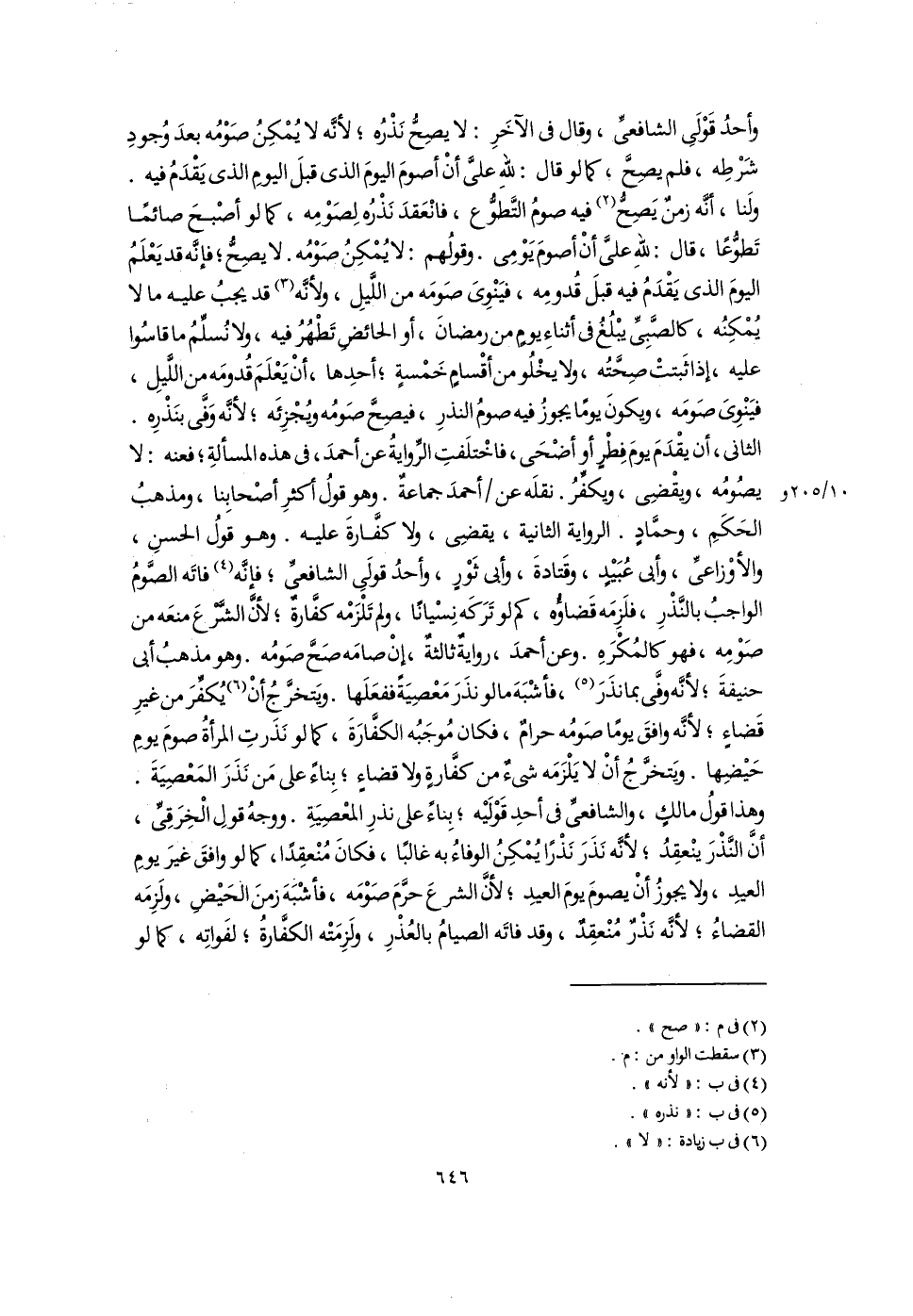 وأحدُ قَوْلَى الشافعىِّ، وقال فى الآخَرِ: لا يصِحُّ نَذْرُه؛ لأنَّه لا يُمْكِنُ صَوْمُه بعدَ وُجودِ شَرْطِه، فلم يصِحَّ، كما لو قال: للَّهِ علىَّ أَنْ أصومَ اليومَ الذى قبلَ اليومِ الذى يَقْدَمُ فيه. ولَنا، أنَّه زمنٌ يَصِحُّ (٢) فيه صومُ التَّطوُّع، فانْعَقدَ نَذْرُه لِصَوْمِه، كما لو أصْبحَ صائمًا تَطوُّعًا، قال: للَّهِ علىَّ أَنْ أصومَ يَوْمِى. وقولُهم: لا يُمْكِنُ صَوْمُه. لا يصِحُّ، فإنَّه قد يَعْلَمُ اليومَ الذى يَقْدَمُ فيه قبلَ قُدومِه، فيَنْوِىَ صَومَه من اللَّيلِ، ولأنَّه (٣) قد يجبُ عليه ما لا يُمْكِنُه، كالصَّبِىِّ يبْلُغُ فى أثناءِ يومٍ من رمضانَ، أو الحائض تَطْهُرُ فيه، ولا نُسلِّمُ ما قاسُوا عليه، إذا ثَبتتْ صِحَّتُه، ولا يخْلُو من أقْسامٍ خَمْسةٍ؛ أحدِها، أَنْ يَعْلَمَ قُدومَه من اللَّيلِ، فيَنْوِىَ صَومَه، ويكونَ يومًا يجوزُ فيه صومُ النذرِ، فيصِحَّ صَومُه ويُجْزِئَه؛ لأنَّه وَفَّى بنَذْرِه. الثانى، أن يقْدَمَ يومَ فِطْرٍ أو أضْحَى، فاخْتلَفتِ الرِّوايةُ عن أحمدَ، فى هذه المسألةِ؛ فعنه: لا يصُومُه، ويقْضِى، ويكفِّرُ. نقلَه عن أحمدَ جماعةٌ. وهو قولُ أكثرِ أصْحابِنا، ومذهبُ الحَكَمِ، وحمَّادٍ. الرواية الثانية، يقضِى، ولا كفَّارةَ عليه. وهو قولُ الحسنِ، والأوْزاعىِّ، وأبى عُبَيْدٍ، وقَتادةَ، وأبى ثَوْرٍ، وأحدُ قولَى الشافعىِّ؛ فإنَّه (٤) فاتَه الصَّومُ الواجبُ بالنَّذْرِ، فلَزِمَه قَضاؤُه، كما لو تَرَكَه نِسْيانًا، ولم تَلْزَمْه كفَّارةٌ؛ لأنَّ الشَّرْعَ منعَه من صَوْمِه، فهو كالمُكْرَهِ. وعن أحمدَ، روايةٌ ثالثةٌ، إن صامَه صَحَّ صَومُه. وهو مذهبُ أبى حنيقةَ؛ لأنَّه وفَّى بما نذَرَ (٥)، فأشْبَهَ ما لو نذَرَ مَعْصِيَةً ففعَلَها. ويَتخرَّجُ أَنْ (٦) يُكفِّرَ من غيرِ قَضاءٍ؛ لأنَّه وافقَ يومًا صَومُه حرامٌ، فكان مُوجَبُه الكفَّارَةَ، كما لو نَذرتِ المرأةُ صومَ يومِ حَيْضِها. ويَتخرَّجُ أَنْ لا يَلْزَمَه شىء من كفَّارةٍ ولا قضاءٍ، بِناءً على مَن نَذَرَ المَعْصِيَةَ. وهذا قولُ مالكٍ، والشافعىِّ فى أحدِ قَوْلَيْه، بِناءً على نذرِ المعْصِيَةِ. ووجهُ قولِ الْخِرَقِىِّ، أَنَّ النَّذْرَ ينْعقِدُ؛ لأنَّه نَذَرَ نَذْرًا يُمْكِنُ الوفاءُ به غالبًا، فكانَ مُنْعقِدًا، كما لو وافقَ غيرَ يومِ العيدِ، ولا يجوزُ أَنْ يصومَ يومَ العيدِ؛ لأنَّ الشَّرْعَ حرَّمَ صَوْمَه، فأشْبَهَ زمنَ الحَيْضِ، ولَزِمَه القضاءُ؛ لأنَّه نَذْرٌ مُنْعقِدٌ، وقد فاتَه الصيامُ بالعُذْرِ، ولَزِمَتْه الكفَّارةُ؛ لفَواتِه، كما لو