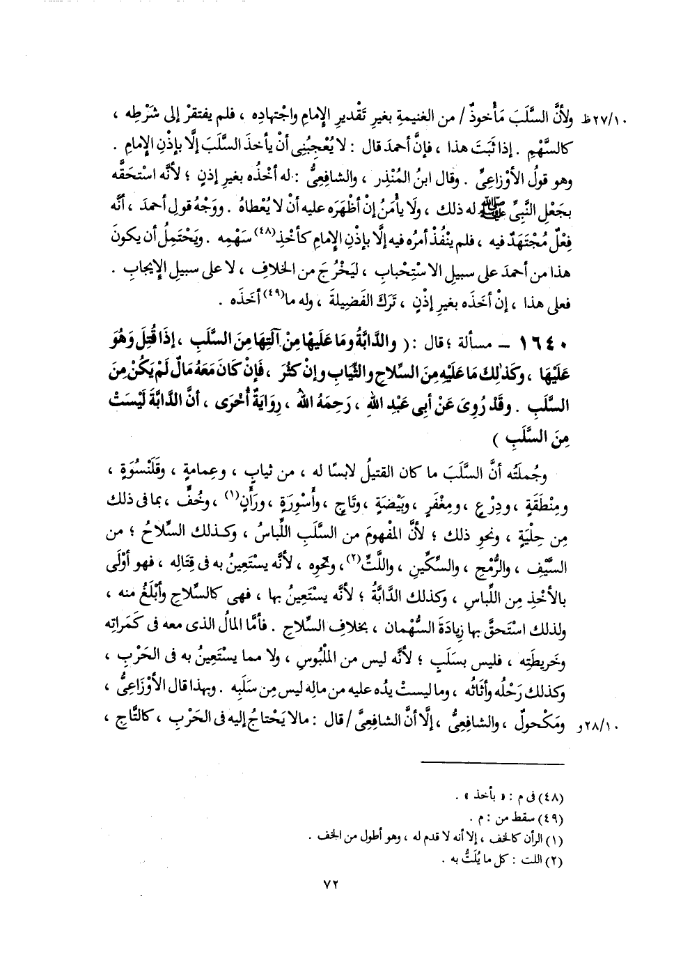 وجُملَتُه أنَّ السَّلَبَ ما كان القتيلُ لابسًا له، من ثيابٍ، وعِمامةٍ، وقَلَنْسُوَةٍ، ومِنْطَقَةٍ، ودِرْعٍ، ومِغْفَرٍ، وبَيْضَةٍ، وتَاجٍ، وأسْوِرَةٍ، ورَأنٍ (١)، وخُفٍّ، بما فى ذلك مِن حِلْيَةٍ، ونحوِ ذلك؛ لأنَّ المفْهومَ من السَّلَبِ اللِّباسُ، وكذلك السِّلاحُ؛ من السَّيْفِ، والرُّمْحِ، والسِّكِّينِ، واللَّتِّ (٢)، ونحْوِه، لأنَّه يسْتَعِينُ به فى قِتَالِه، فهو أوْلَى بالأخْذِ مِن اللِّباسِ، وكذلك الدَّابَّةُ؛ لأنَّه يسْتَعِينُ بها، فهى كالسِّلاحِ وأبْلَغُ منه، ولذلك اسْتَحقَّ بها زِيادَةَ السُّهْمان، بخلافِ السِّلاحِ. فأمَّا المالُ الذى معه فى كَمَراتِه وخَريطَتِه، فليس بسَلَبٍ؛ لأنَّه ليس من الملْبُوسِ، ولا مما يسْتَعِينُ به فى الحَرْبِ، وكذلك رَحْلُه وأثَاثُه، وما ليستْ يدُه عليه من مالِه ليس مِن سَلَبِه. وبهذا قال الأوْزَاعِىُّ، ومَكْحولٌ، والشافِعِىُّ، إلَّا أنَّ الشافِعِىَّ قال: ما لا يَحْتاجُ إليه فى الحَرْبِ، كالتَّاجِ،