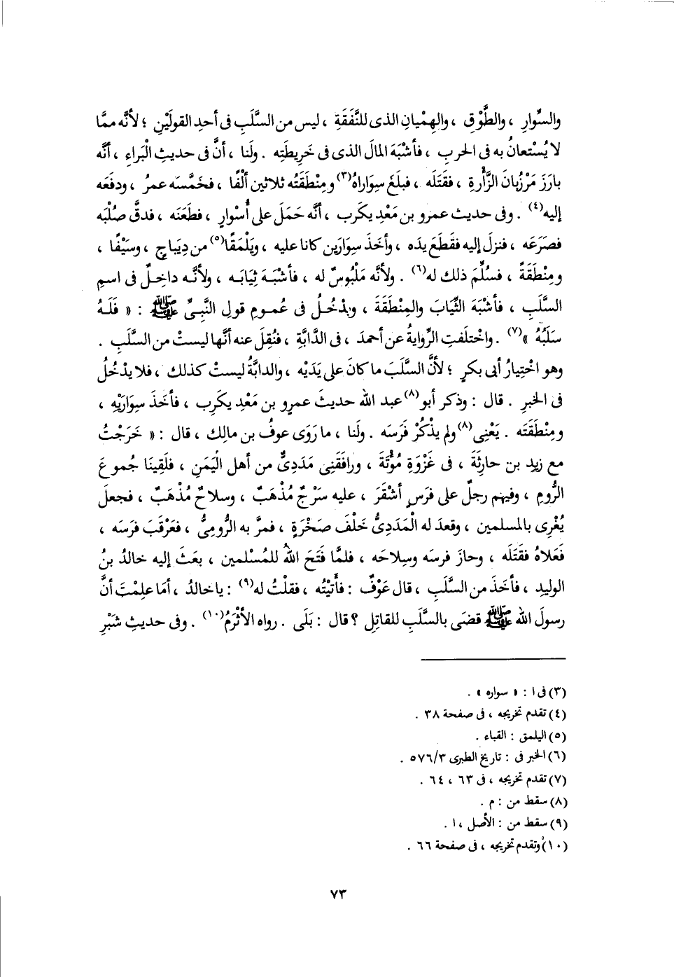 والسِّوارِ، والطَّوْقِ، والهِمْيانِ الذى للنَّفَقَةِ، ليس من السَّلَبِ فى أحدِ القولَيْنِ؛ لأنَّه ممَّا لا يُسْتعانُ به فى الحربِ، فأشْبَهَ المالَ الذى فى خَرِيطَتِه. ولَنا، أنَّ فى حديثِ الْبَراءِ، أنَّه بارَزَ مَرْزُبانَ الزَّأْرةِ، فقَتَلَه، فبلَغَ سِوَاراهُ (٣) ومِنْطَقَتُه ثلاثين ألْفًا، فخَمَّسَه عمرُ، ودفَعَه إليه (٤). وفى حديث عمرو بن مَعْدِ يكَرب، أنَّه حَمَلَ على أَسْوارٍ، فطَعَنَه، فدقَّ صُلْبَه فصَرَعَه، فنزلَ إليه فقَطَعَ يدَه، وأخَذَ سِوَارَين كانا عليه، ويَلْمَقًا (٥) من دِيبَاجٍ، وسَيْفًا، ومِنْطَقَةً، فسُلِّمَ ذلك له (٦). ولأنَّه مَلْبُوسٌ له، فأشْبَهَ ثِيَابَه، ولأنَّه داخِلٌ فى اسمِ السَّلَبِ، فأشْبَهَ الثِّيابَ والمِنْطَقَةَ، ويدْخُلُ فى عُمومِ قولِ النَّبِىِّ -صَلَّى اللهُ عَلَيْهِ وَسَلَّمَ-: "فَلَهُ سَلَبُهُ" (٧). واخْتلَفتِ الرِّوايةُ عن أحمدَ، فى الدَّابَّةِ، فنُقِلَ عنه أنَّها ليستْ من السَّلَبِ. وهو اخْتِيارُ أبى بكرٍ؛ لأنَّ السَّلَبَ ما كانَ على يَدَيْه، والدابَّةُ ليستْ كذلك، فلا يدْخُلُ فى الخبرِ. قال: وذكر أبو (٨) عبد اللَّه حديثَ عمرٍو بن مَعْدِ يكَرِب، فأخَذَ سِوَارَيْهِ، ومِنْطَقَتَه. يَعْنِى (٨) ولم يذْكُرْ فَرَسَه. ولَنا، ما رَوَى عوفُ بن مالِك، قال: "خَرَجْتُ مع زيدِ بن حارِثَةَ، فى غَزْوَةِ مُؤْتَةَ، ورافَقَنِى مَدَدِيٌّ من أهل اليَمَنِ، فلَقِينَا جُموعَ الرُّومِ، وفيهم رجلٌ على فرَسٍ أشْقَرَ، عليه سَرْجٌ مُذْهَبٌ، وسلاحٌ مُذْهَبٌ، فجعلَ يُغْرِى بالمسلمين، وقعدَ له الْمَدَدِىُّ خَلْفَ صَخْرَةٍ، فمرَّ به الرُّومِىُّ، فعَرْقَبَ فرَسَه، فَعَلاهُ فقَتَلَه، وحازَ فرسَه وسِلاحَه، فلما فَتَحَ اللهُ للمُسْلمين، بعَثَ إليه خالدُ بنُ الوليدِ، فأخَذَ من السَّلَبِ، قال عَوْفٌ: فأتيْتُه، فقلْتُ له (٩): يا خالدُ، أمَا علِمْتَ أنَّ رسولَ اللَّه -صَلَّى اللهُ عَلَيْهِ وَسَلَّمَ- قضَى بالسَّلَبِ للقاتِلِ؟ قال: بَلَى. رواه الأثْرَمُ (١٠). وفى حديثِ شَبْرِ