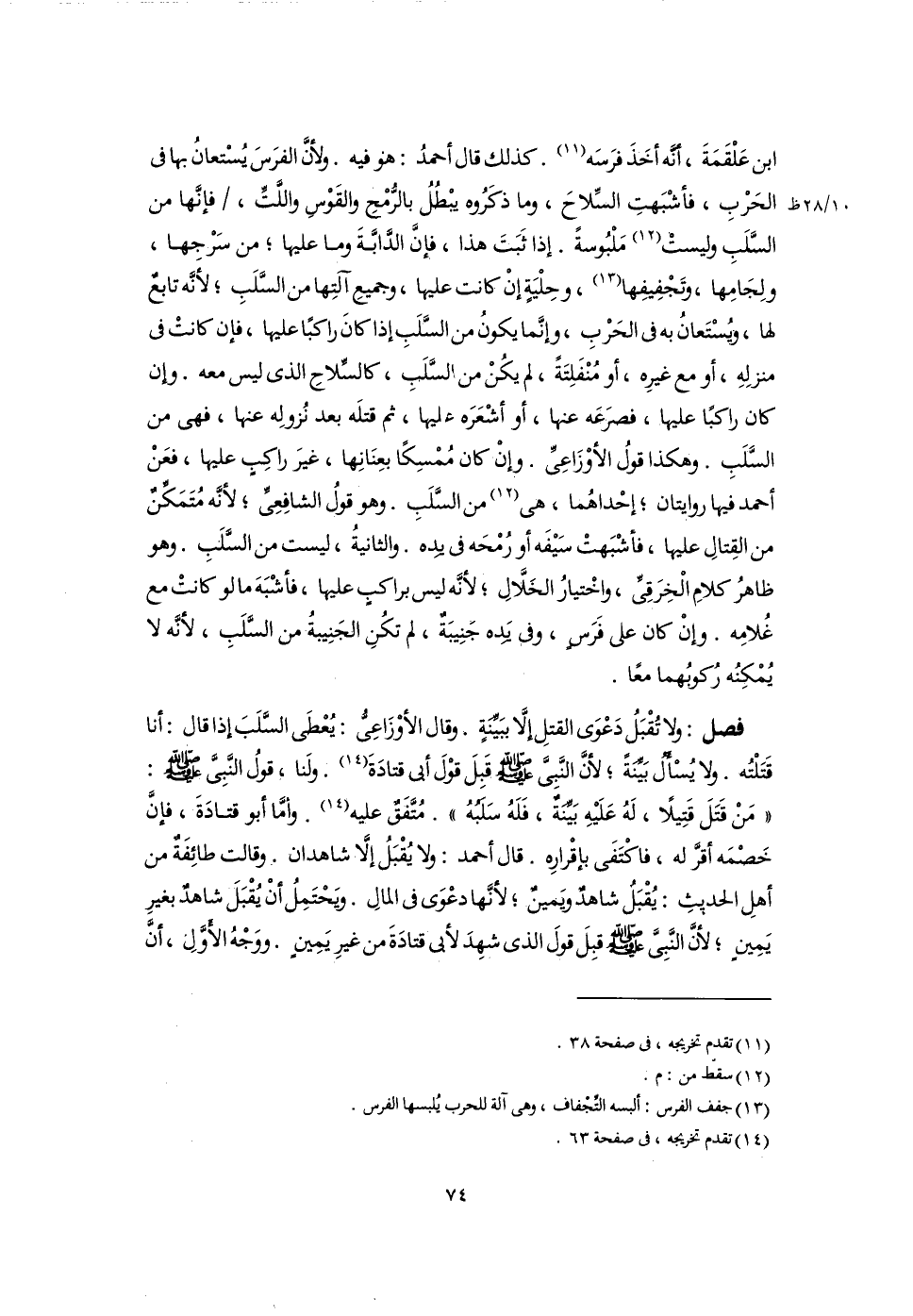 فصل: ولا تُقْبَلُ دَعْوَى القتلِ إلَّا ببَيِّنَةٍ. وقال الأوْزَاعِىُّ: يُعْطَى السَّلَبَ إذا قال: أنا قَتَلْتُه. ولا يُسْأَلُ بَيِّنَةً؛ لأنَّ النَّبِىَّ -صَلَّى اللهُ عَلَيْهِ وَسَلَّمَ- قَبِلَ قوْلَ أبى قتادَةَ (١٤). ولَنا، قولُ النَّبِىَّ -صَلَّى اللهُ عَلَيْهِ وَسَلَّمَ-: "مَنْ قَتَلَ قَتِيلًا، لَهُ عَلَيْهِ بَيِّنَةٌ، فَلَهُ سَلَبُهُ". مُتَّفَقٌ عليه (١٤) وأمَّا أبو قتادَةَ، فإنَّ خَصْمَه أقرَّ له، فاكْتَفَى بإقْرارِه. قال أحمد: ولا يُقْبَلُ إلَّا شاهدان. وقالت طائِفَةٌ من أهلِ الحديثِ: يُقْبَلُ شاهدٌ ويَمينٌ؛ لأنَّها دعْوَى فى المالِ. ويَحْتَمِلُ أنْ يُقْبَلَ شاهدٌ بغيرِ يَمِينٍ؛ لأنَّ النَّبِىَّ -صَلَّى اللهُ عَلَيْهِ وَسَلَّمَ- قبِلَ قولَ الذى شهِدَ لأبى قتادَةَ من غيرِ يَمِينٍ. ووَجْهُ الأوَّلِ، أنَّ