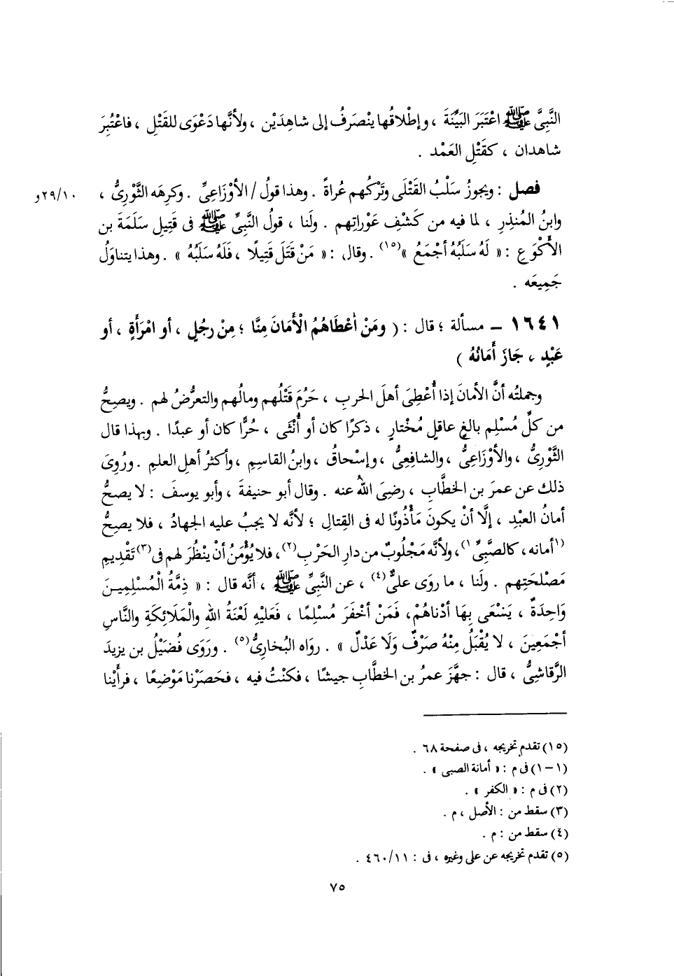 فصل: ويجوزُ سَلْبُ القَتْلَى وَتَرْكُهم عُراةً. وهذا قولُ الأوْزَاعِىِّ. وكرِهَه الثَّوْرِىُّ، وابنُ المُنذِرِ، لما فيه من كَشْفِ عَوْراتِهم. ولَنا، قولُ النَّبِىِّ -صَلَّى اللهُ عَلَيْهِ وَسَلَّمَ- فى قَتِيلِ سَلَمَةَ بن الأَكْوَعِ: "لَهُ سَلَبُهُ أجْمَعُ" (١٥). وقال: "مَنْ قَتَلَ قَتِيلًا، فَلَهُ سَلَبُهُ". وهذا يتناوَلُ جَمِيعَه.