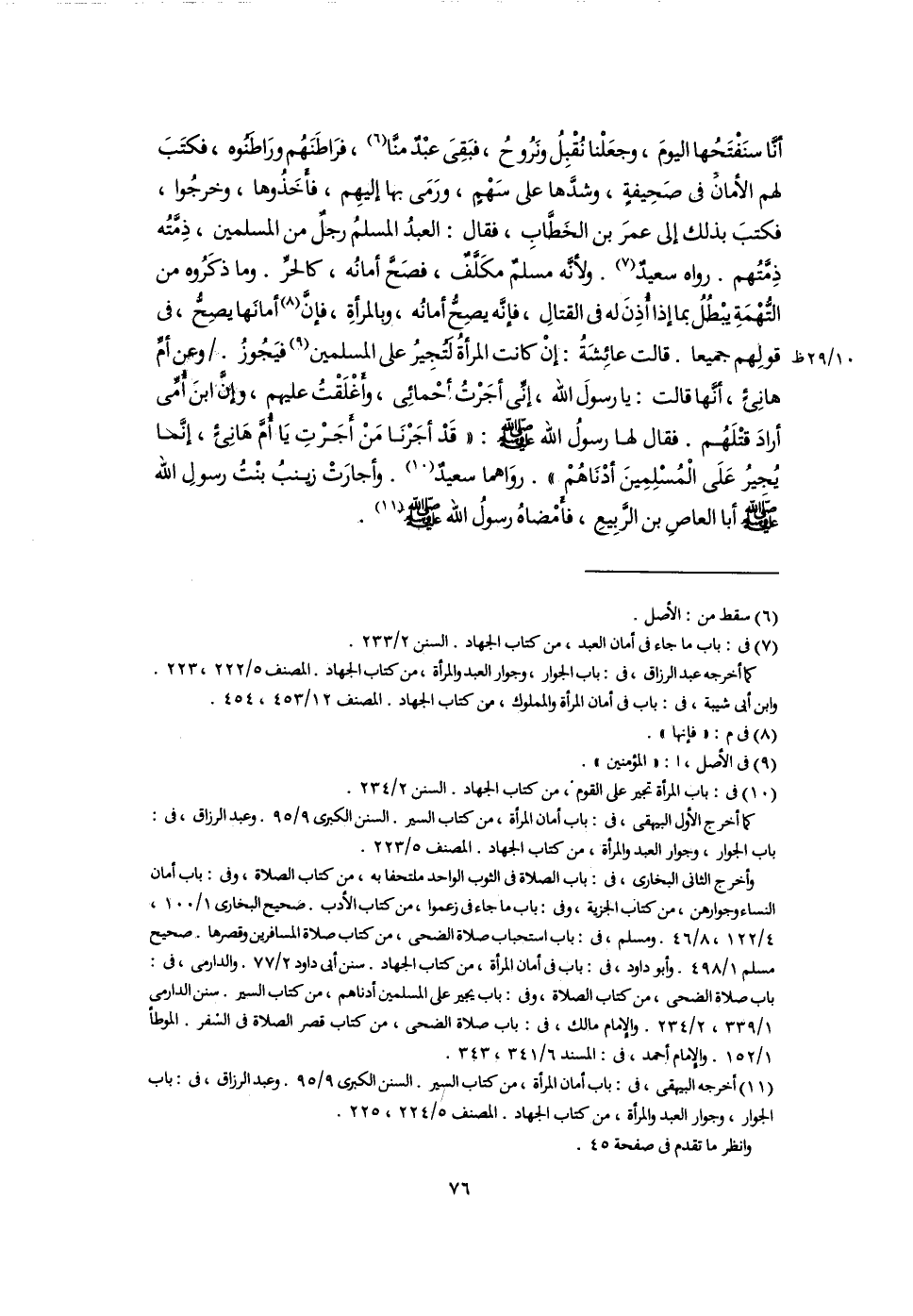 (١١) أخرجه البيهقى، فى: باب أمان المرأة، من كتاب السير. السنن الكبرى ٩/ ٩٥. وعبد الرزاق، فى: باب الجوار، وجوار العبد والمرأة، من كتاب الجهاد. المصنف ٥/ ٢٢٤، ٢٢٥.