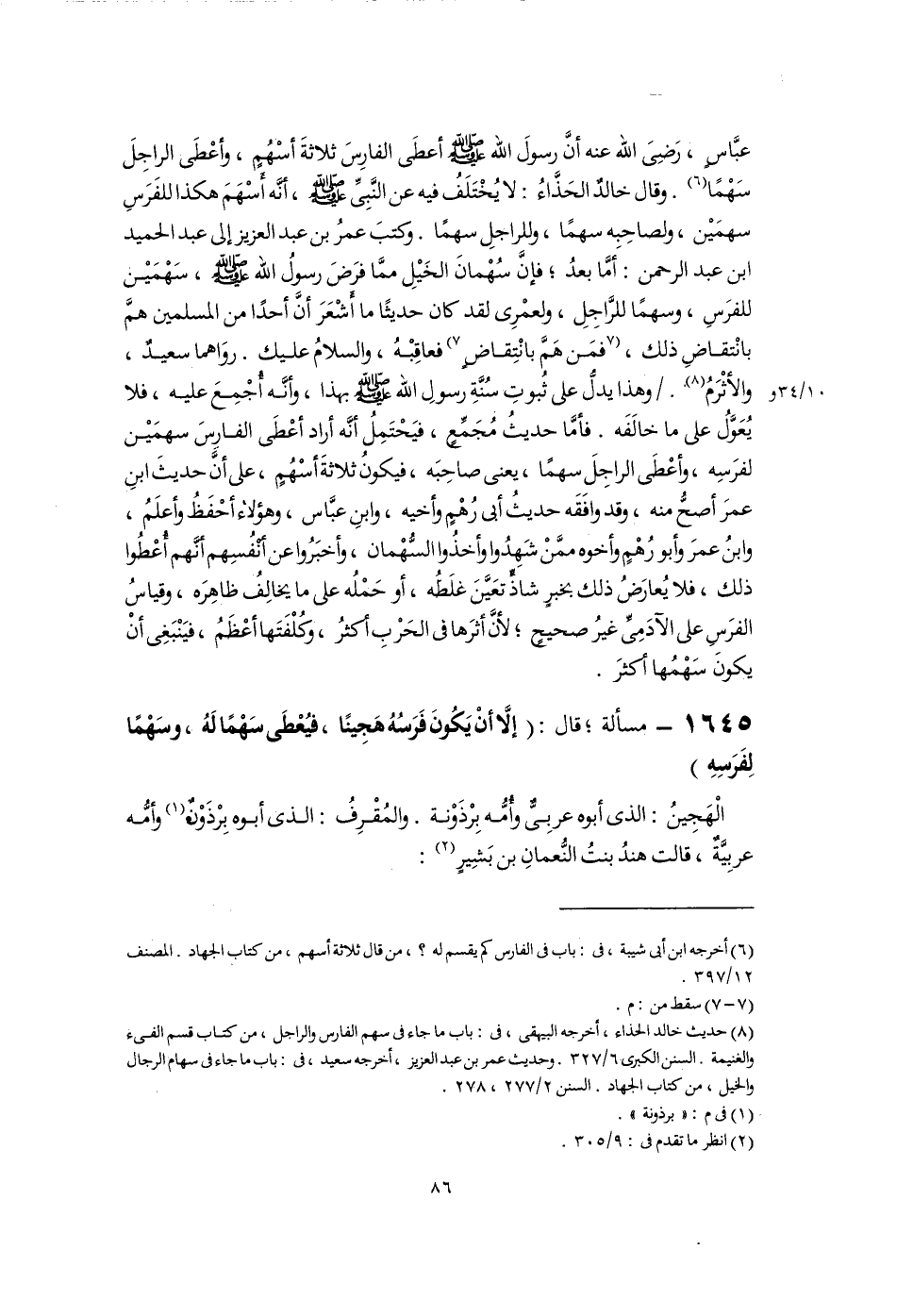 عبَّاسٍ، رَضِىَ اللَّه عنه أنَّ رسولَ اللَّه -صَلَّى اللهُ عَلَيْهِ وَسَلَّمَ- أعطَى الفارِسَ ثلاثةَ أسْهُمٍ، وأعْطَى الراجِلَ سَهْمًا (٦). وقال خالدٌ الحَذَّاءُ: لا يُخْتَلَفُ فيه عن النَّبِىِّ -صَلَّى اللهُ عَلَيْهِ وَسَلَّمَ-، أنَّه أَسْهَمَ هكذا للفَرَسِ سهمَيْن، ولصاحِبِه سهمًا، وللراجلِ سهمًا. كتبَ عمرُ بن عبد العزيز إلى عبد الحميد ابن عبد الرحمن: أَمَّا بعدُ؛ فإنَّ سُهْمانَ الخَيْلِ ممَّا فرَضَ رسولُ اللَّه -صَلَّى اللهُ عَلَيْهِ وَسَلَّمَ-، سَهْمَيْن للفرَسِ، وسهمًا للرَّاجِلِ، ولعمْرِى لقد كان حديثًا ما أَشْعرَ أنَّ أحدًا من المسلمين همَّ بانْتقاضِ ذلك، [فمَن هَمَّ بانْتِقاضٍ] (٧) فعاقِبْهُ، والسلامُ عليك. روَاهما سعيدٌ، والأثْرَمُ (٨). وهذا يدلُّ على ثُبوتِ سُنَّةِ رسولِ اللَّه -صَلَّى اللهُ عَلَيْهِ وَسَلَّمَ- بهذا، وأنَّه أُجْمِعَ عليه، فلا يُعَوَّلُ على ما خالَفَه. فأمَّا حديثُ مُجَمِّعٍ، فيَحْتَمِلُ أنَّه أراد أعْطَى الفارِسَ سهمَيْن لفرَسِه، وأعْطَى الراجِلَ سهمًا، يعنى صاحِبَه، فيكونُ ثلاثةَ أسْهُمٍ، على أنَّ حديثَ ابنِ عمرَ أصحُّ منه، وقد وافَقَه حديثُ أبى رُهْمٍ وأخيه، وابنِ عبَّاس، وهؤلاء أحْفَظُ وأعلَمُ، وابنُ عمرَ وأبو رُهْمٍ وأخوه ممَّنْ شَهِدُوا وأخذُوا السُّهْمان، وأخبَرُوا عن أنْفُسِهم أنَّهم أُعْطُوا ذلك، فلا يُعارَضُ ذلك بخبرٍ شاذٍّ تعَيَّنَ غلَطُه، أو حَمْلُه على ما يخالِفُ ظاهِرَه، وقياسُ الفرَسِ على الآدَمِىِّ غيرُ صحيحٍ؛ لأنَّ أثرَها فى الحَرْبِ أكثرُ، وكُلْفَتَها أعْظَمُ، فيَنْبَغِى أنْ يكونَ سَهْمُها أكثرَ.