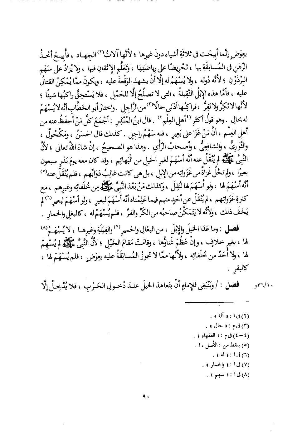 فصل: وما عَدَا الخيلَ والإبلَ، من البغَالِ والحميرِ (٧) والفِيَلَةِ وغيرِها، لا يُسْهَمُ (٨) لها، بغيرِ خلافٍ، وإنْ عَظُمَ غَناؤُها، وقامَتْ مَقامَ الخَيْلِ؛ لأنَّ النَّبِىَّ -صَلَّى اللهُ عَلَيْهِ وَسَلَّمَ- لم يُسْهِمْ لها، ولا أَحَدٌ من خُلَفائِه، ولأنَّها ممَّا لا تجوزُ المُسابَقَةُ عليه بعِوَضٍ، فلم يُسْهَمْ لها، كالبقرِ.
