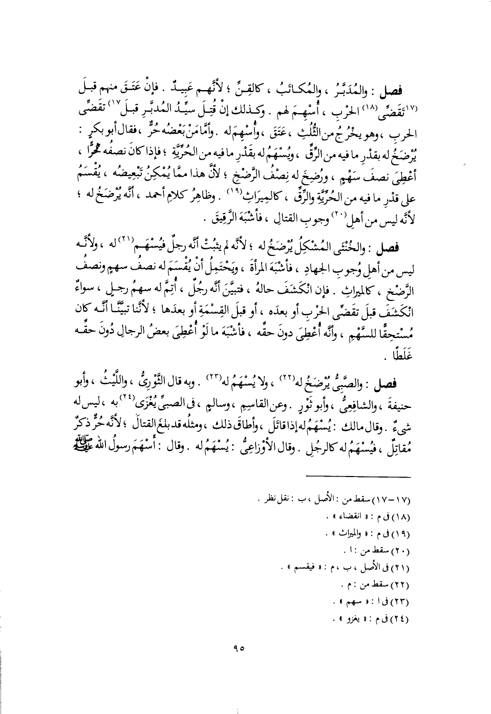 فصل: والمُدَبَّرُ، والمُكاتَبُ، كالقِنِّ؛ لأنَّهم عَبِيدٌ. فإنْ عَتَقَ منهم قبلَ [تَقَضِّى (١٧) الحرْبِ، أُسْهِمَ لهم. وكذلك إنْ قُتِلَ سيِّدُ المُدبَّرِ قبلَ] (١٨) تقَضِّى الحربِ، وهو يخْرُجُ من الثُّلُثِ، عَتَقَ، وأُسْهِمَ له. وأمَّا مَنْ بَعْضُه حُرٌّ، فقال أبو بُكَرٍ: يُرْضَخُ له بقدْرِ ما فيه من الرِّقِّ، ويُسْهَمُ له بقَدْرِ ما فيه من الحُرِّيَّةِ؛ فإذا كانَ نصفُه حُرًّا، أُعْطِىَ نصفَ سَهْمٍ، ورُضِخَ له نِصْفُ الرَّضْخِ؛ لأنَّ هذا ممَّا يُمْكِنُ تَبْعِيضُه، يُقْسَمُ على قدْرِ ما فيه من الحُرِّيَّةِ والرِّقِّ، كالمِيرَاثِ (١٩). وظاهِرُ كلامِ أحمد، أنَّه يُرْضَخُ له؛ لأنَّه ليس من أهلِ (٢٠) وجوبِ القتالِ، فأشْبَهَ الرَّقِيقَ.