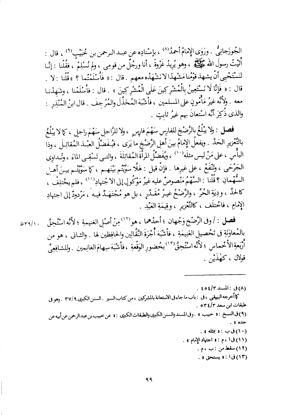 الجُوزَجانِىُّ. ورَوَى الإِمامُ أحمدُ (٨)، بإسْنادِه عن عبد الرحمن بن خُبَيْبٍ (٩)، قال: أَتَيْتُ رسولَ اللَّه -صَلَّى اللهُ عَلَيْهِ وَسَلَّمَ-، وهو يُرِيدُ غَزْوةً، أنا ورجُلٌ من قومِى، ولم نُسْلِمْ، فقُلْنا: إنَّا لنَسْتَحْيِى أنْ يشهدَ قوْمُنا مَشْهدًا لا نَشْهَدُه معهم. قال: "فَأَسْلَمْتُما؟ " قُلْنا: لا. قال: "فَإنَّا لَا نَسْتَعِينُ بِالْمُشْرِكِينَ عَلَى الْمُشْرِكِينَ". قال: فأَسْلَمْنا، وشَهِدْنا معه. ولأنَّه غيرُ مَأمُونٍ على المسلمين، فأشْبَهَ المُخَذِّلَ والمُرْجِفَ". قال ابنُ المُنْذِرِ: والذى ذُكِرَ أنَّه اسْتعانَ بهم غيرُ ثابِتٍ.