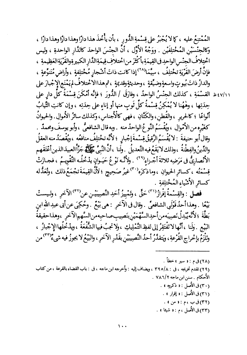فصل: والقِسْمةُ إفْرازُ (٣١) حَقٍّ، وتَمْيِيزُ أحَدِ النَّصيْبَيْنِ عن (٣٢) الآخَرِ، وليستْ بَيْعًا. وهذا أحدُ قَوْلَىِ الشافعيِّ. وقال في الآخَرِ: هى بَيْعٌ. وحُكِىَ عن أبي عبدِ اللهِ ابنِ بَطَّةَ؛ لأَنَّه يُبْدِلُ نَصِيبَه من أحدِ السَّهْمَيْنِ بنَصِيبِ صاحبِه من السَّهمِ الآخَرِ، وهذا حقيقةُ البَيْعِ. ولَنا، أنَّها لا تَفْتَقِرُ إلى لفظِ التَّمْلِيكِ، ولا تجبُ فيها الشُّفْعَةُ، ويدْخُلُها الإجْبارُ، وتَلْزَمُ بإخْراجِ القُرْعةِ، ويَتقدَّرُ أحدُ النَّصِيبَيْنِ بقَدْرِ الآخَرِ، والبَيْعُ لا يجوزُ فيه شىءٌ (٣٣) من