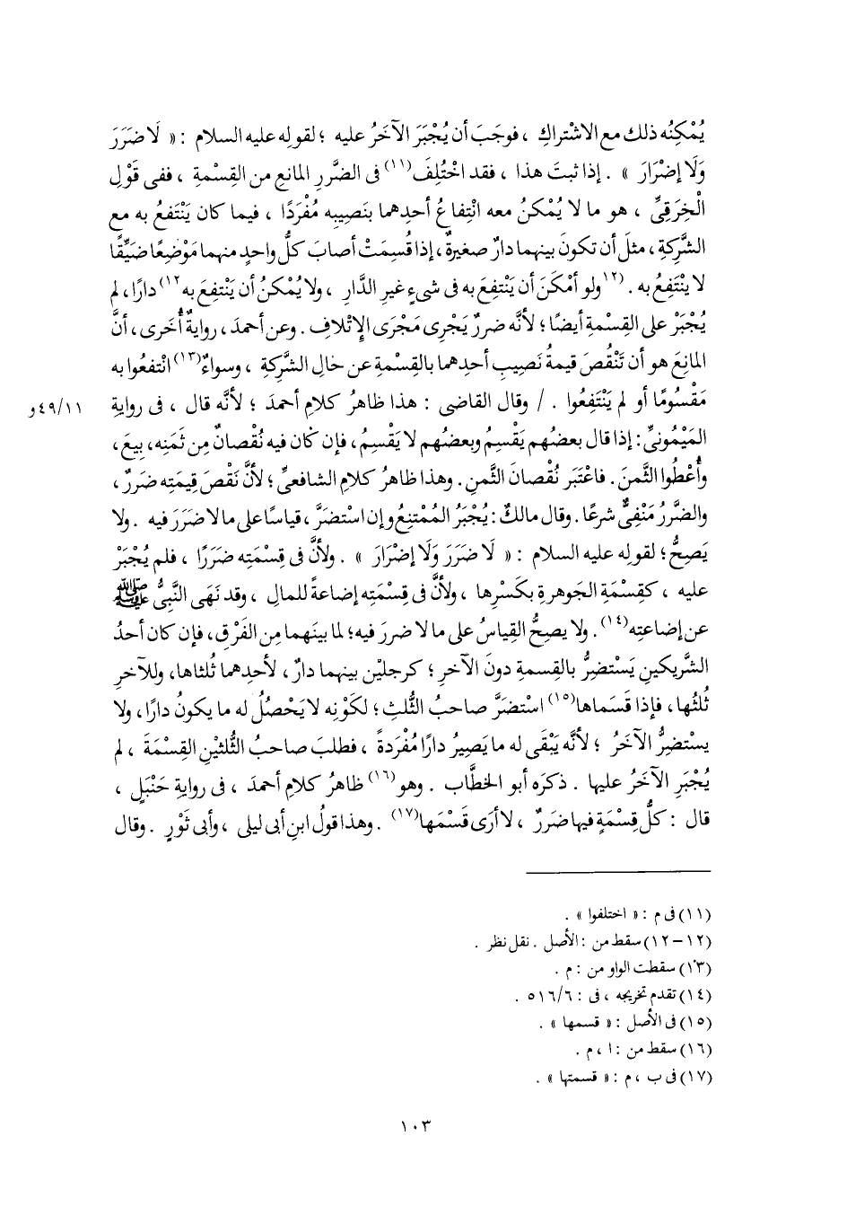 يُمْكِنُه ذلك مع الاشْتراكِ، فوجَبَ أن يُجْبَرَ الآخَرُ عليه؛ لقولِه عليه السلام: "لَا ضَرَرَ وَلَا إضْرَارَ". إذا ثبتَ هذا، فقد اخْتُلِفَ (١١) في الضَّررِ المانعِ من القِسْمةِ، ففى قَوْلِ الْخِرَقِيِّ، هو ما لا يُمْكنُ معه انْتِفاعُ أحدِهما بنَصِيبِه مُفْرَدًا، فيما كان يَنْتَفعُ به مع الشَّرِكةِ، مثلَ أن تكونَ بينهما دارٌ صغيرةٌ، إذا قُسِمَتْ أصابَ كلُّ واحدٍ منهما مَوْضِعًا ضَيِّقًا لا ينْتَفِعُ به. [ولو أمْكَنَ أن يَنْتفِعَ به في شىءٍ غيرِ الدَّارِ، ولا يُمْكنُ أن يَنْتفِعَ به] (١٢) دارًا، لم يُجْبَرْ على القِسْمةِ أيضًا؛ لأنَّه ضررٌ يَجْرِى مَجْرَى الإتْلافِ. وعن أحمدَ، روايةٌ أُخرَى، أنَّ المانِعَ هو أن تَنْقُصَ قيمةُ نَصِيبِ أحدِهما بالقِسْمةِ عن حالِ الشَّرِكةِ، وسواءٌ (١٣) انْتفعُوا به مَقْسُومًا أو لم يَنْتَفِعُوا. وقال القاضي: هذا ظاهرُ كلامِ أحمدَ؛ لأنَّه قال، في روايةِ المَيْمُونىِّ: إذا قال بعضُهم يَقْسِمُ وبعضُهم لا يَقْسِمُ، فإن كان فيه نُقْصانٌ مِن ثَمَنِه، بِيعَ، وأُعْطُوا الثَّمنَ. فاعْتَبَر نُقْصانَ الثَّمنِ. وهذا ظاهرُ كلامِ الشافعيِّ؛ لأنَّ نَقْصَ قِيمَتِه ضَررٌ، والضَّررُ مَنْفِيٌّ شرعًا. وقال مالكٌ: يُجْبَرُ المُمْتنِعُ وإن اسْتضَرَّ، قياسًا على ما لا ضَرَرَ فيه. ولا يَصِحُّ؛ لقولِه عليه السلام: "لَا ضَرَرَ وَلَا إضْرَارَ". ولأنَّ في قِسْمَتِه ضَرَرًا، فلم يُجْبَرْ عليه، كقِسْمَةِ الجَوهرةِ بكَسْرِها، ولأنَّ في قِسْمَتِه إضاعةً للمالِ، وقد نَهَى النَّبِىُّ -صَلَّى اللهُ عَلَيْهِ وَسَلَّمَ- عن إضاعتِه (١٤). ولا يصِحُّ القِياسُ على ما لا ضررَ فيه؛ لما بينَهما مِن الفَرْقِ، فإن كان أحدُ الشَّريكينِ يَسْتضِرُّ بالقِسمةِ دونَ الآخرِ؛ كرجليْن بينهما دارٌ، لأحدِهما ثُلثاها، وللآخرِ ثُلثُها، فإذا قَسَماها (١٥) اسْتضَرَّ صاحبُ الثُّلثِ؛ لكَوْنِه لا يَحْصُلُ له ما يكونُ دارًا، ولا يسْتضِرُّ الآخَرُ؛ لأنَّه يَبْقَى له ما يَصِيرُ دارًا مُفْرَدةً، فطلبَ صاحبُ الثُّلثينِ القِسْمَةَ، لم يُجْبَرِ الآخَرُ عليها. ذكرَه أبو الخطَّاب. وهو (١٦) ظاهرُ كلامِ أحمدَ، في روايةِ حَنْبَلٍ، قال: كلُّ قِسْمَةٍ فيها ضَررٌ، لا أرَى قَسْمَها (١٧). وهذا قولُ ابنِ أبى ليلى، وأبى ثَوْرٍ. وقال
